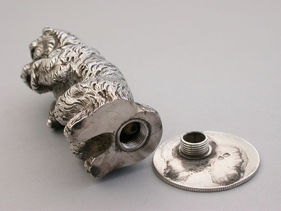 An extremely rare Victorian cast silver novelty Scent Atomiser made in the form of an excited terrier, sitting up on his haunches in an appealing begging pose, with coloured glass eyes, a circular screw-off base and a button at the back of his head which, when depressed repeatedly, sprays scent, most imaginatively through the act of micturation (or peeing).