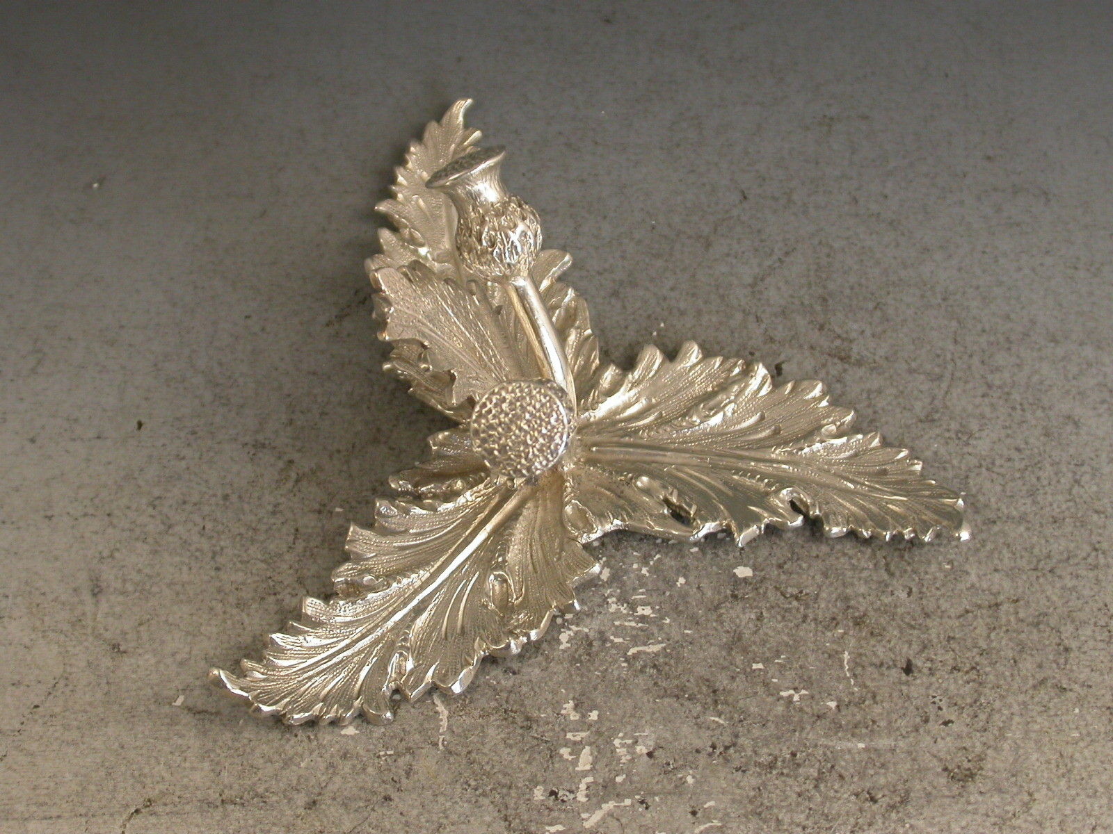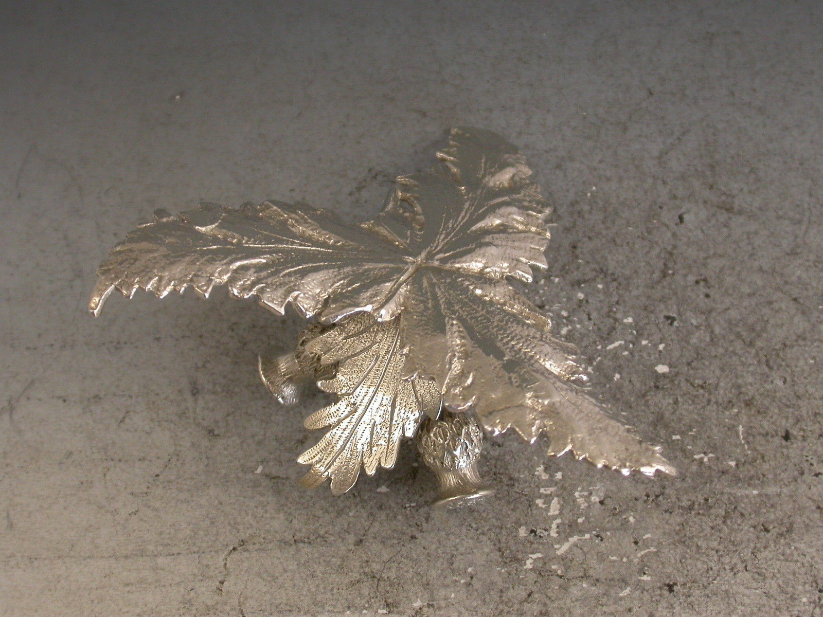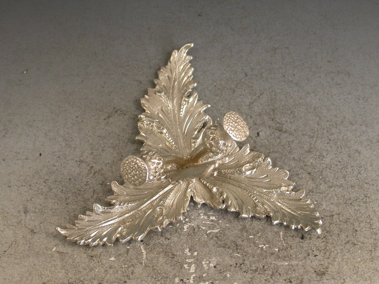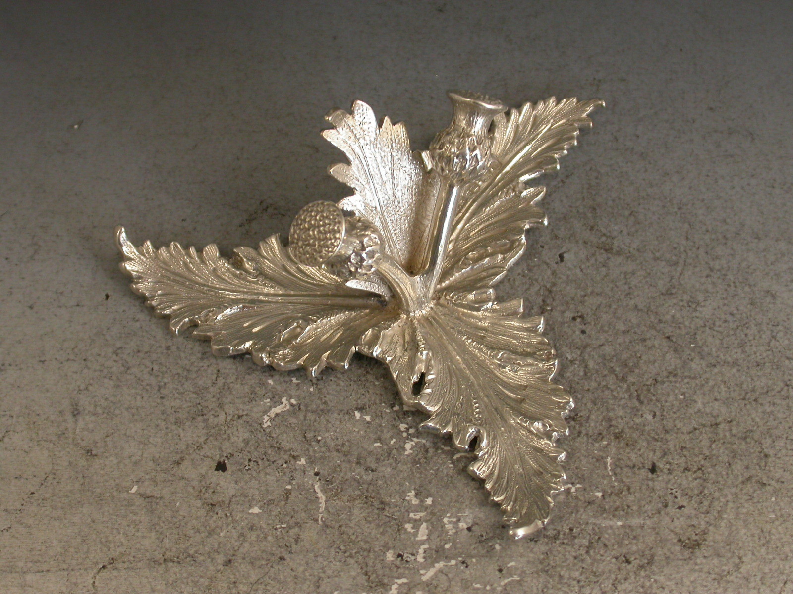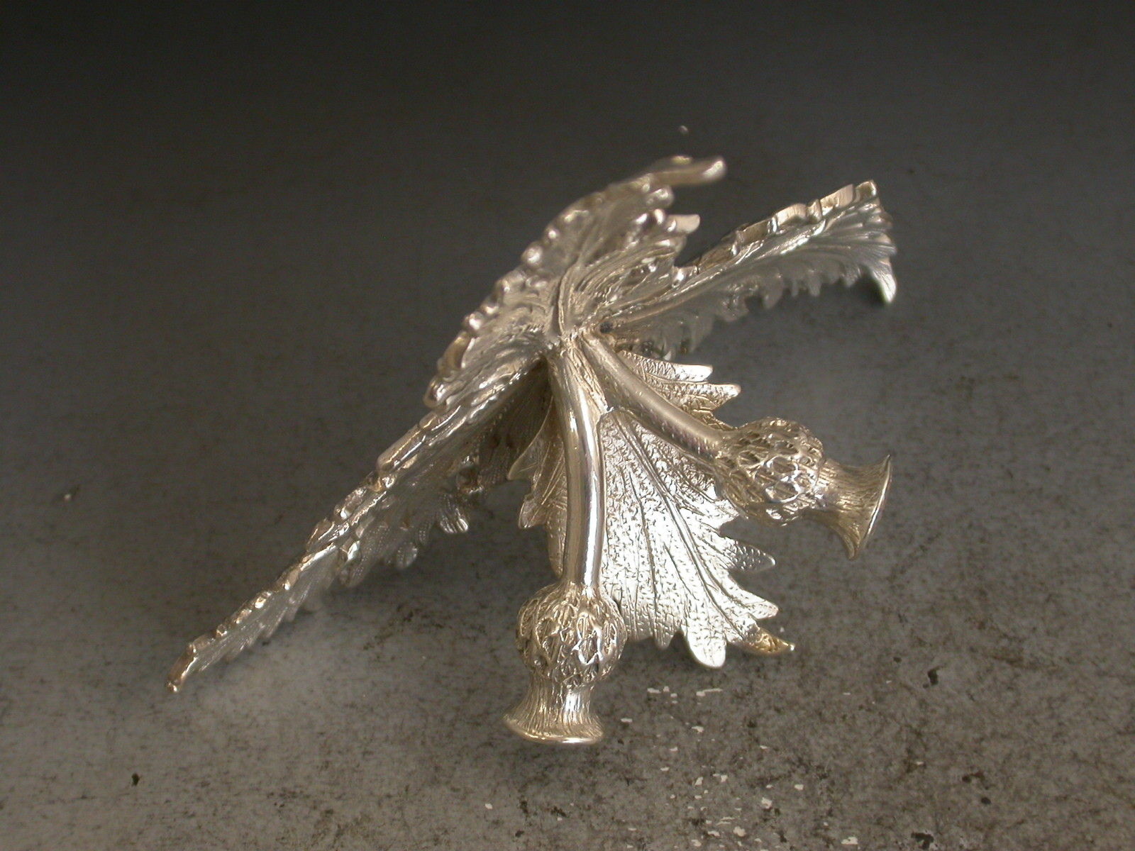 A Victorian cast silver Menu Holder formed from two Thistle heads with three conjoined leaves forming the base.