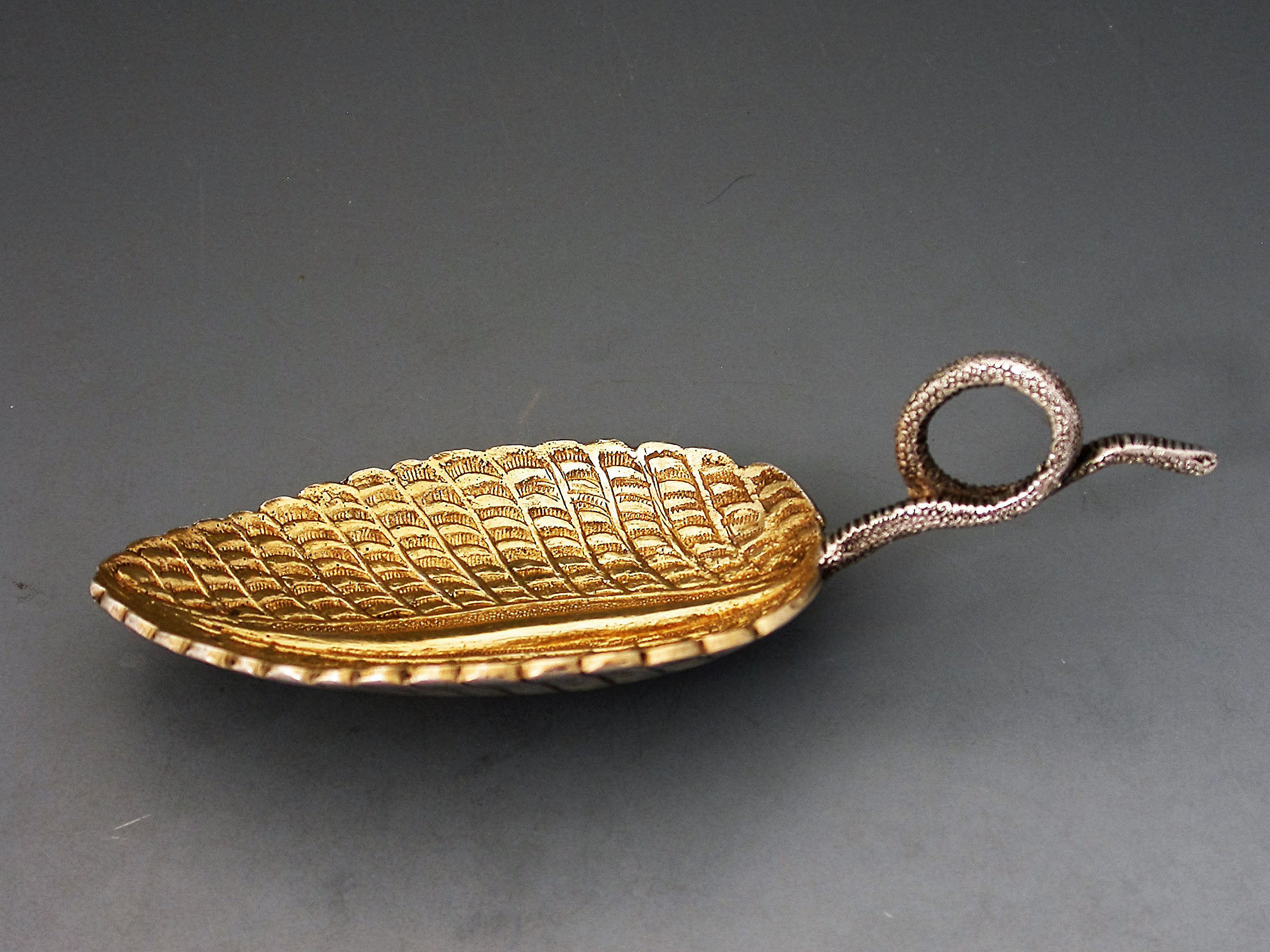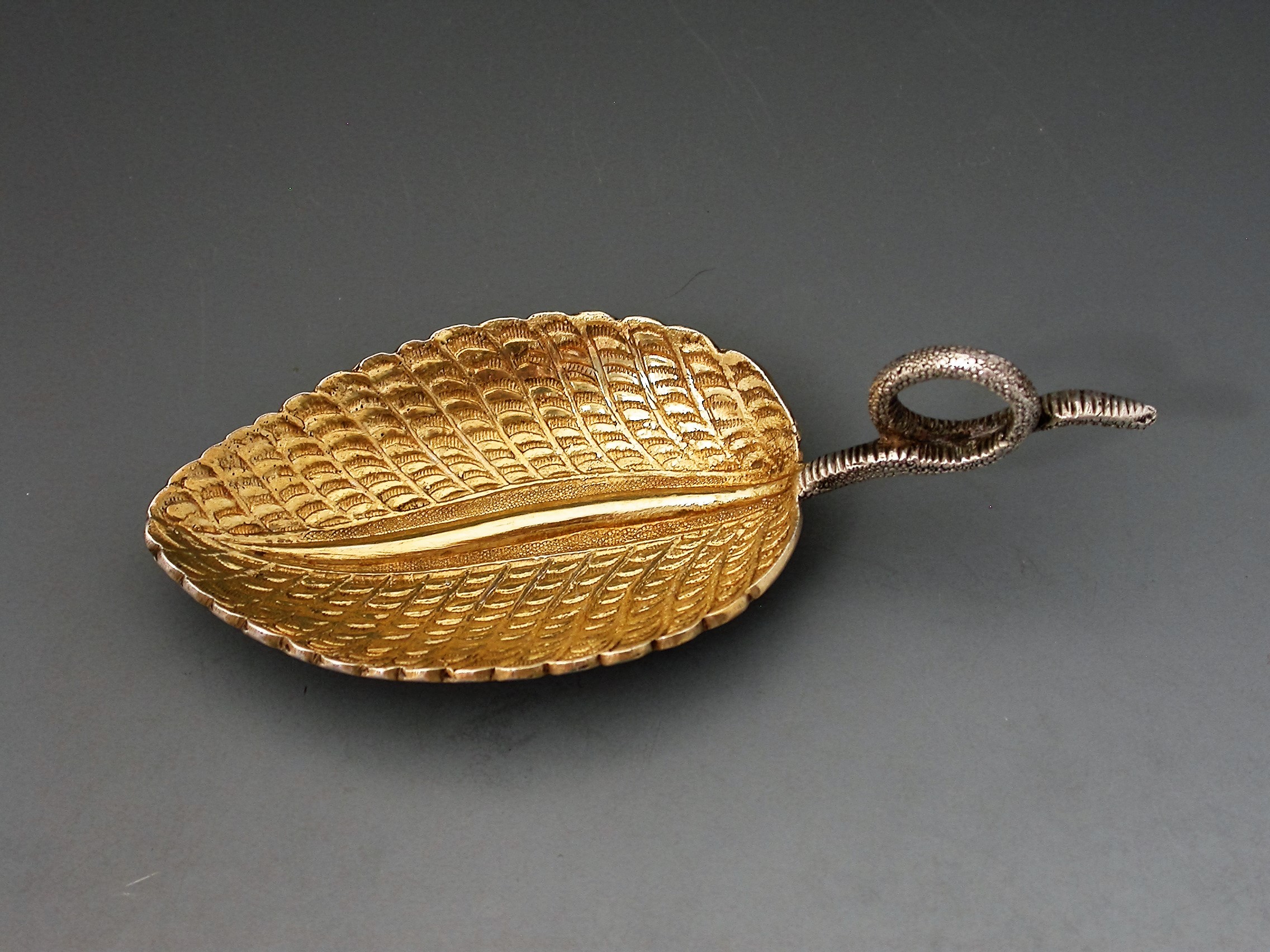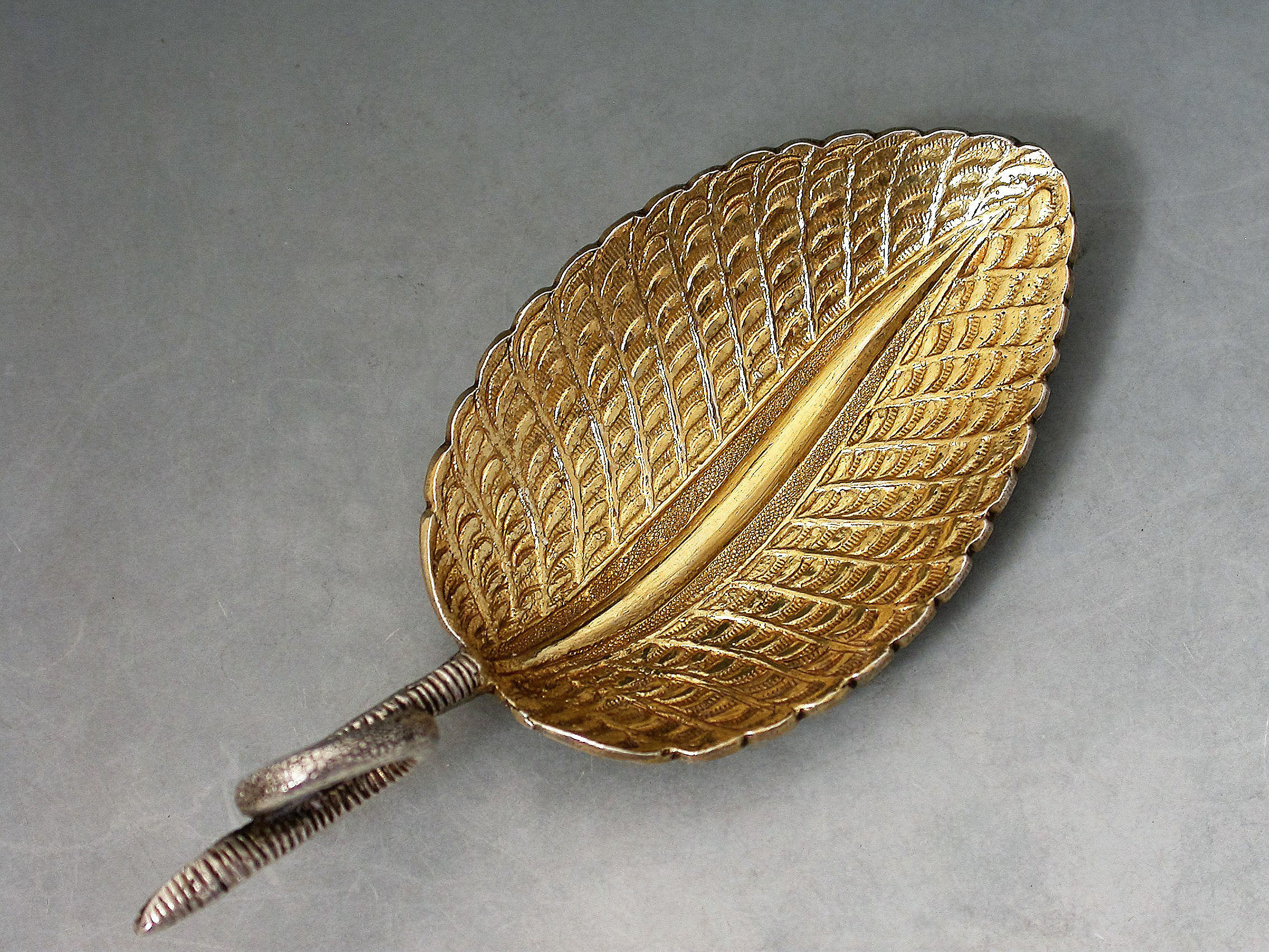 A fine quality Victorian cast silver Caddy Spoon, made in the form of veined tea leaf, with silver gilt bowl and twisted tendril handle.