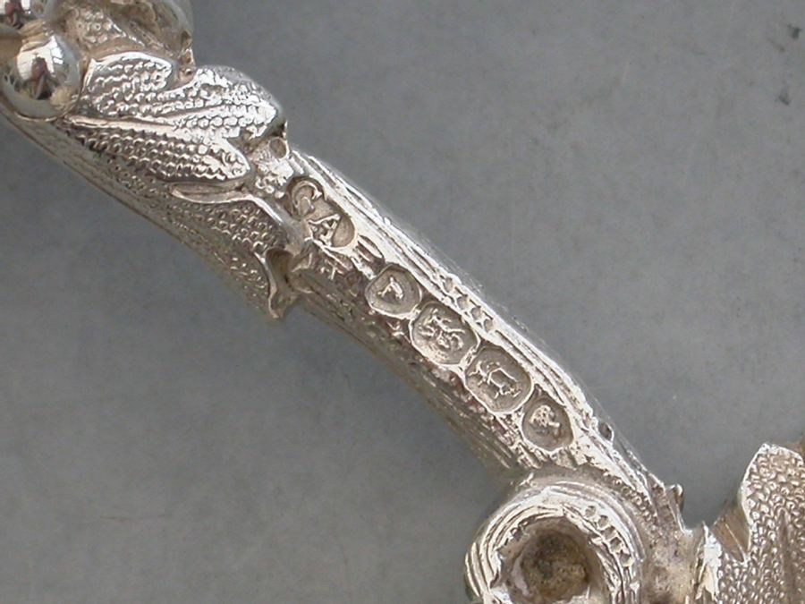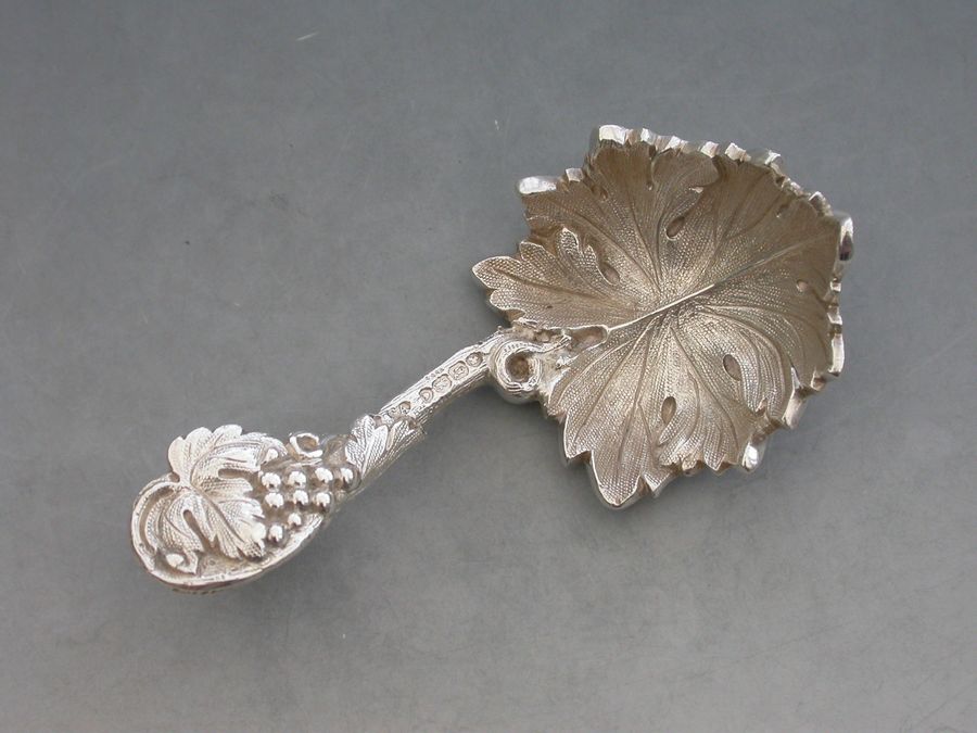 A fine quality Victorian cast silver Caddy Spoon, the bowl formed as a concave vine leaf, the handle as a vine tendrill with leaves and a bunch of grapes.