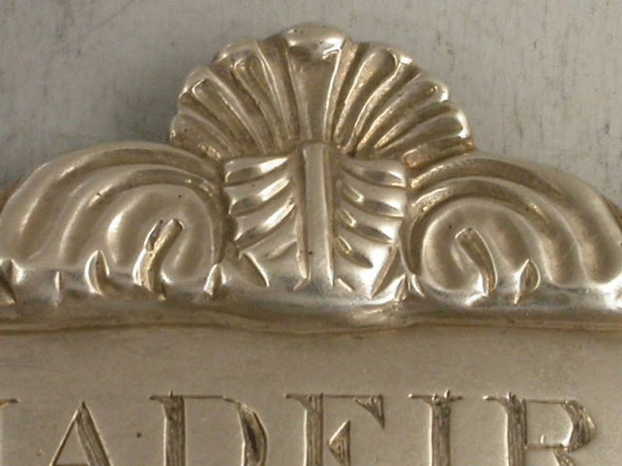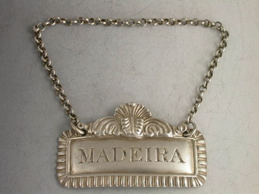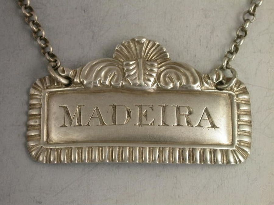 A good Victorian cast silver Wine Label of rectangular form with gadrooned border and shell and palm leaf surmount, incised for MADEIRA.