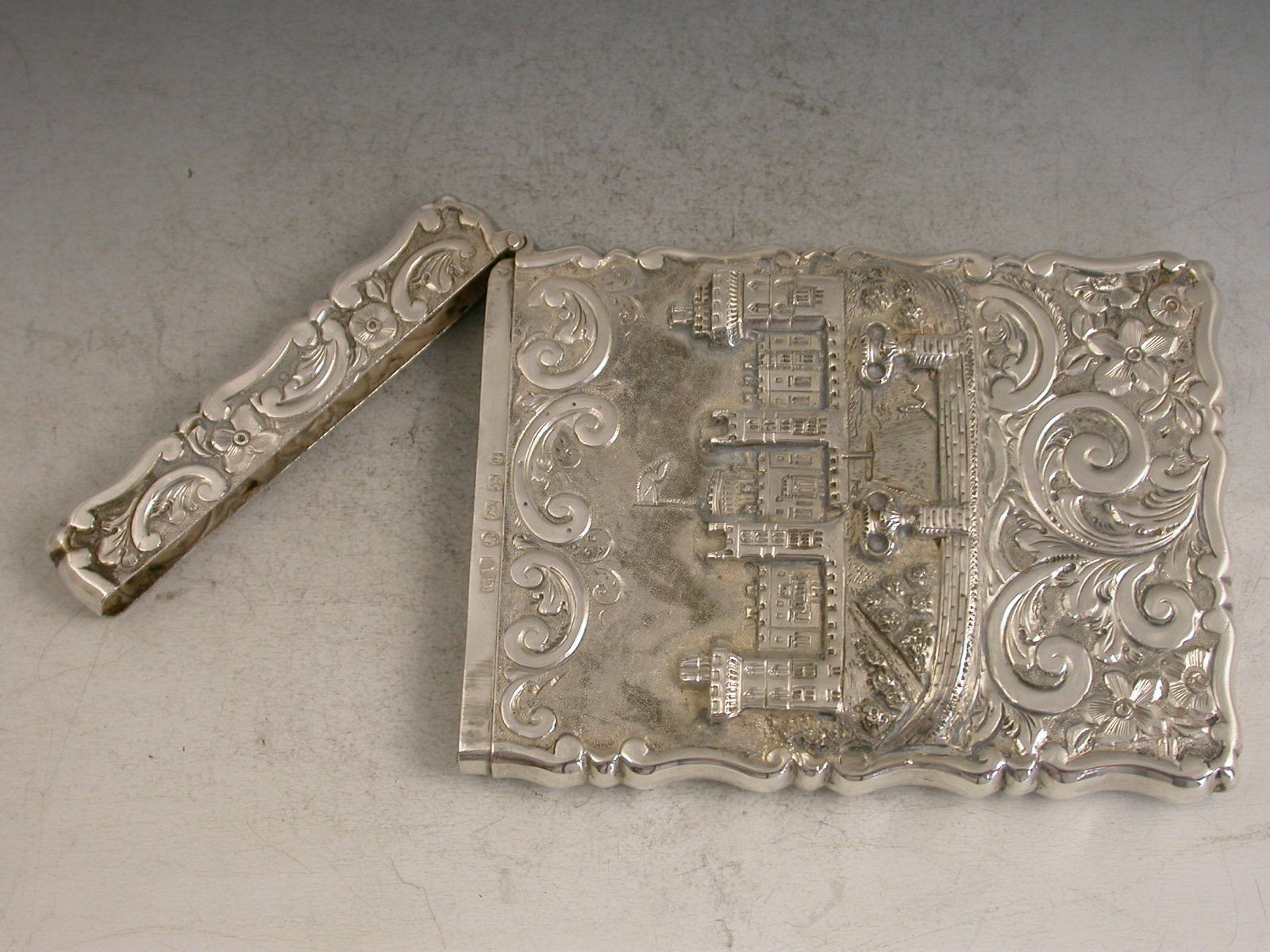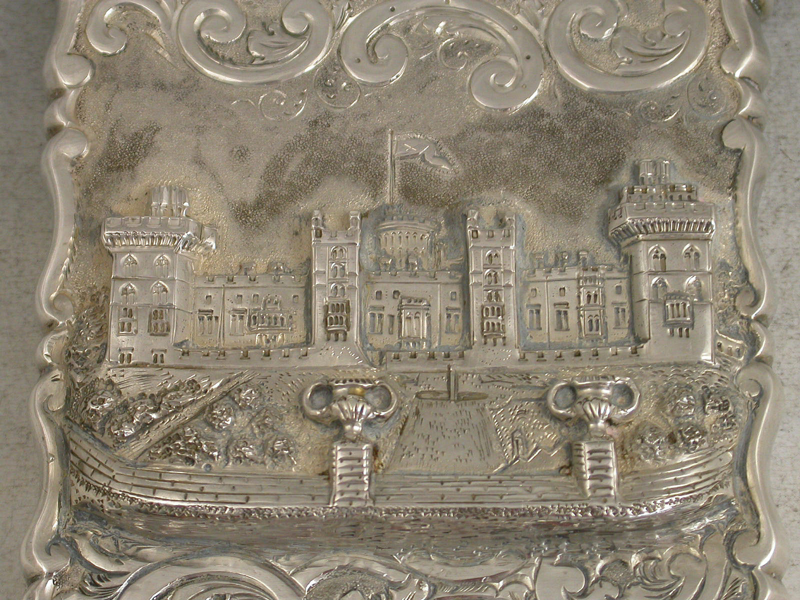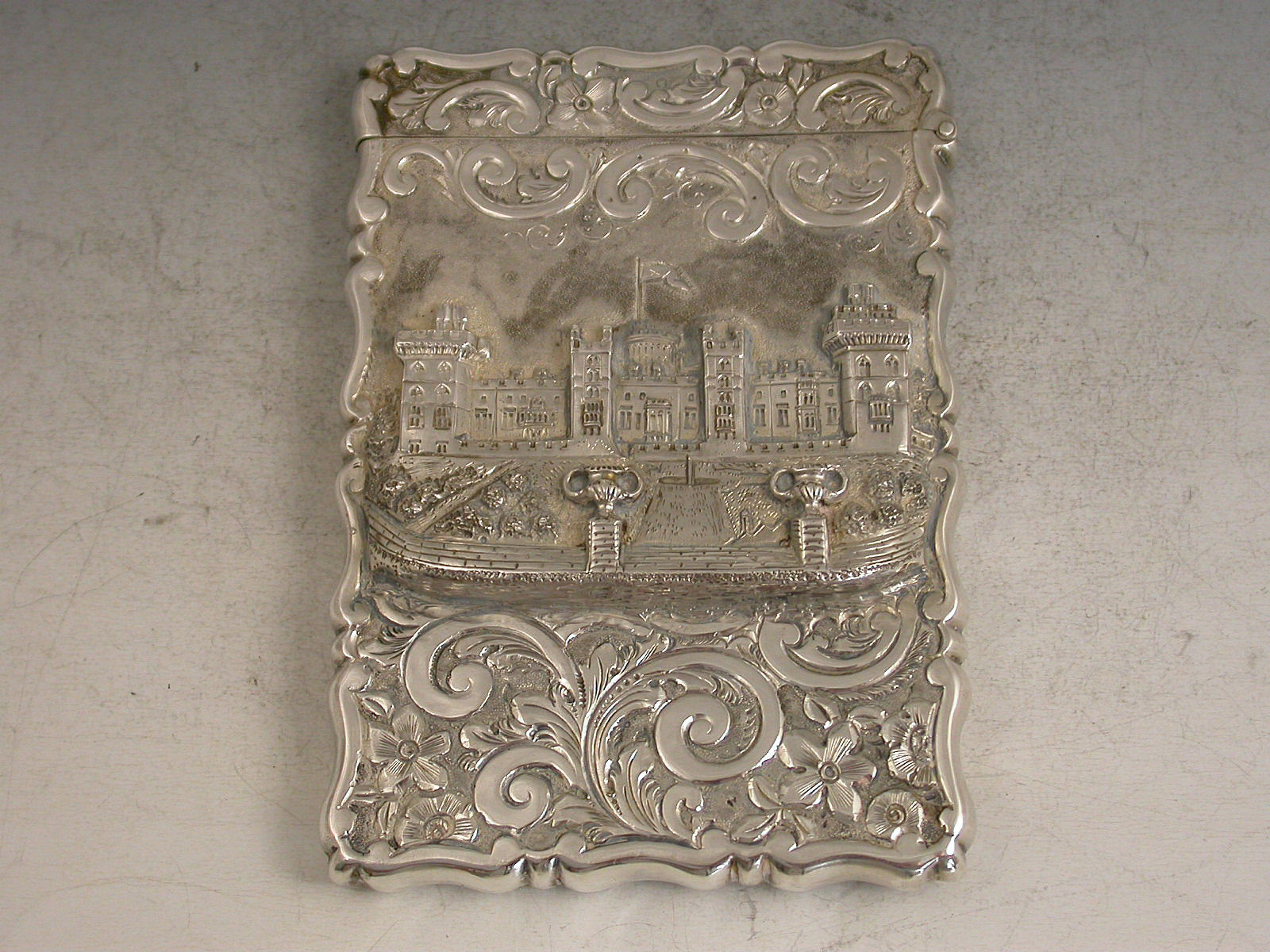 A good Victorian silver 'Castle Top' Card Case of shaped rectangular form with chased and embossed foliate scroll decoration. The front with a depiction of the east terrace of Windsor Castle in high relief. The reverse with a shield shaped cartouche engraved with initials.