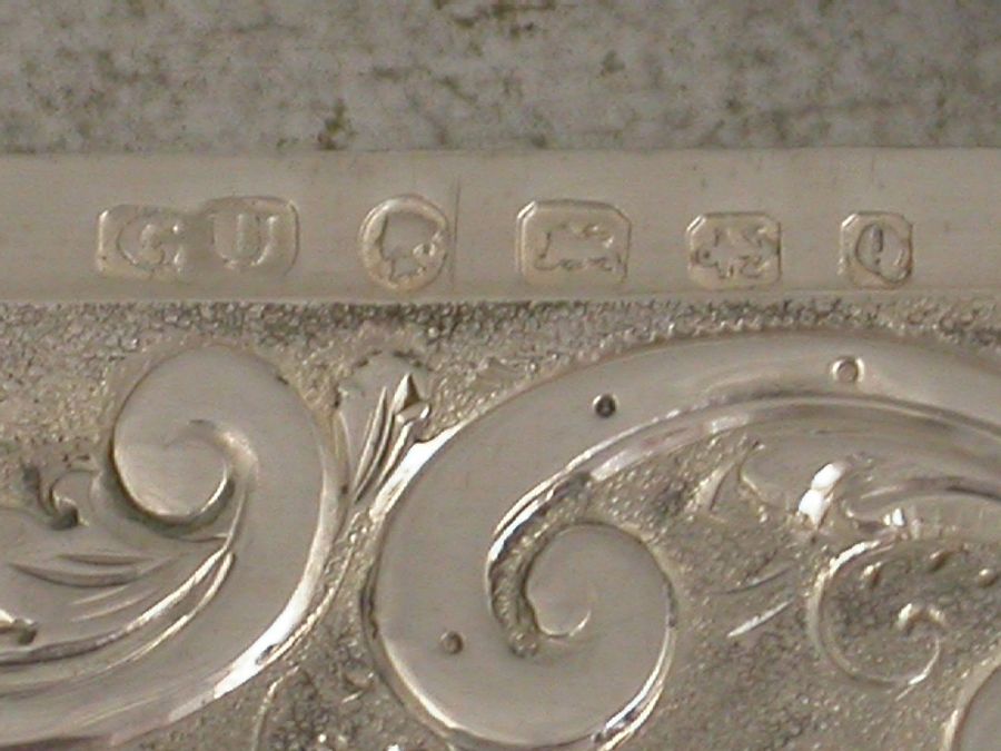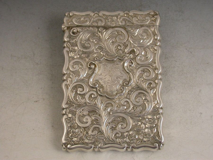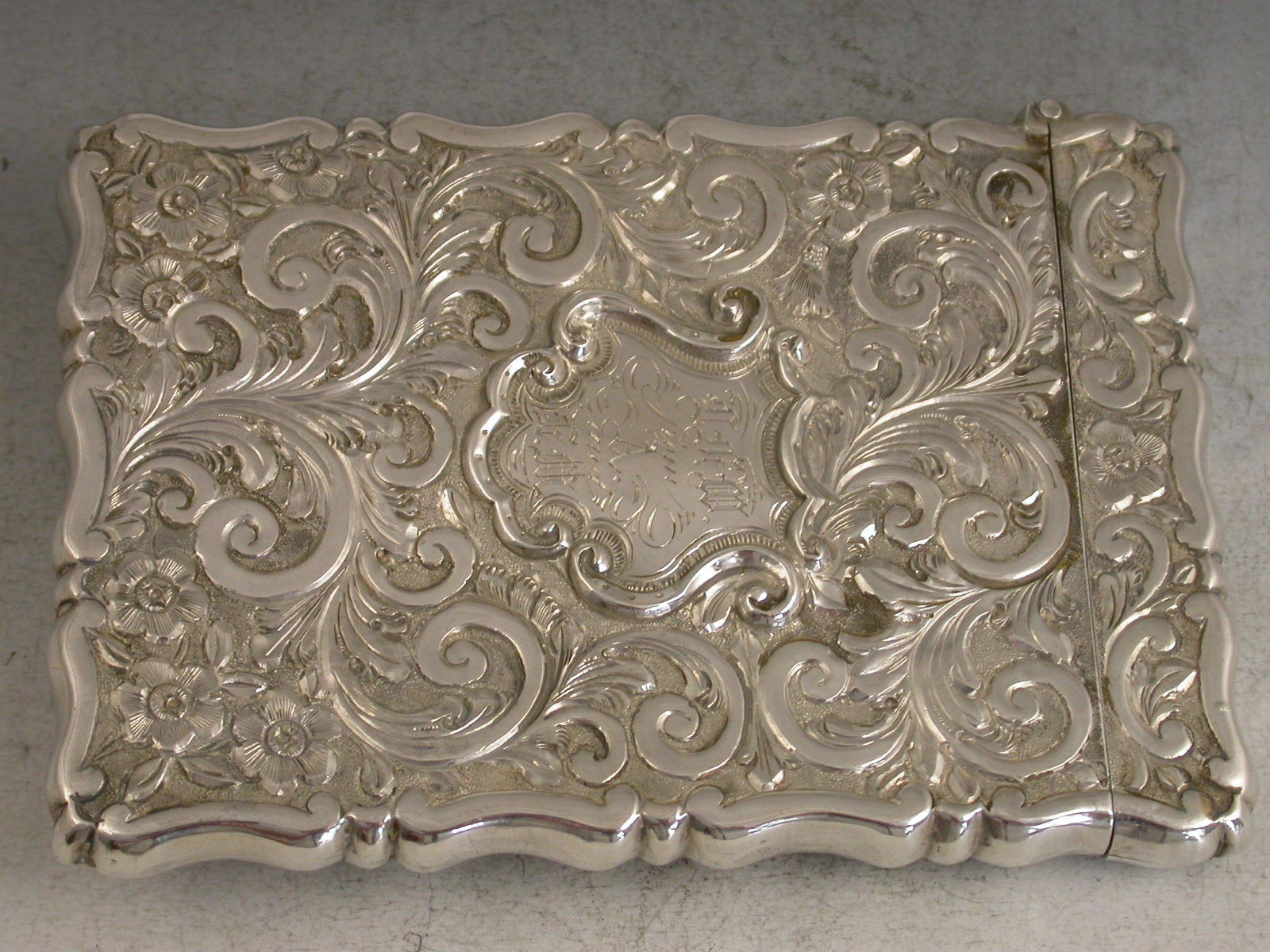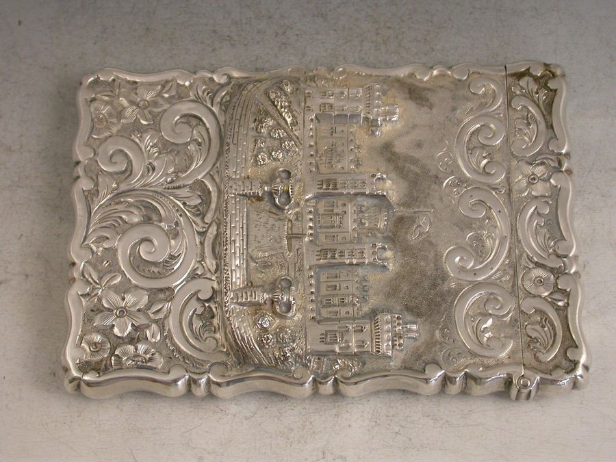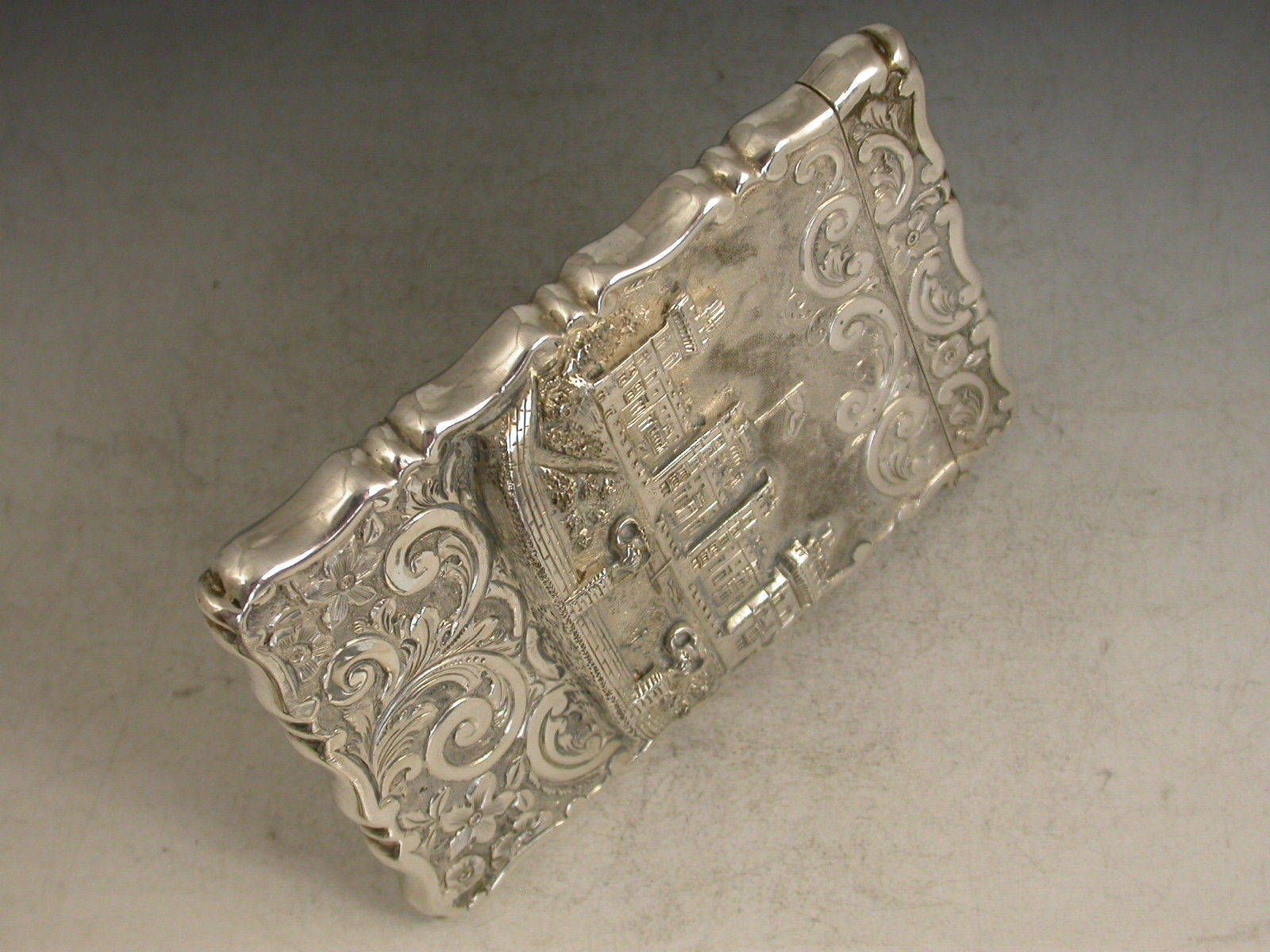 A good Victorian silver 'Castle Top' Card Case of shaped rectangular form with chased and embossed foliate scroll decoration. The front with a depiction of the east terrace of Windsor Castle in high relief. The reverse with a shield shaped cartouche engraved with initials.