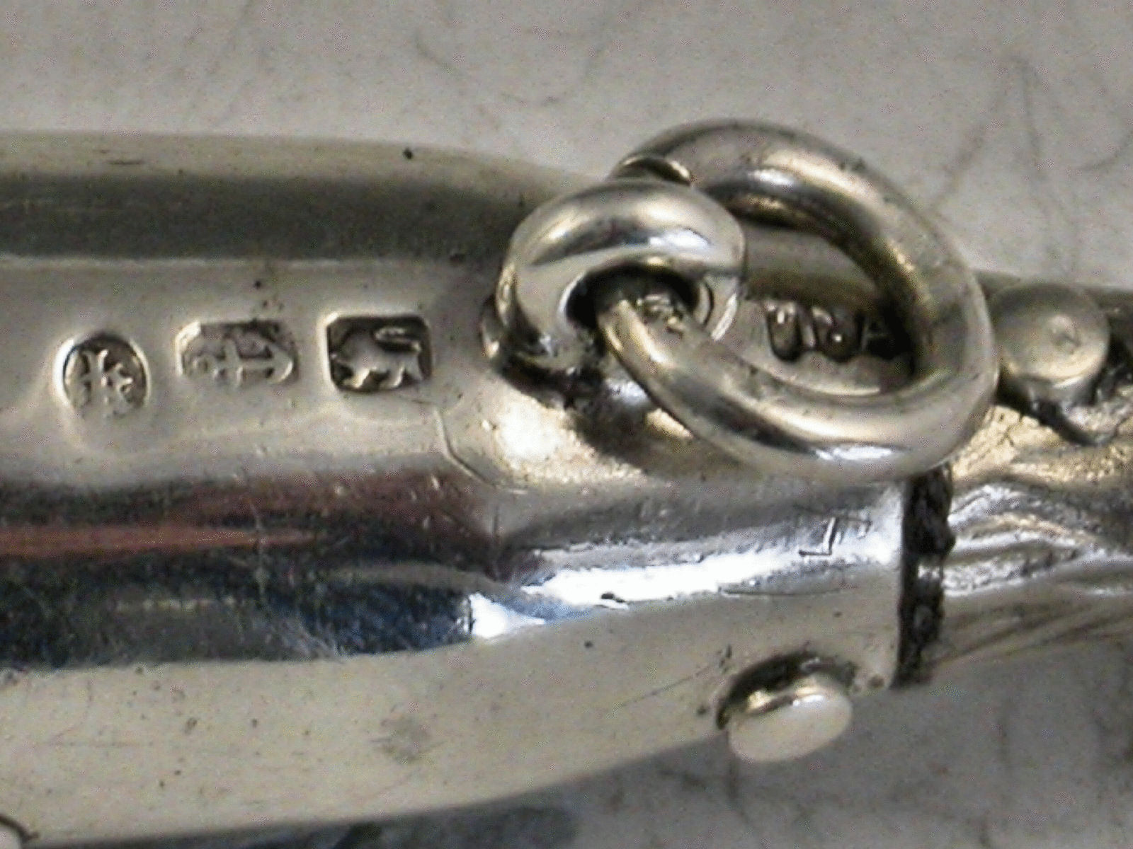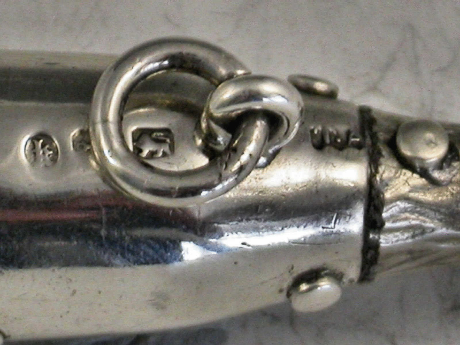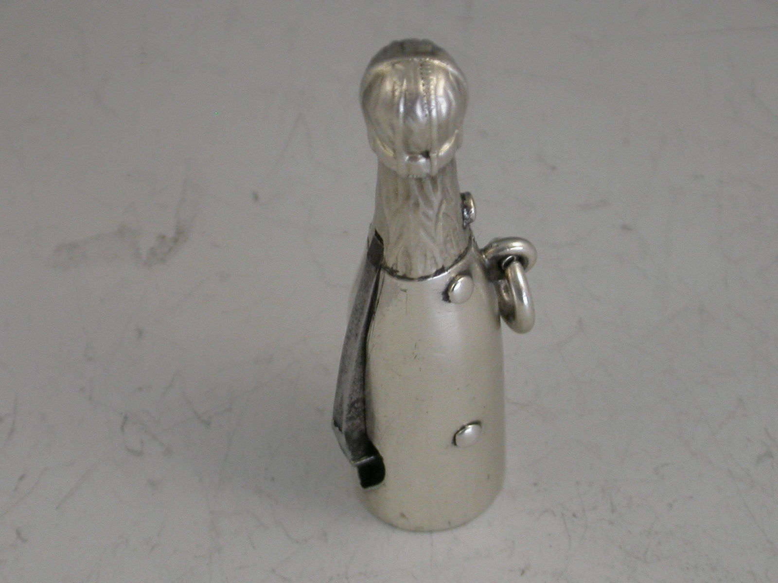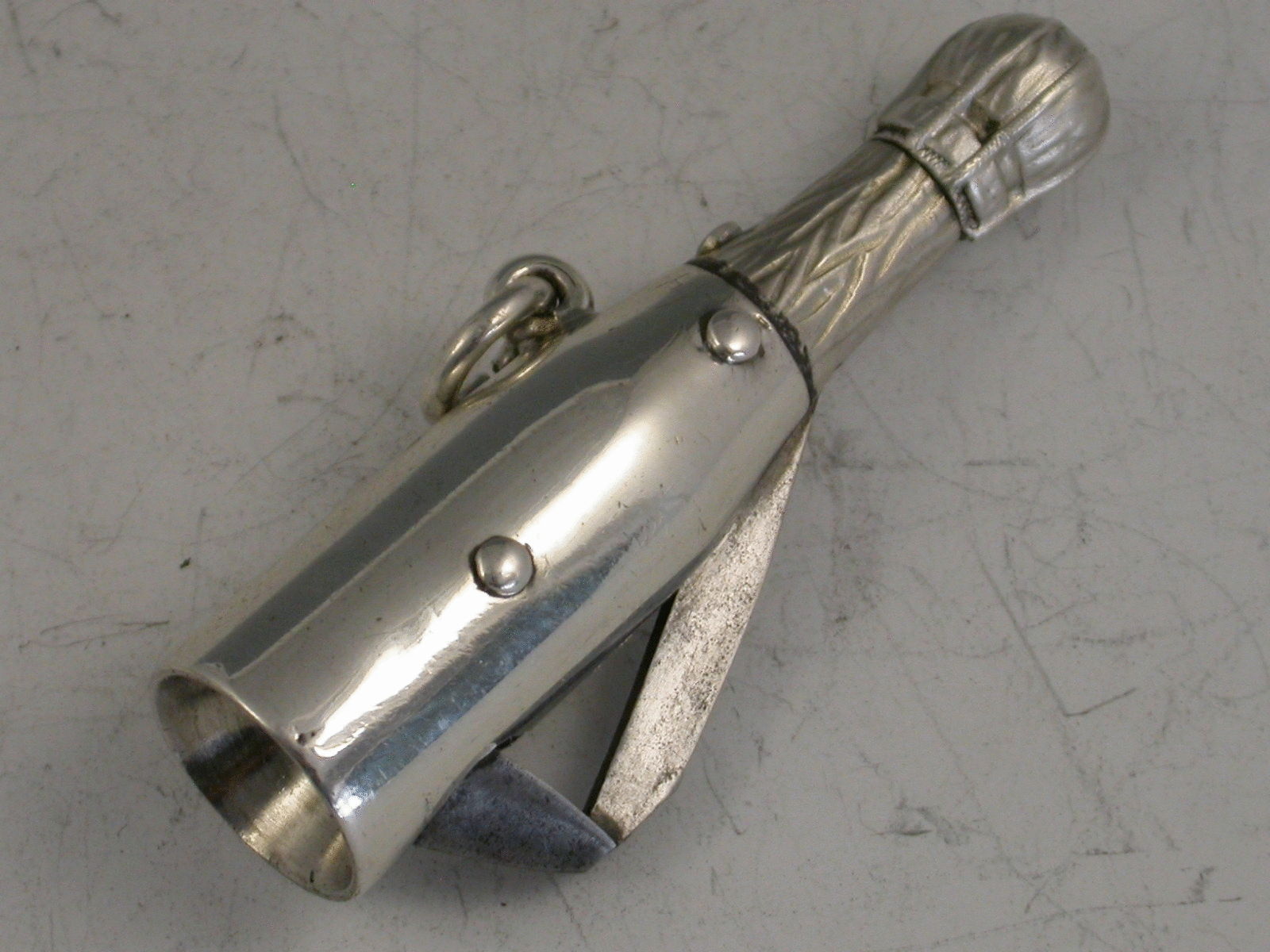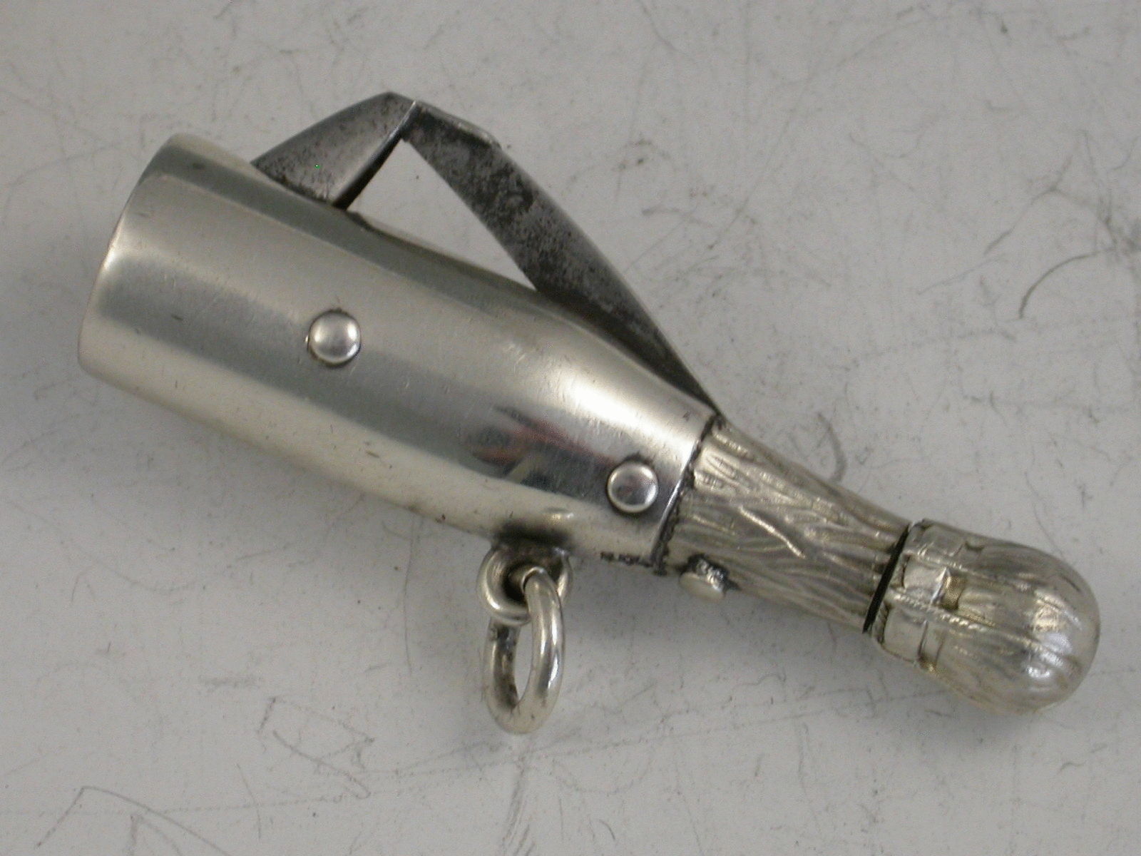 An unusual Victorian novelty silver Cigar Cutter in the form of a Champagne Bottle, with attached suspension ring. The cork of the bottle is turned to release the cutter, turning it in the opposite direction locks the blade back in place. Sprung steel blade.
