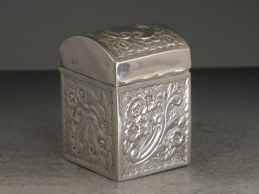 A good Victorian silver miniature twin-pack Playing Cards Box of rectangular form with domed hinged lid, the silver gilt interior complete with two packs of contemporary Goodall's miniature playing cards, the exterior with chased and engraved foliate scroll decoration.