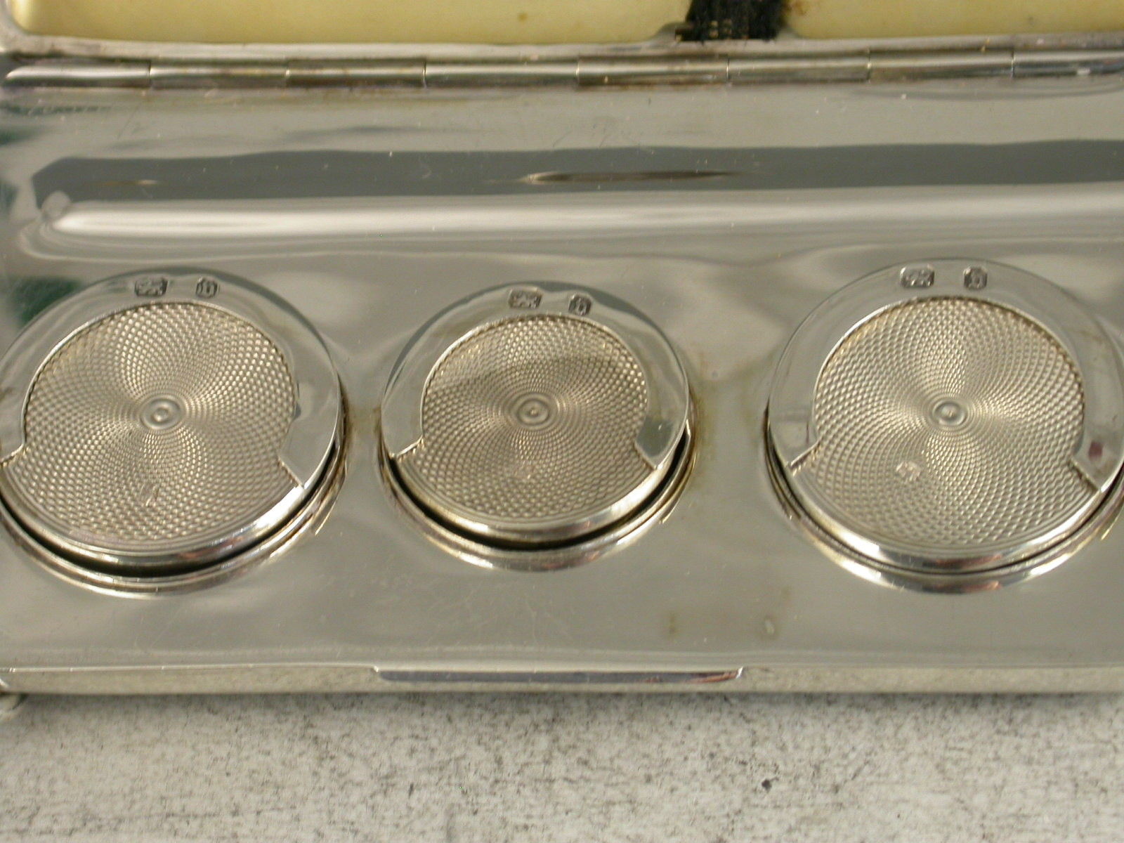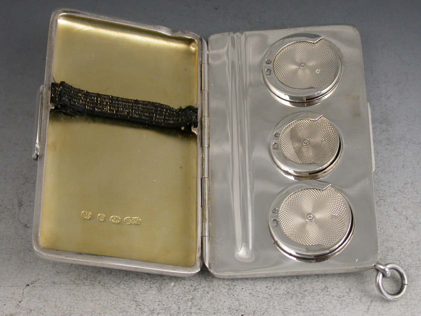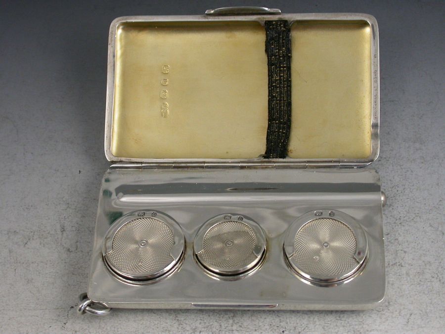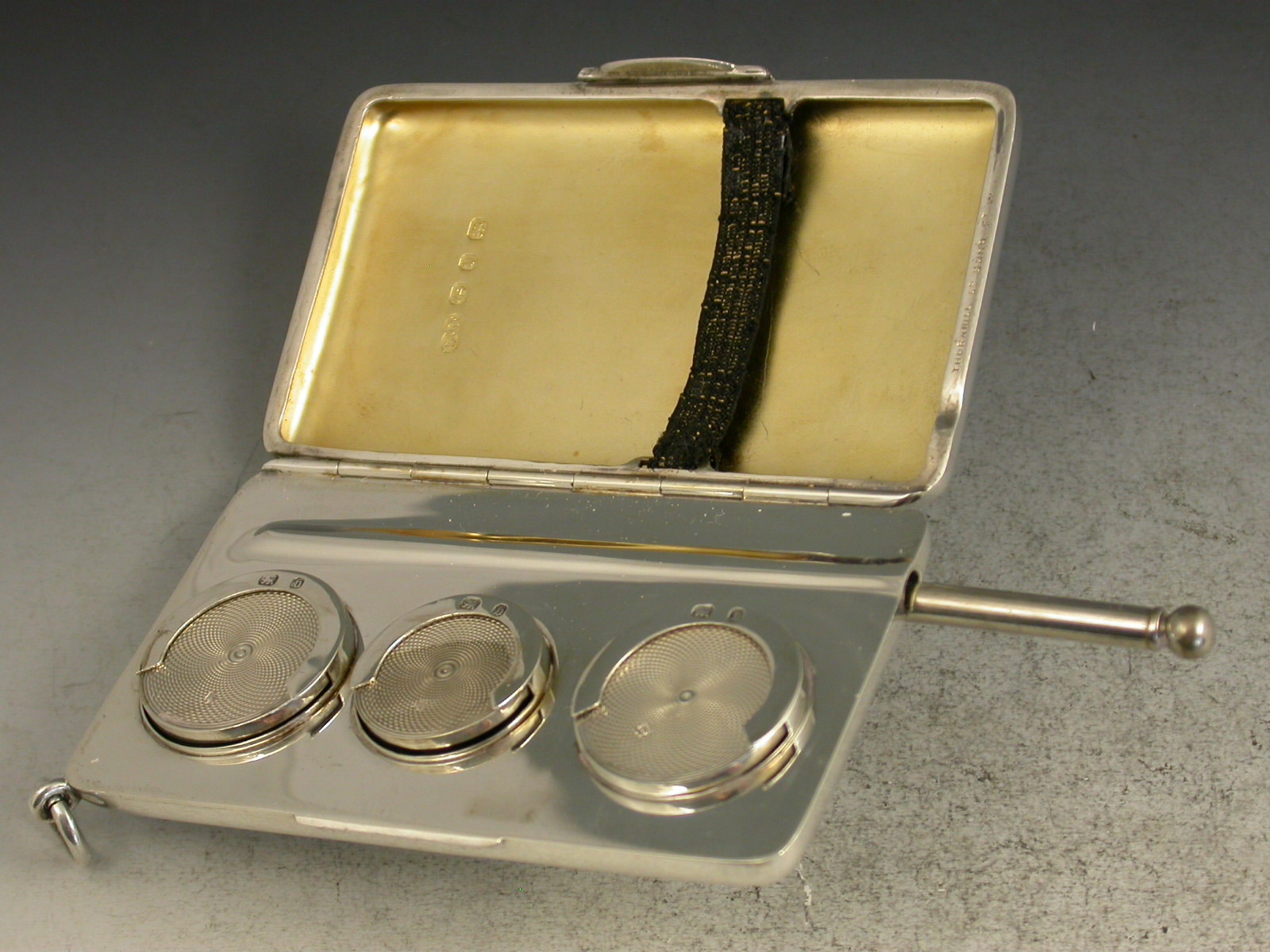 A good Victorian silver combination triple Sovereign Case, combined with a Cigarette Case and complete with an integral silver Propelling Pencil. The rounded rectangular case with a sprung hinge and securing clasp. The interior with three sprung compartments, two for full sovereigns and one for a half sovereigns.