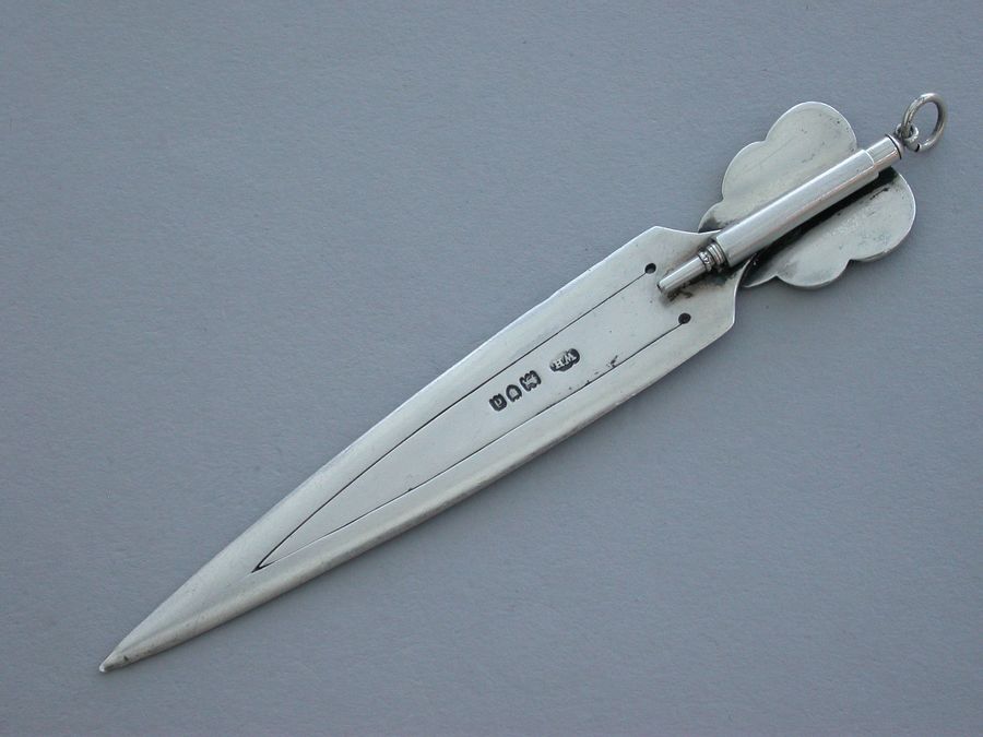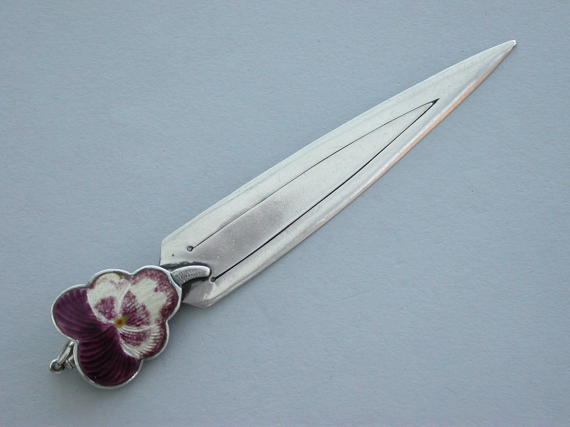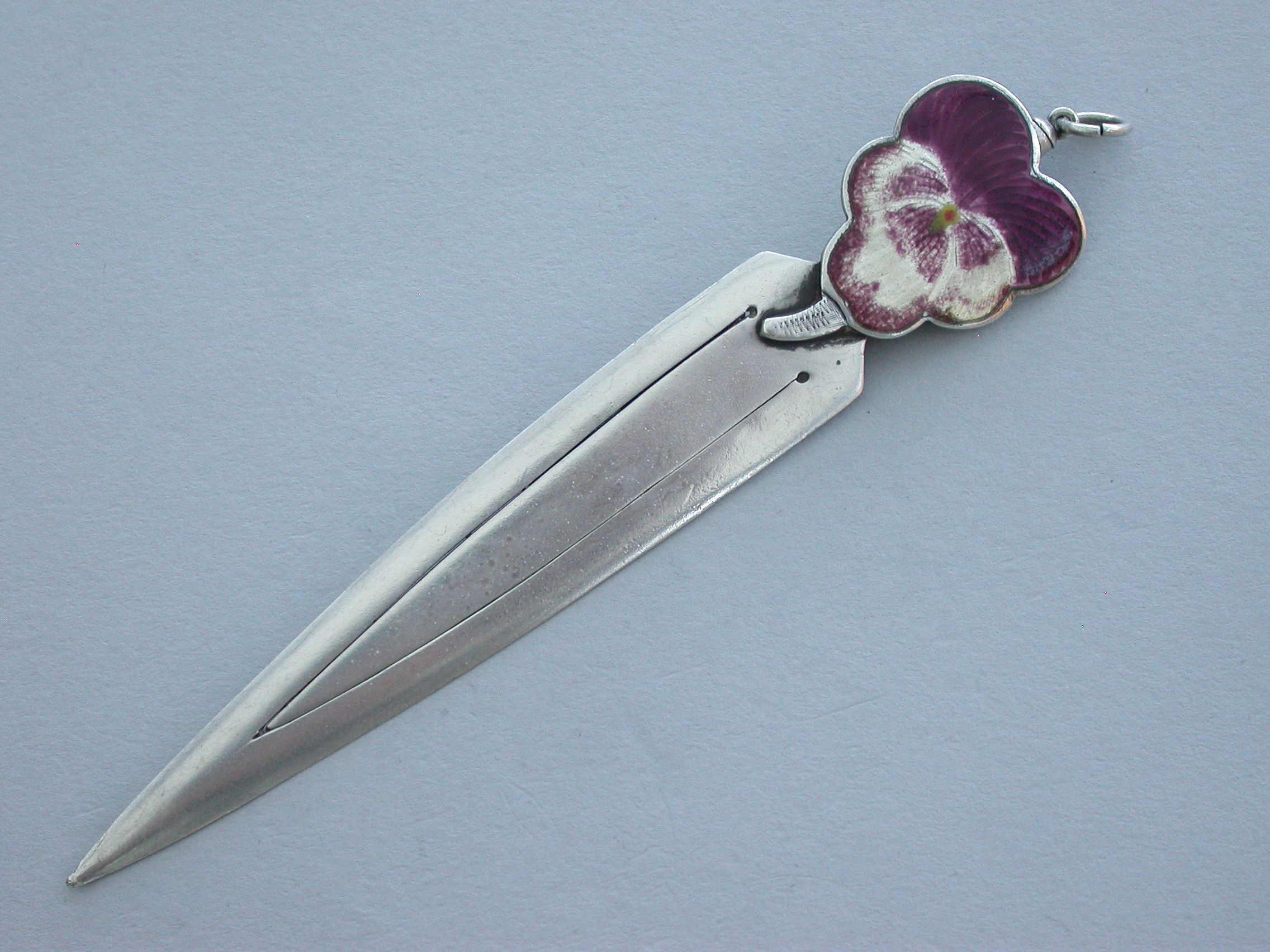 A good Victorian silver Bookmark with realistic purple enamel pansy flower terminal, the reverse with attached silver Propelling Pencil.