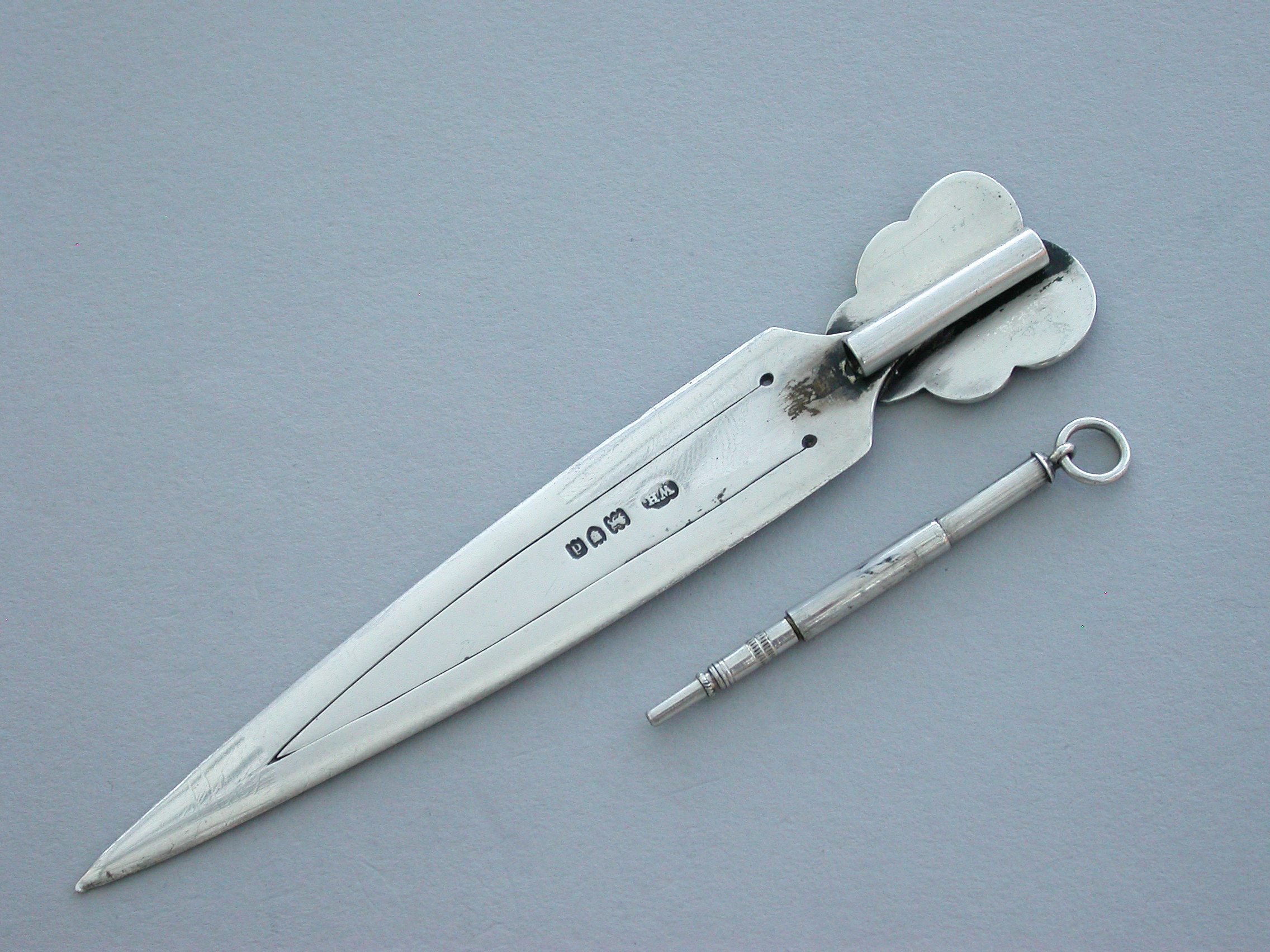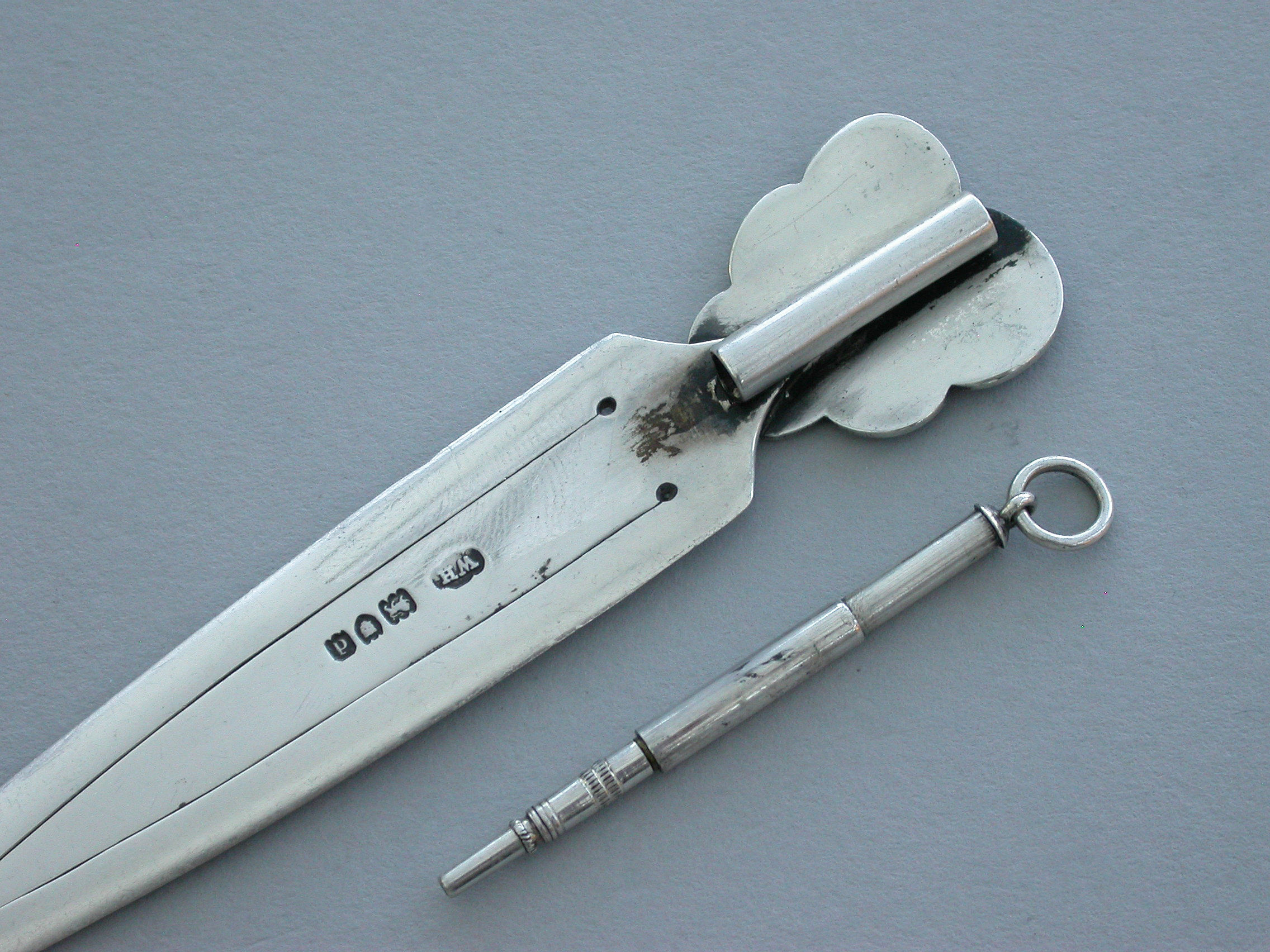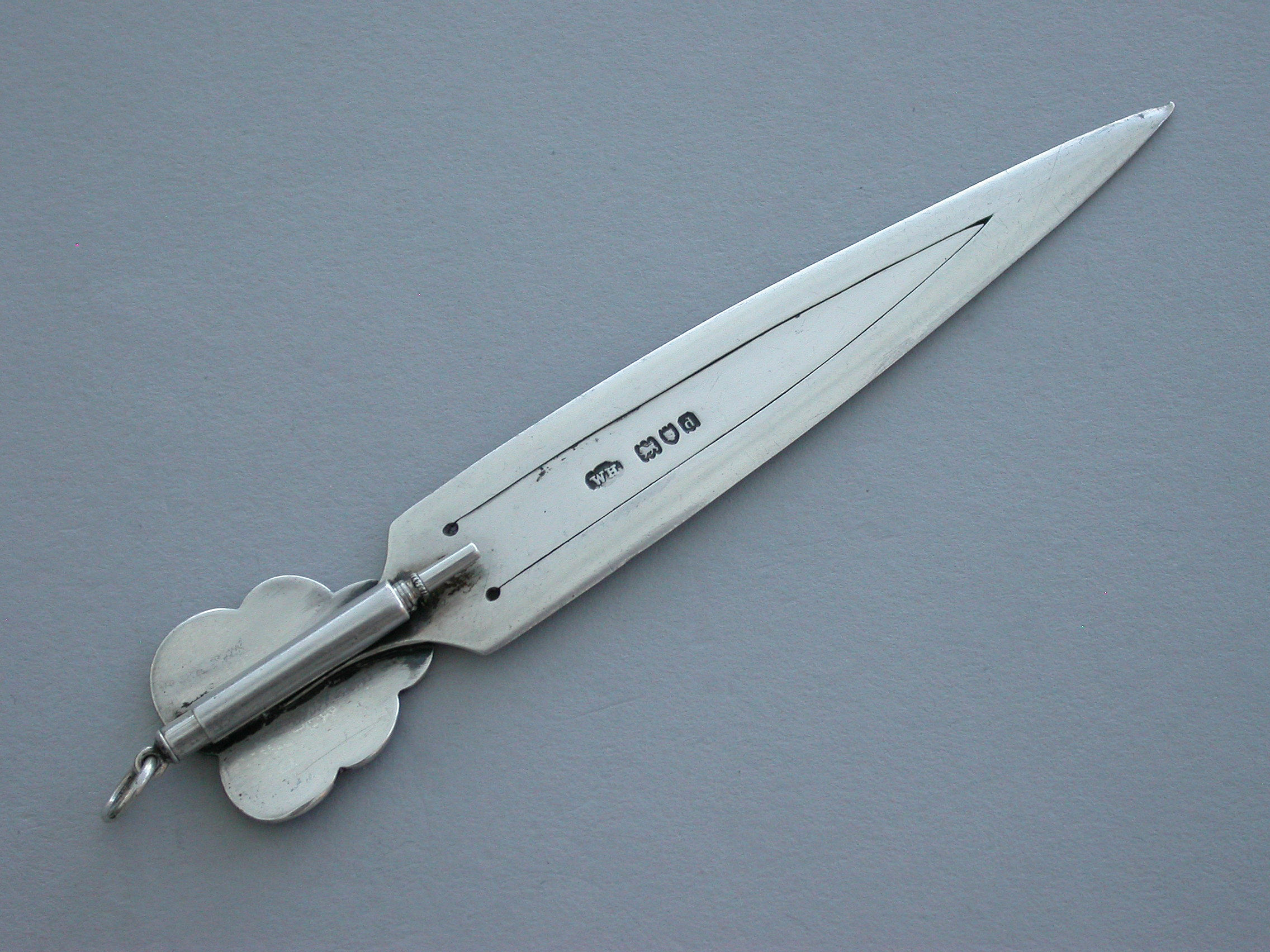 A good Victorian silver Bookmark with realistic purple enamel pansy flower terminal, the reverse with attached silver Propelling Pencil.