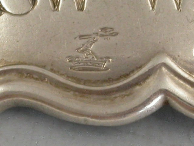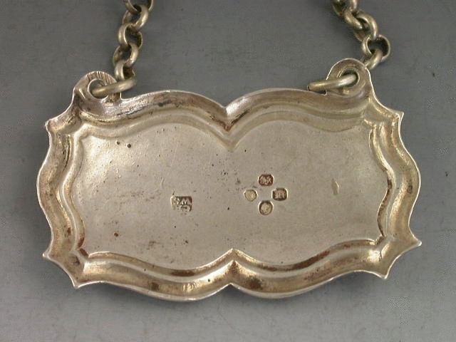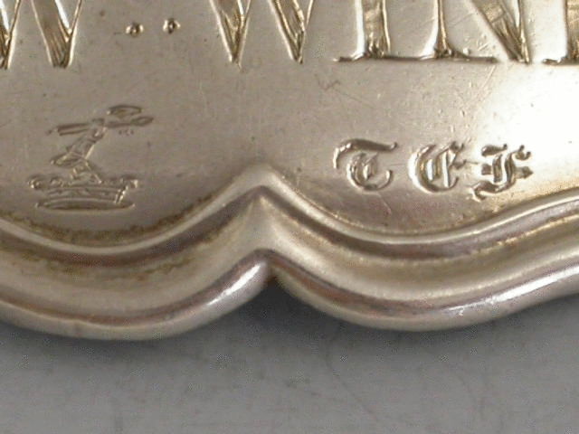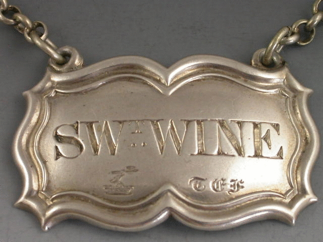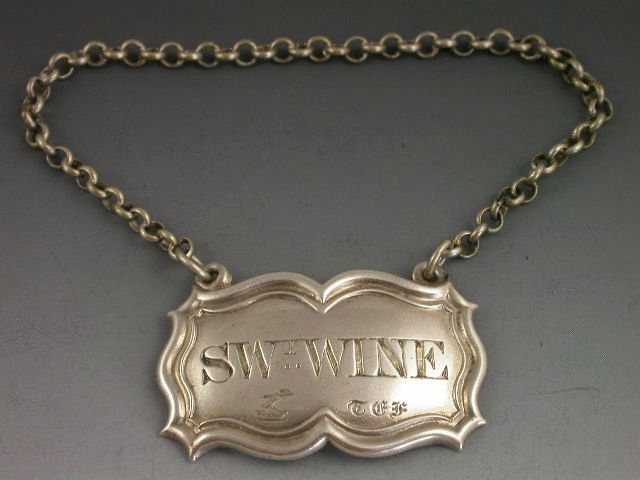 A good early Victorian silver Wine Label of shaped rectangular form with moulded raised border, incised for SWt WINE. Also engraved with a crest and initials, possibly for Farrant.