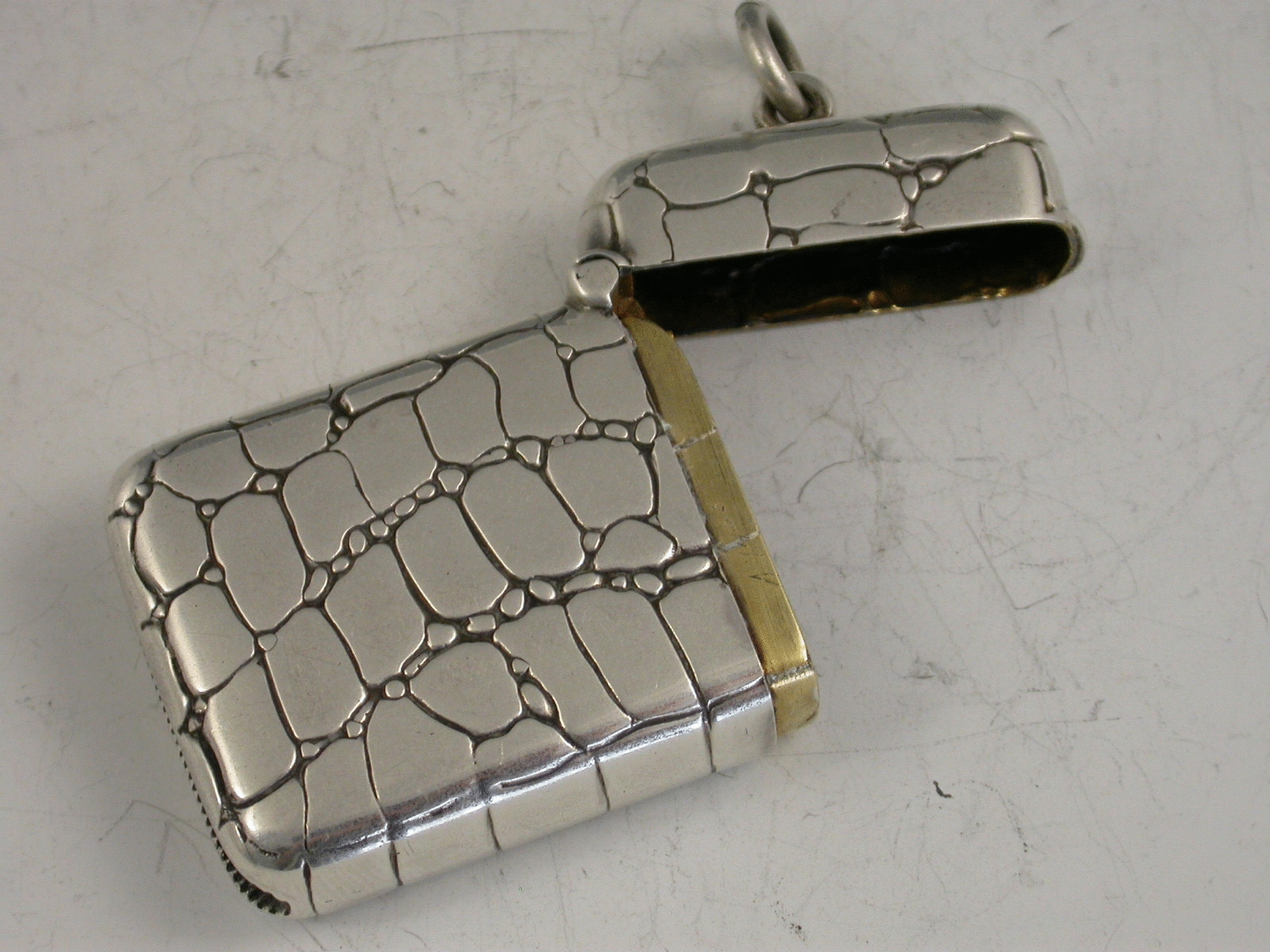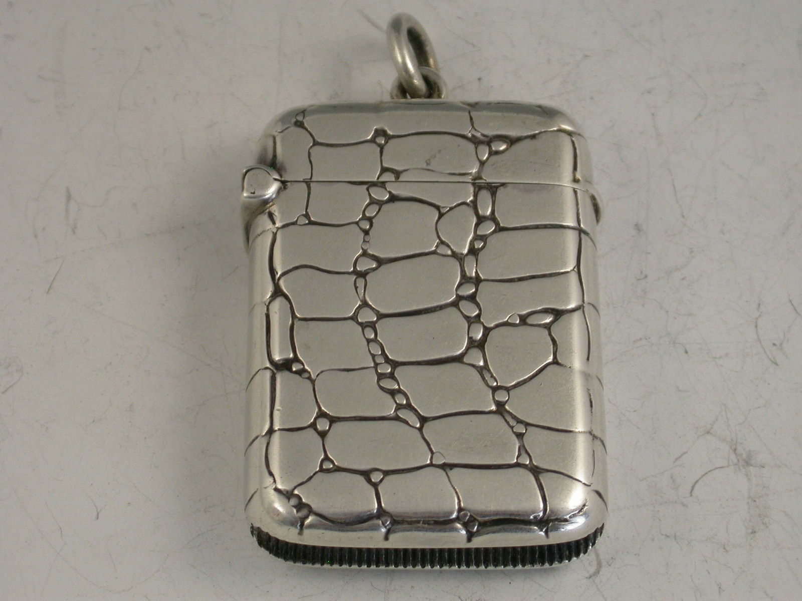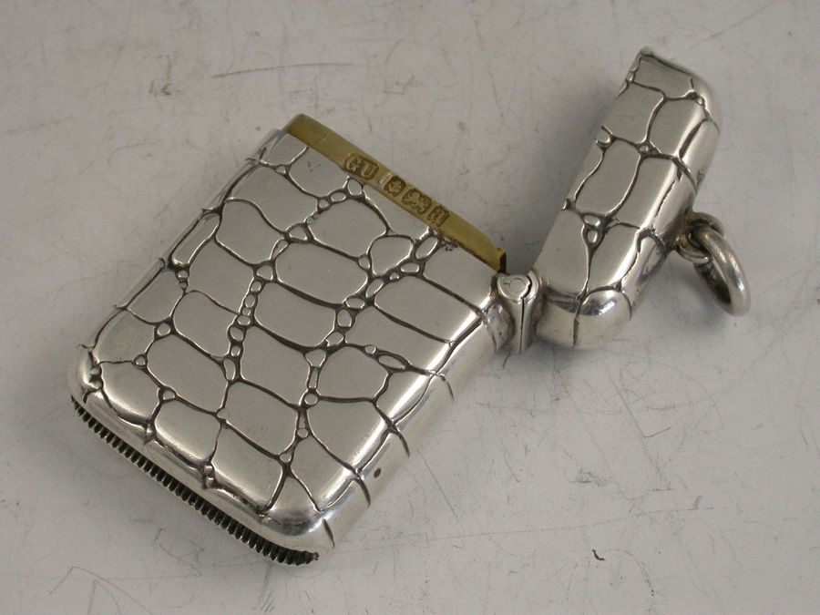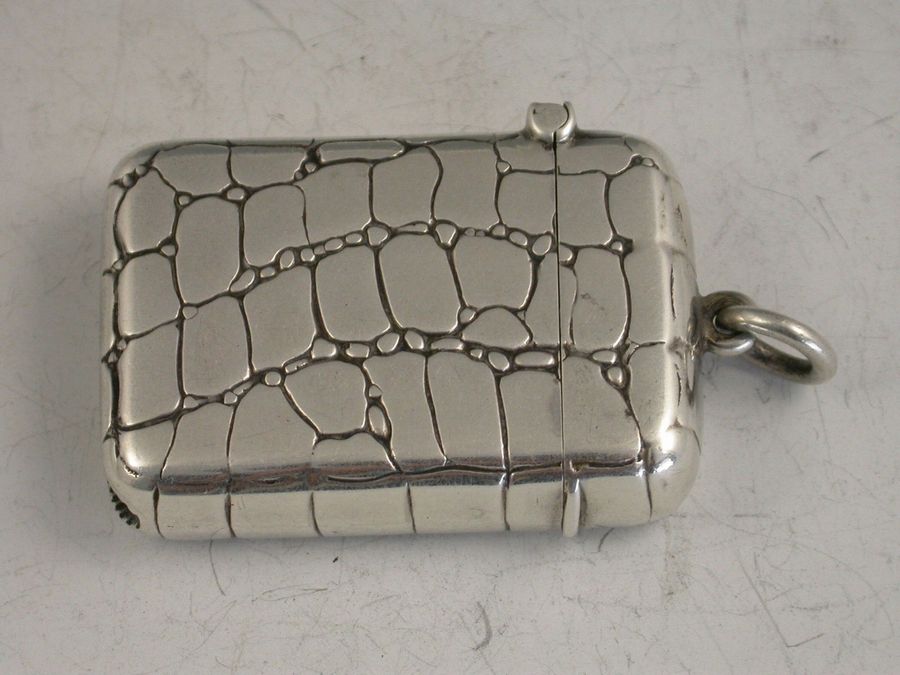 An unusual late Victorian Vesta Case of rounded rectangular form with hinged flip top lid, the body chased and engraved to simulate crocodile or lizard skin.