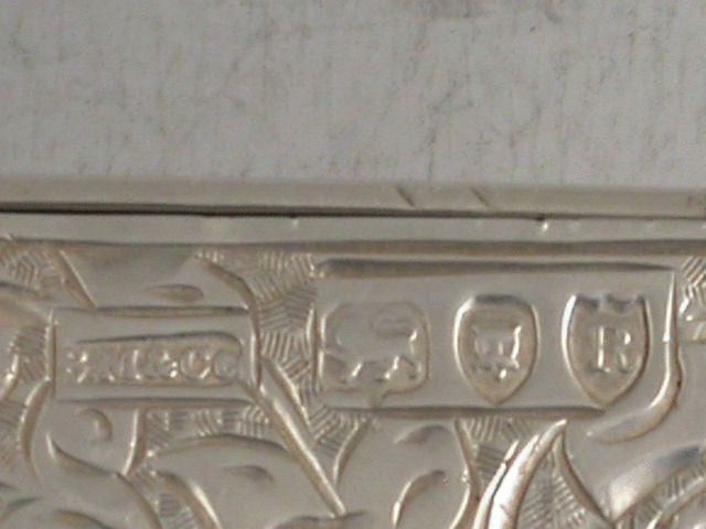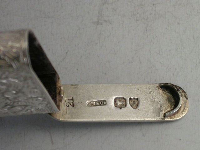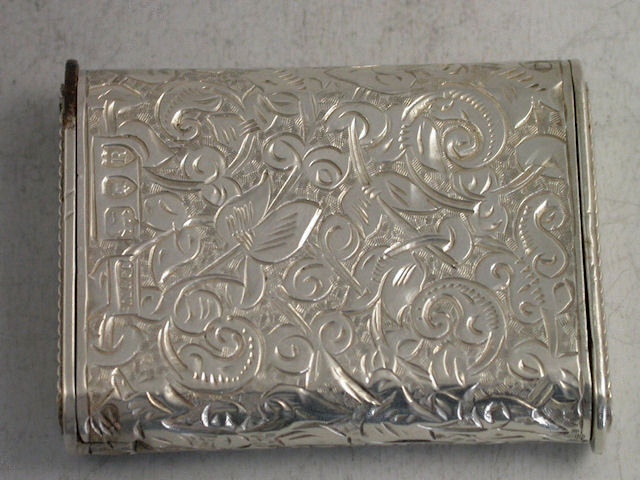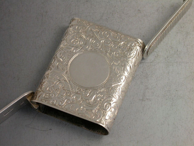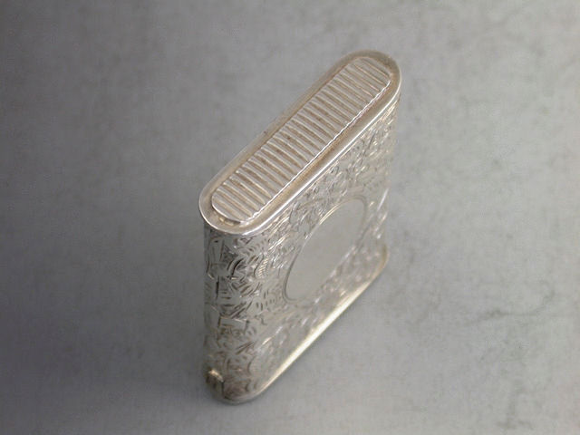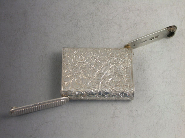 A rare Victorian silver double opening ‘flat-top’ Vesta Case with two hinged lids both with strike plates, the rounded rectangular body chased and engraved with foliate scrolls, a plain un-engraved circular cartouche to the front.