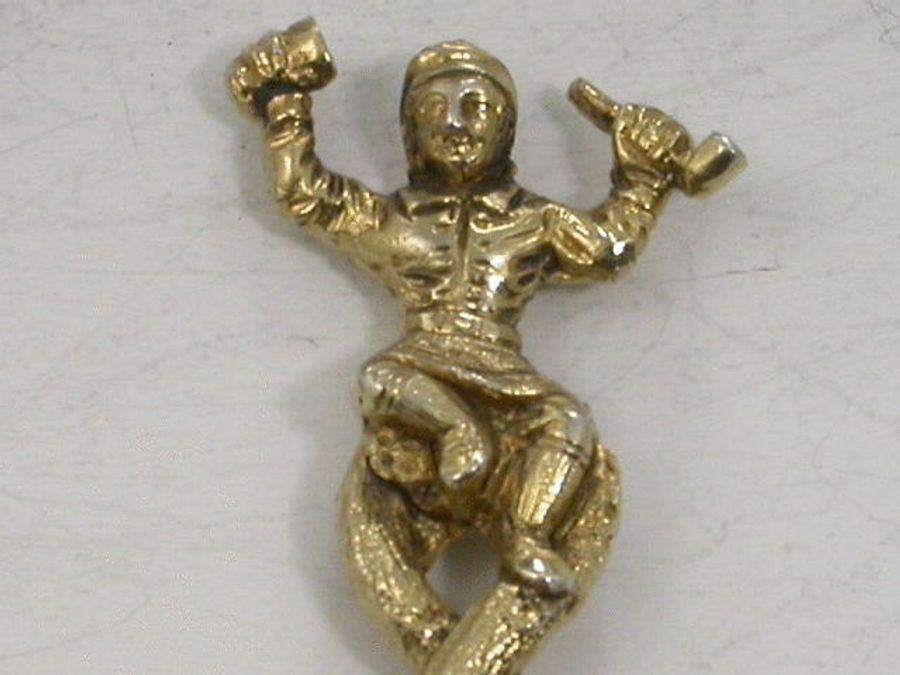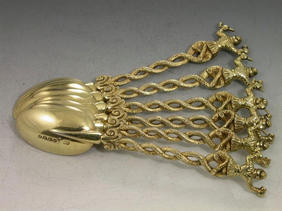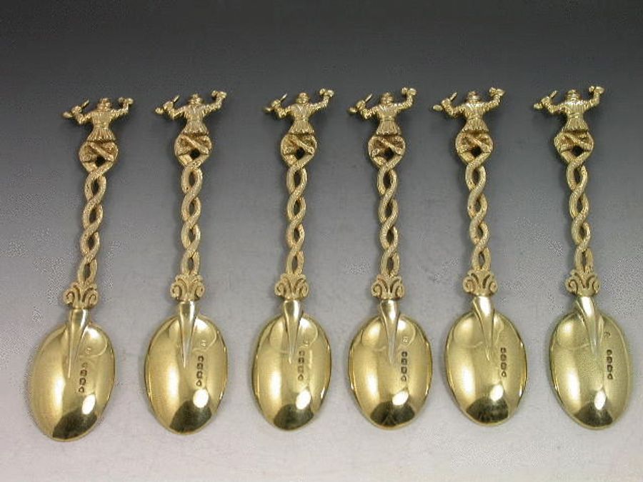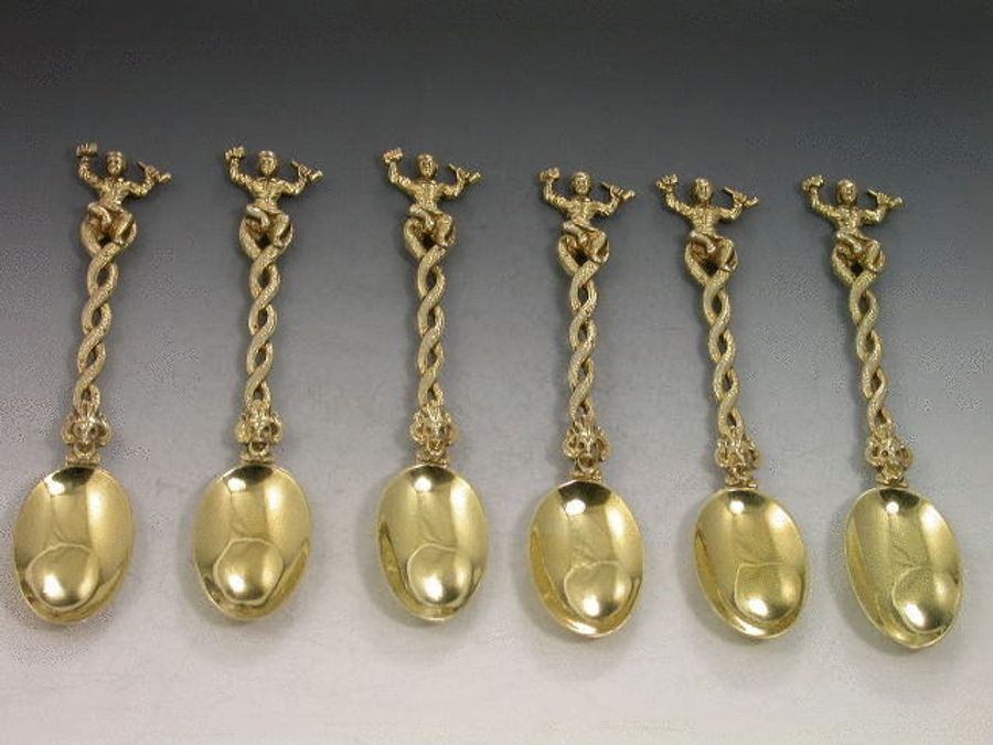 An extraordinary set of six Victorian cast silver gilt Teaspoons formed from an eclectic mixture of styles, with plain rattail bowls, entwined tendril stems with Punchinello mask head terminals and seated Dutch Topers (after the artist Teniers) with pipes and mugs as the finials.