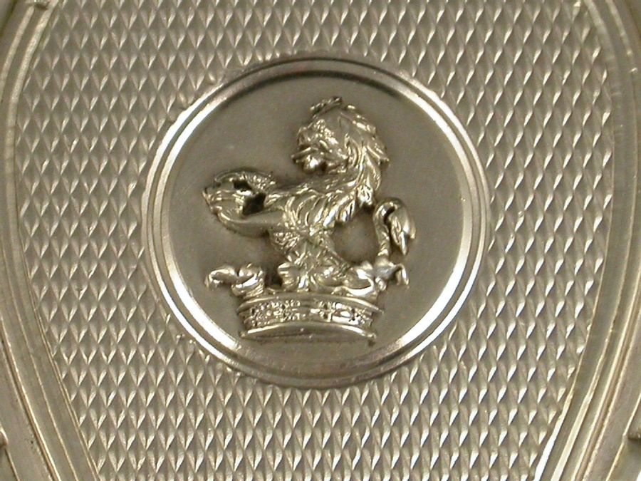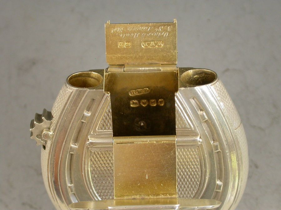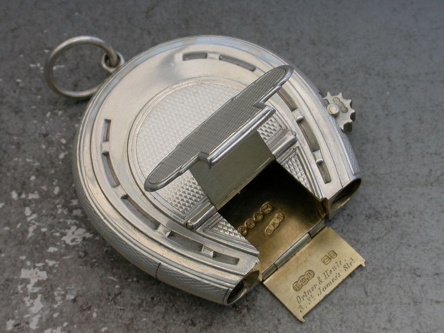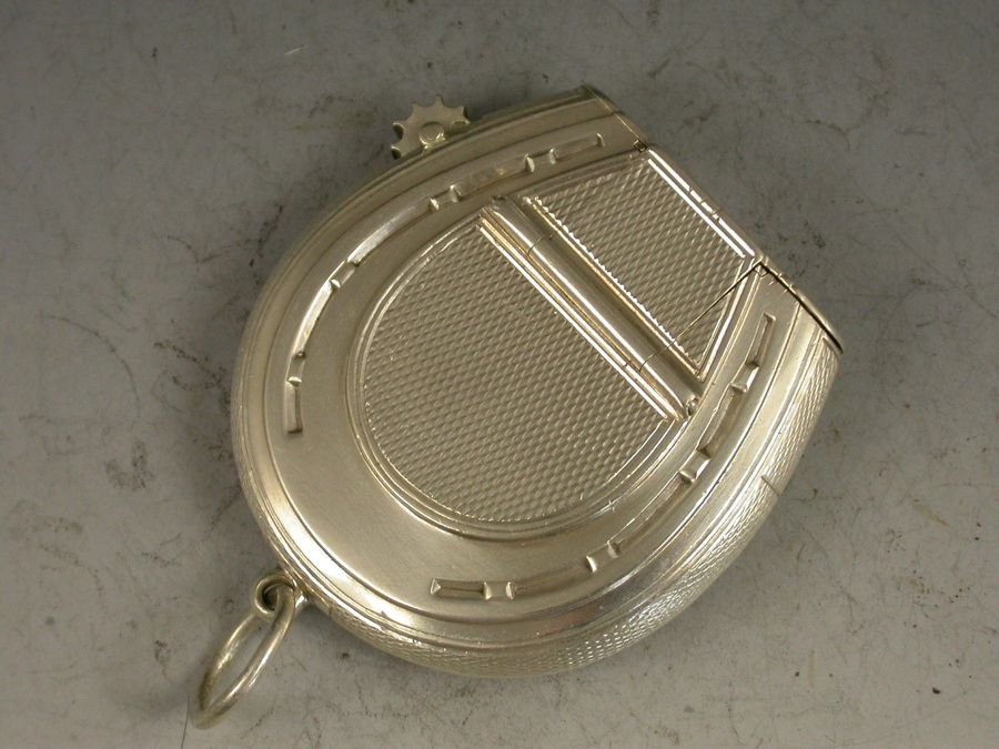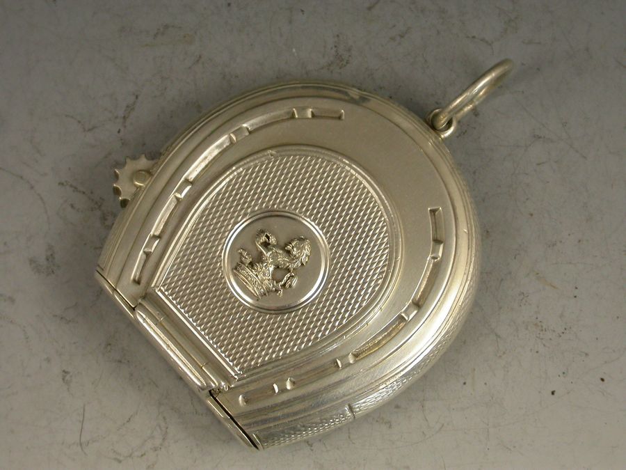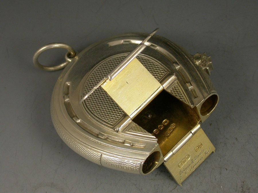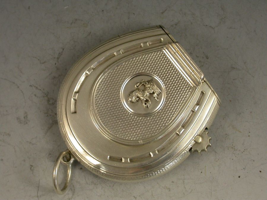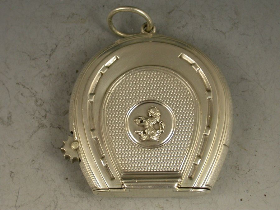 A good quality and early Victorian silver Vesta Case combined with a wick holder, made in the form of a horseshoe with attached suspension ring, with superb double hinged opening mechanism and silver gilt interior and striker. A knurled wheel to one side to extend the wick and an applied crest to the circular cartouche depicting a demi lion rampant out of a ducal coronet and holding a ducal coronet between its paws, possibly for the Henry family.