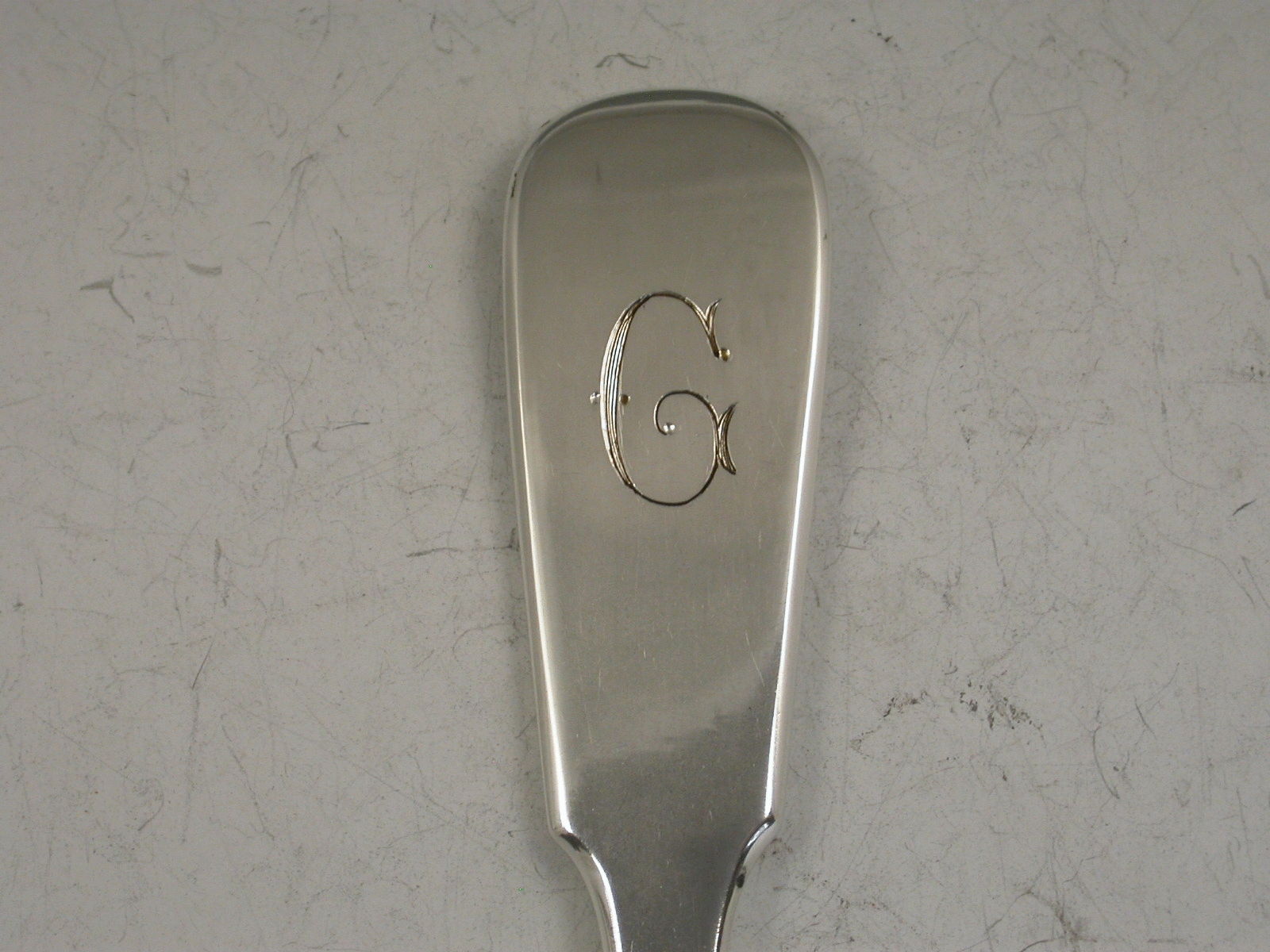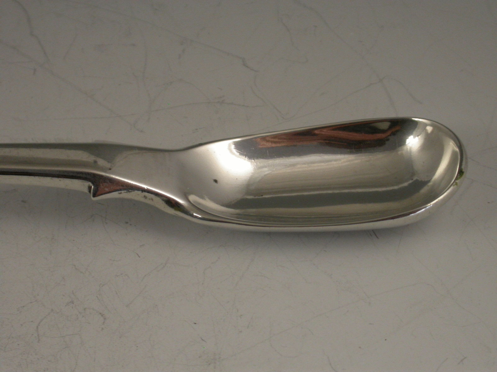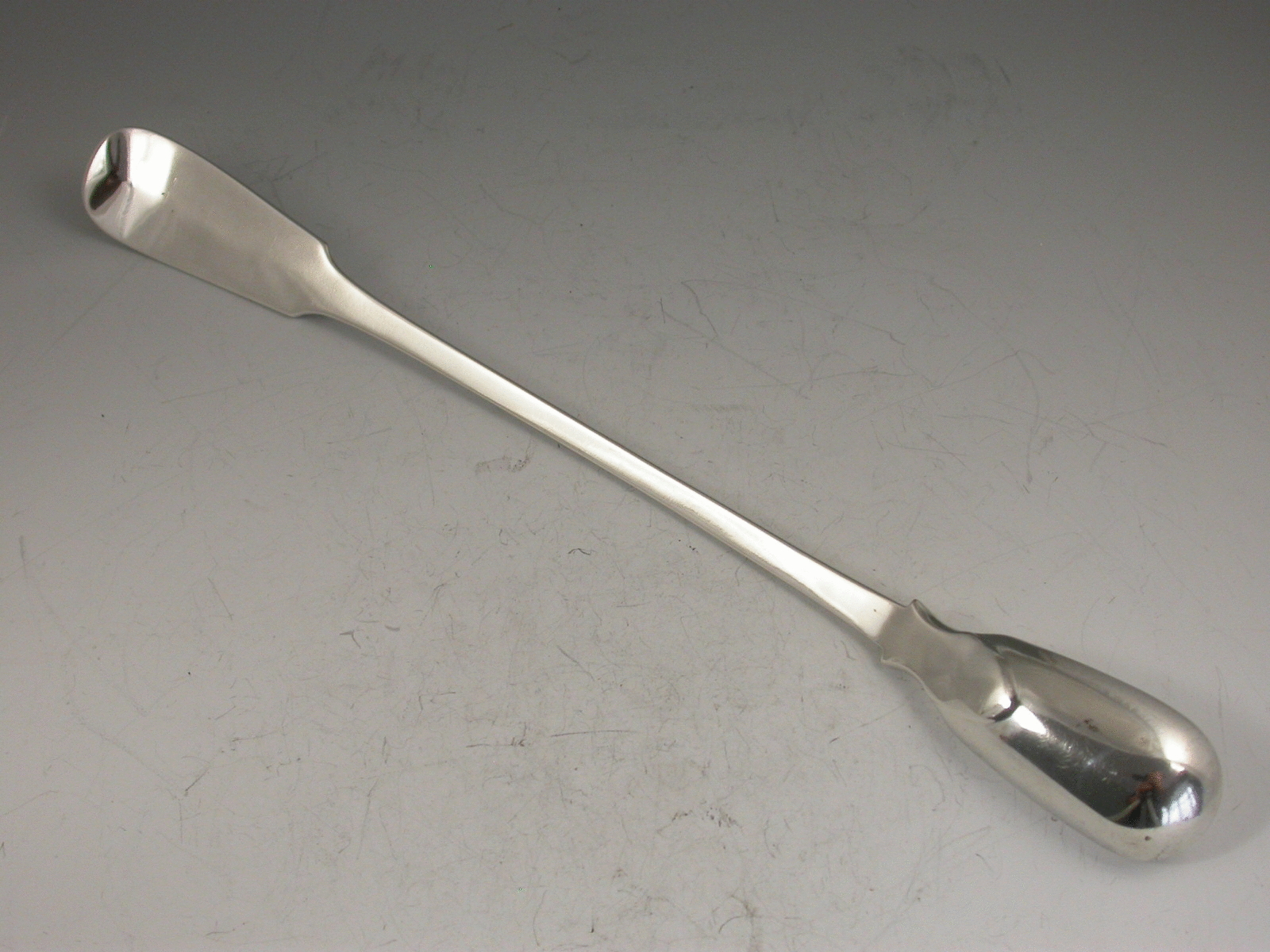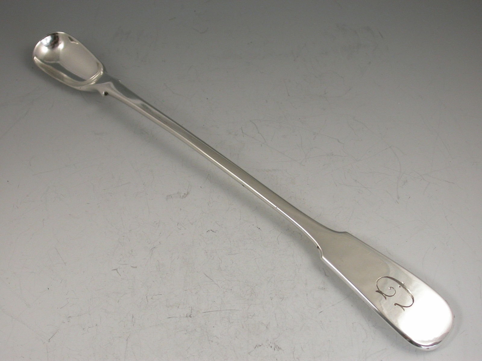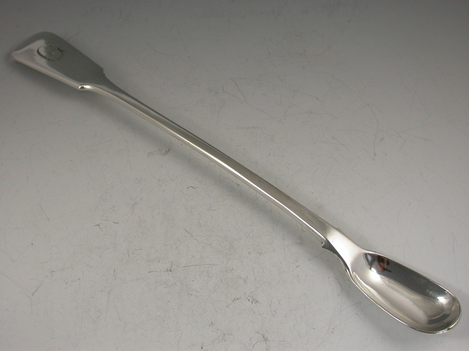 An unusual Victorian electroplated Spoon or Scoop of unknown use with long fiddle pattern handle engraved with an initial G.