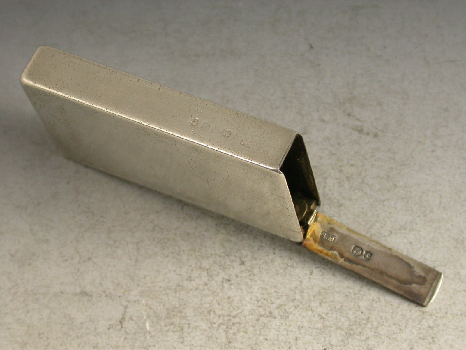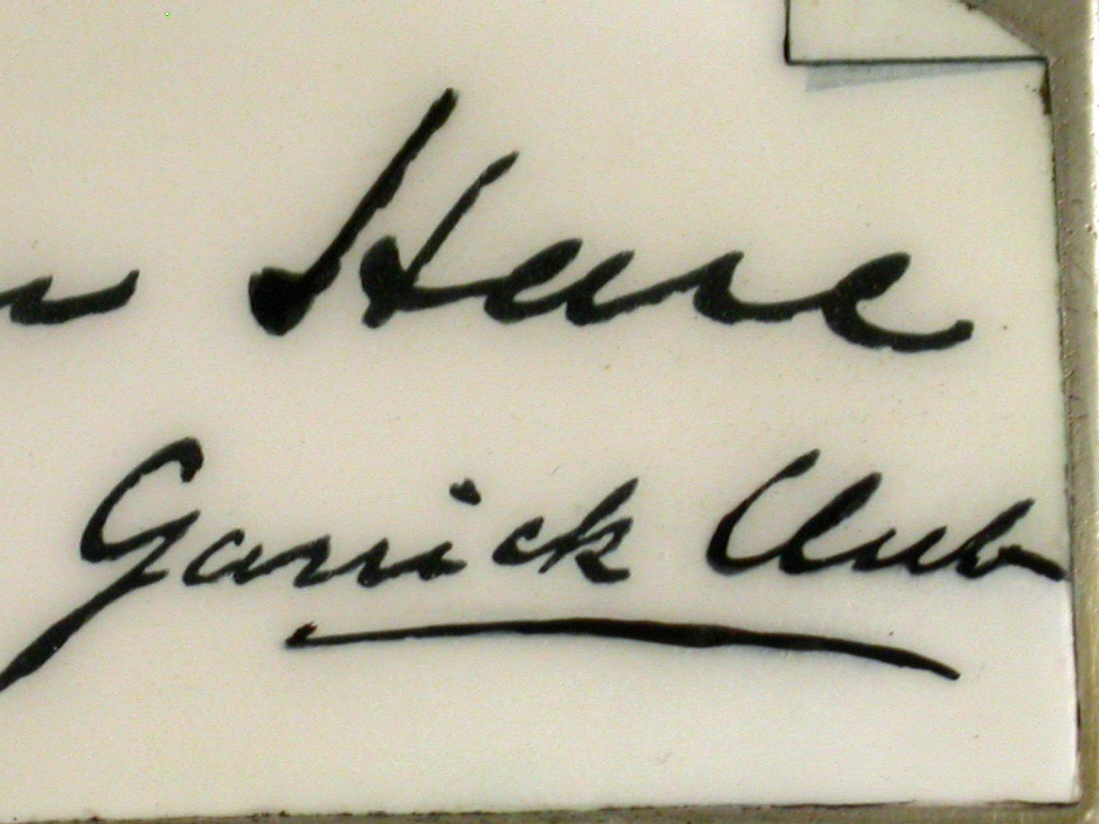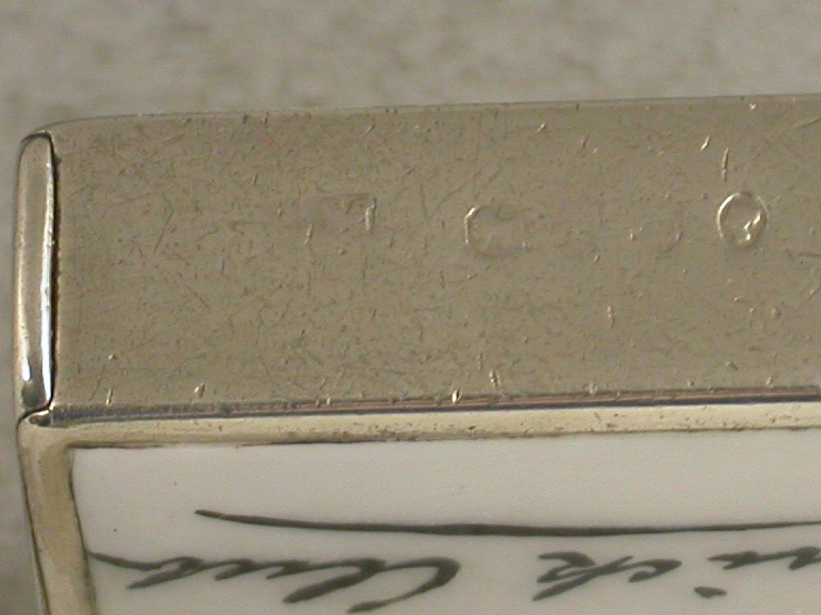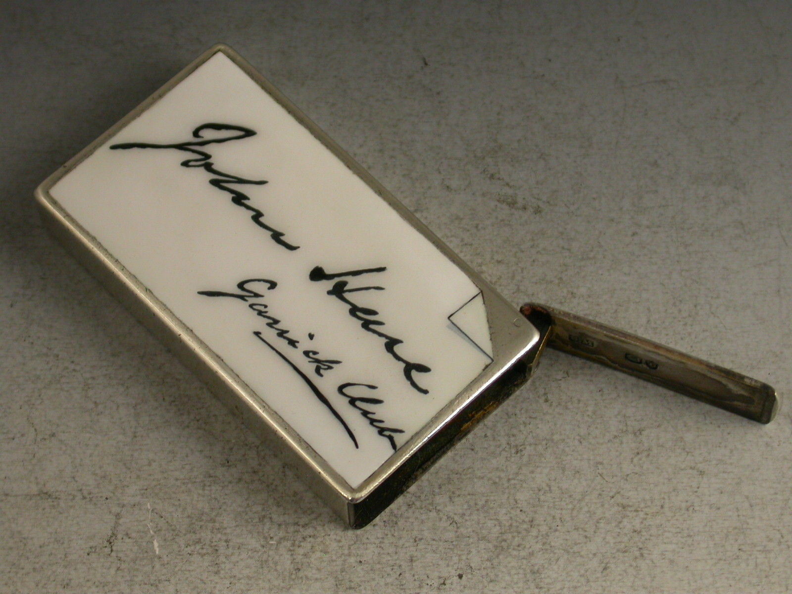 A Victorian silver Vesta Case with Theatrical interest, of plain rectangular form with flat sprung hinged flip-top lid. The face enamelled in monochrome to resemble the calling card of John Hare of the Garrick Club, with the corner turned over.
