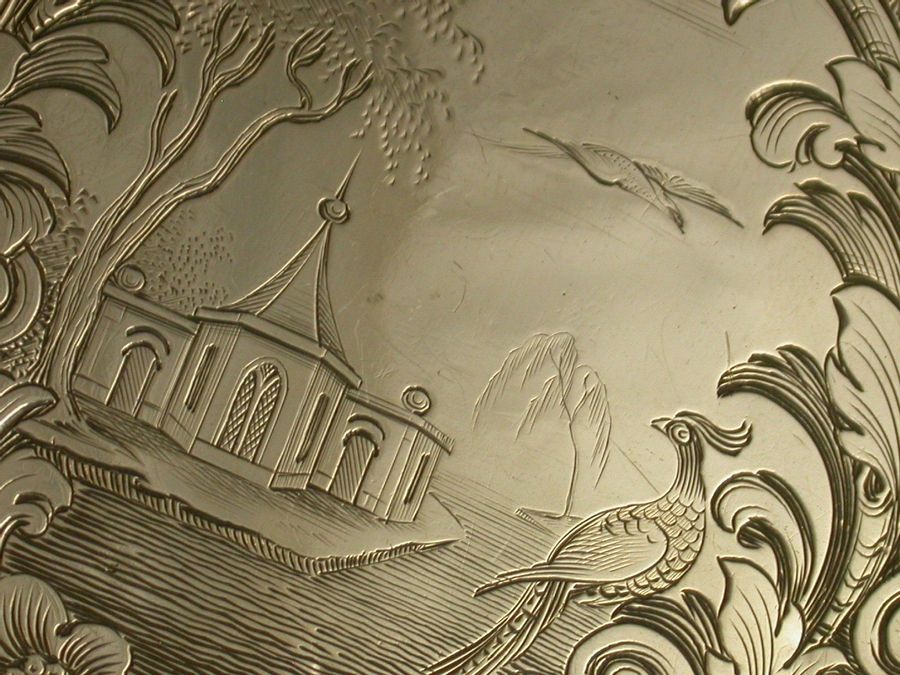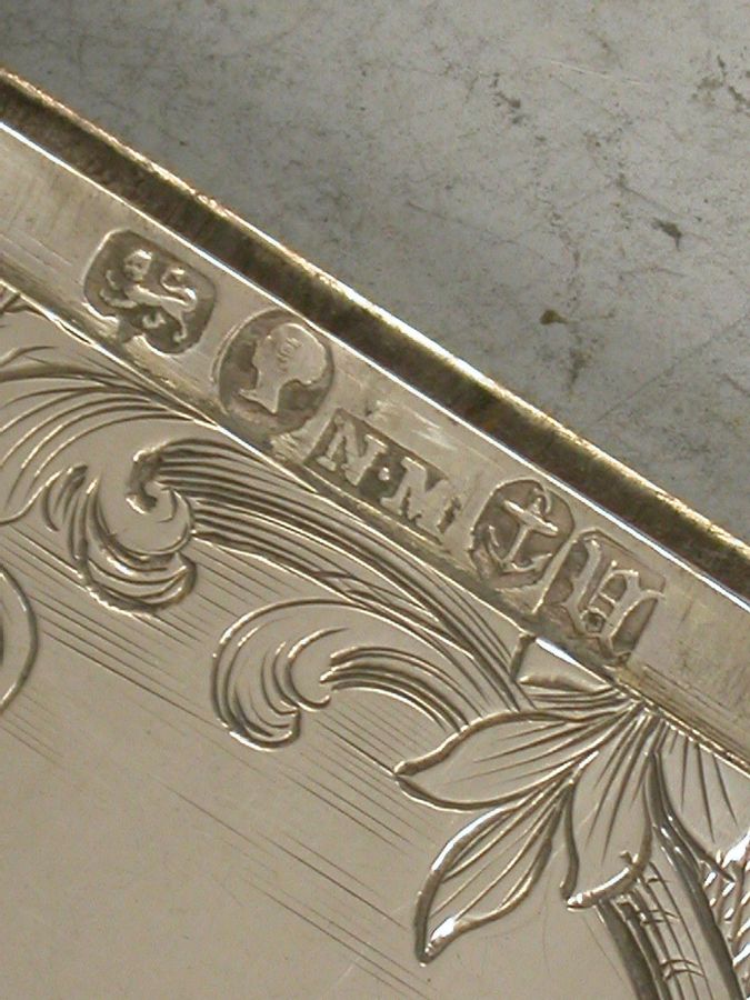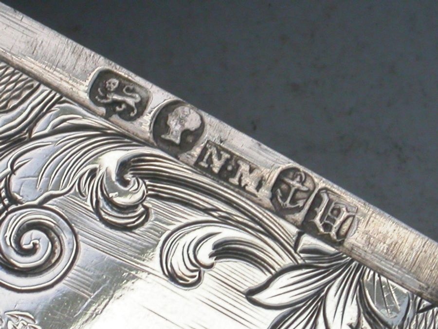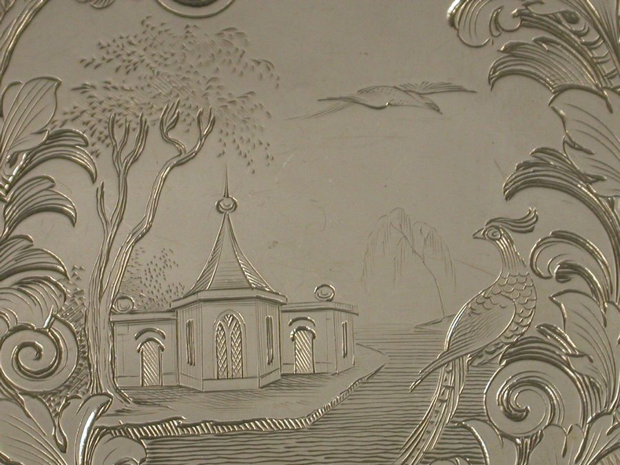 A fine and rare Victorian silver Card Case of shaped rectangular form, a cartouche to the reverse engraved with a vase of flowers surrounded by foliate scrolls on an engine turned background. The face engraved with a similar cartouche depicting an English landscape garden scene with a folly beside a lake, exotic birds and a willow tree.