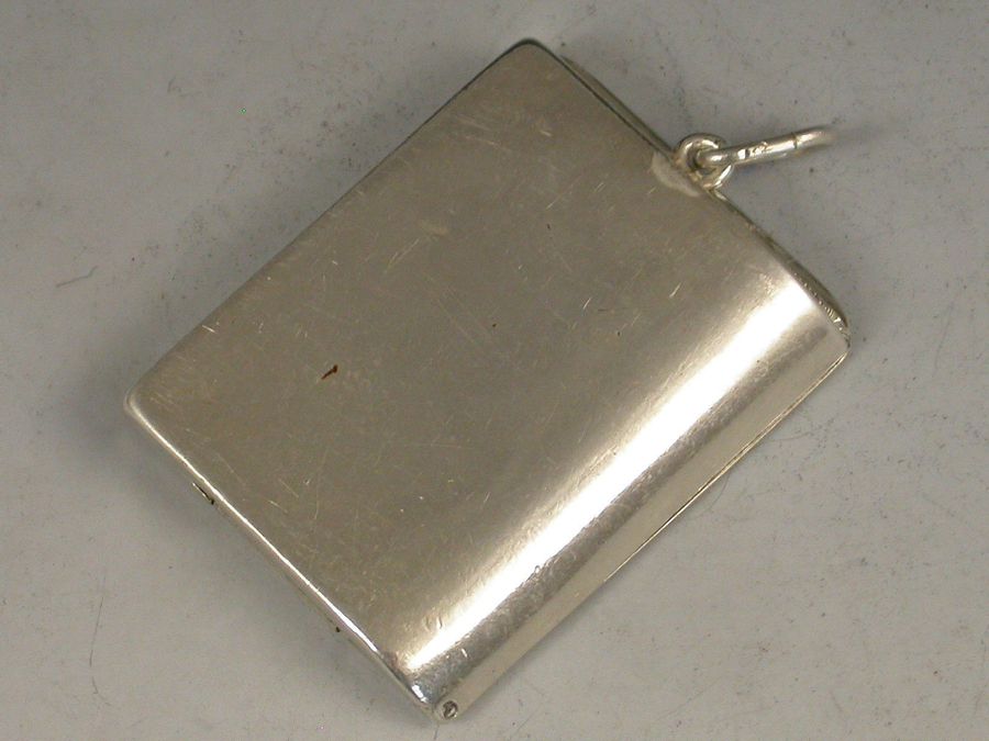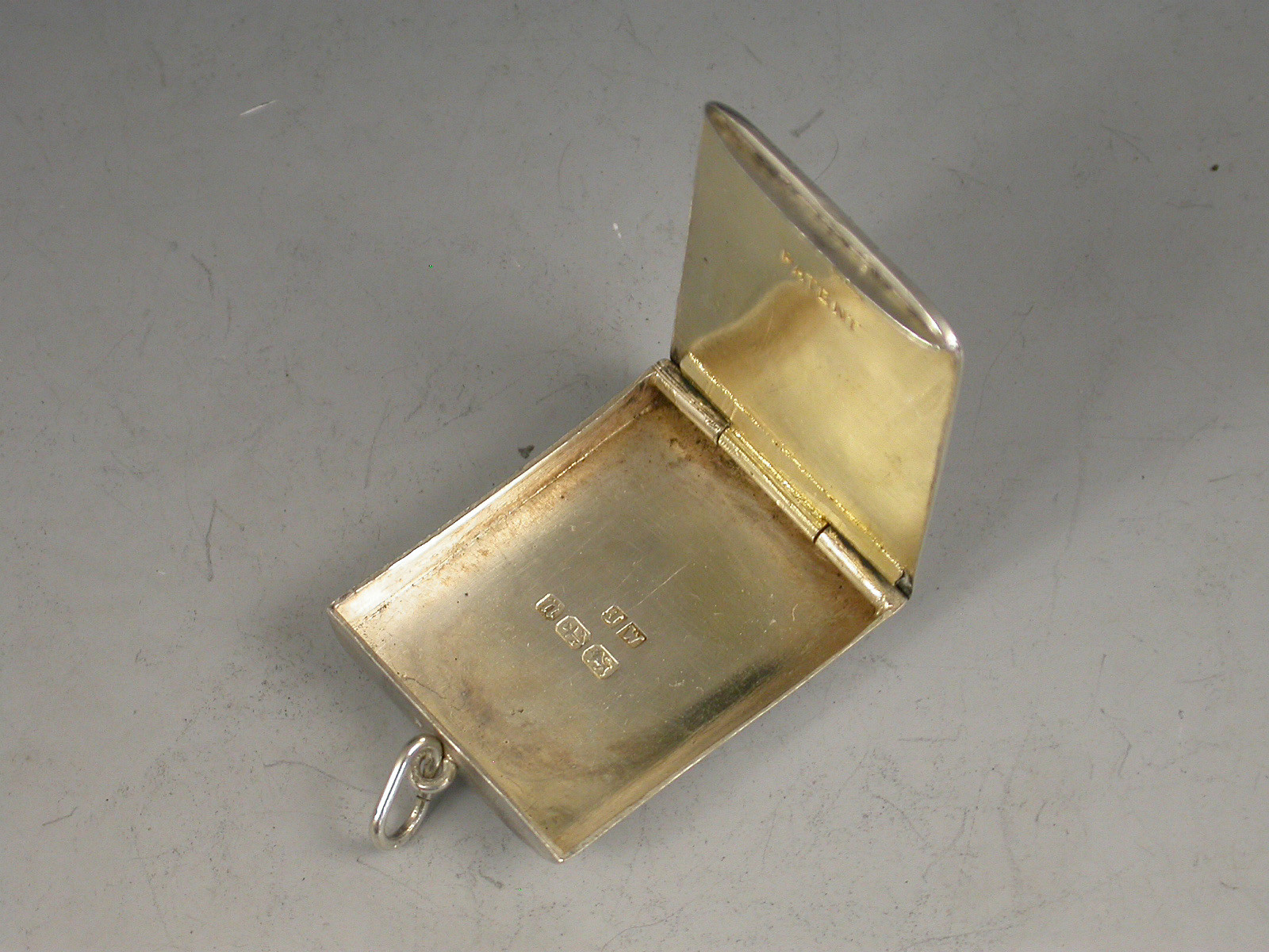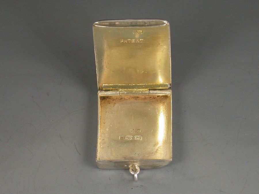 A Victorian silver Stamp Case of rounded rectangular locket form with hinged cover and attached suspension ring, engraved with ivy leaf decoration surrounding a shield shaped cartouche to the lid, silver gilt interior.