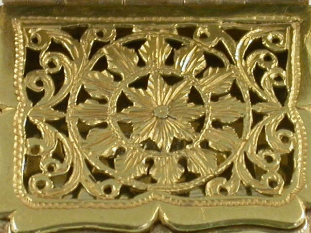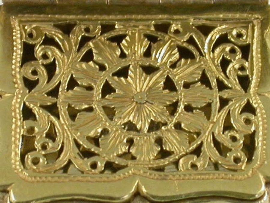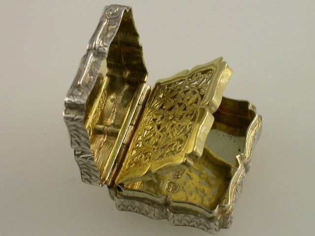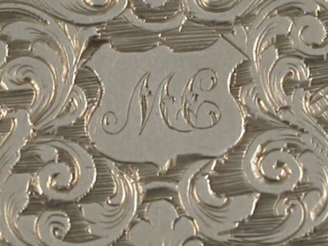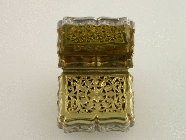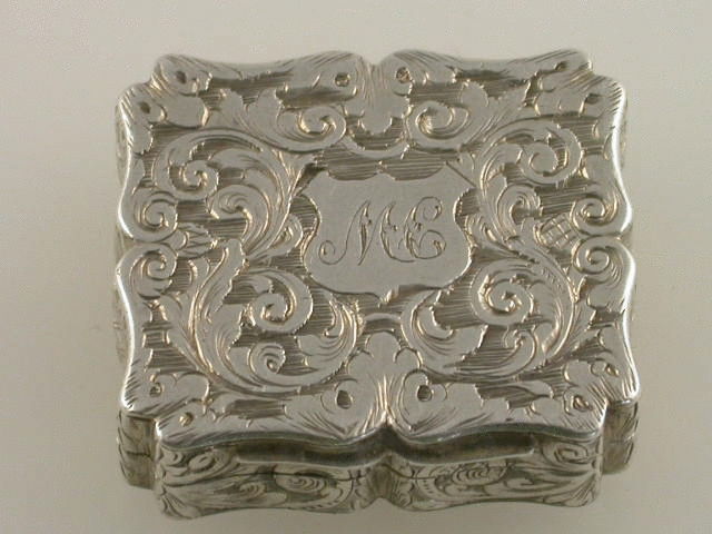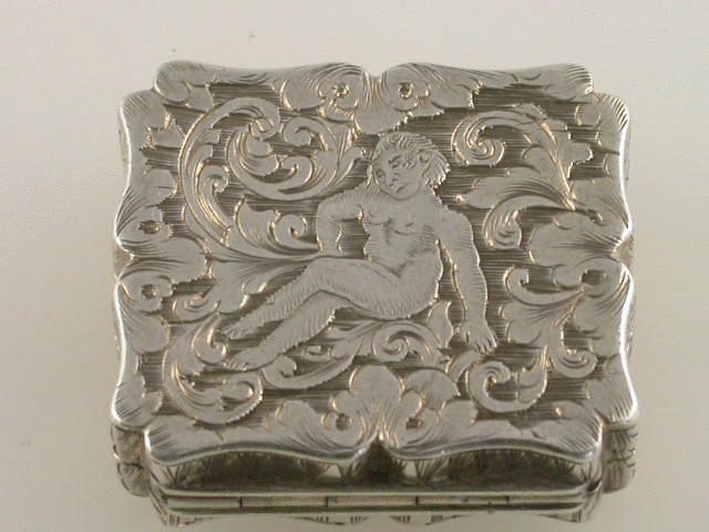 An exquisite early Victorian small silver Vinaigrette of shaped rectangular form, the base very finely engraved with a reclining naked cherub amongst foliate scroll work, the sides with geometric designs, the lid with a central cartouche engraved with contemporary initials MC, and foliate scroll work. The original bright silver gilt interior with superbly pierced grille, unusually opening from front to back.