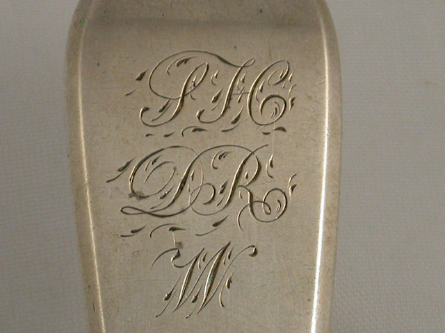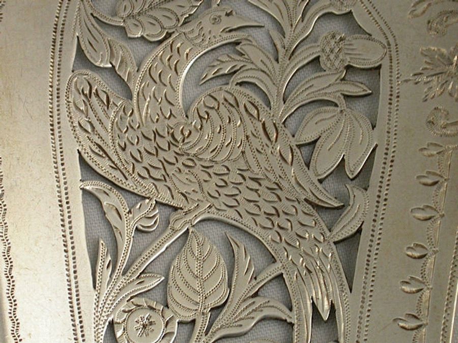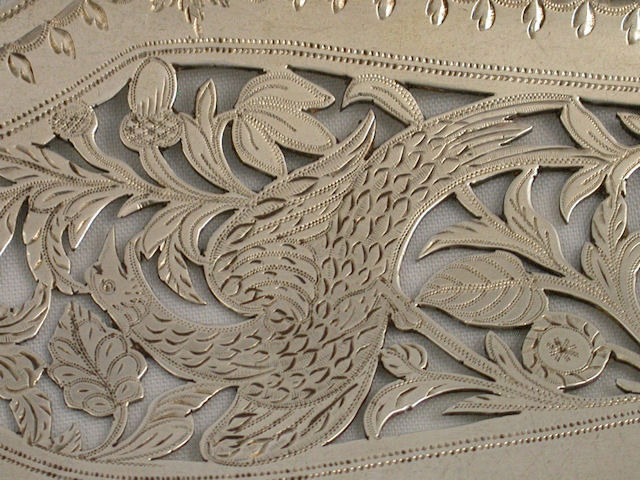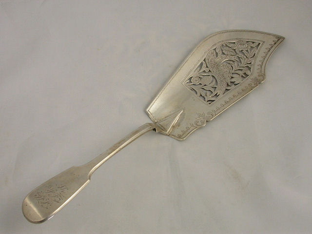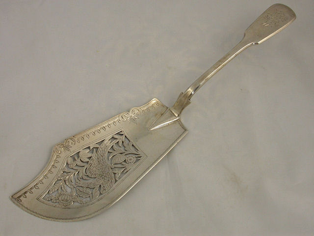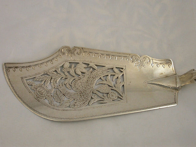 A good quality early Victorian silver Fish Slice of plain fiddle pattern with bevelled edges, the curved shaped blade with bright cut and prick dot engraved decoration, the pierced panel depicting an Exotic Bird amongst flowers and foliage. The handle engraved with contemporary initials.