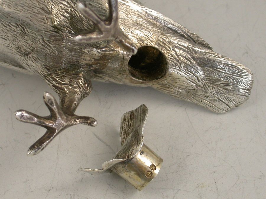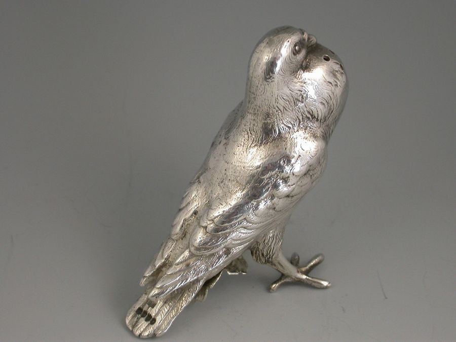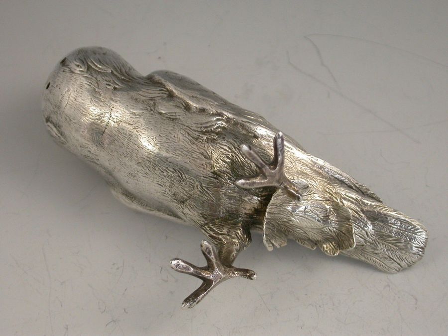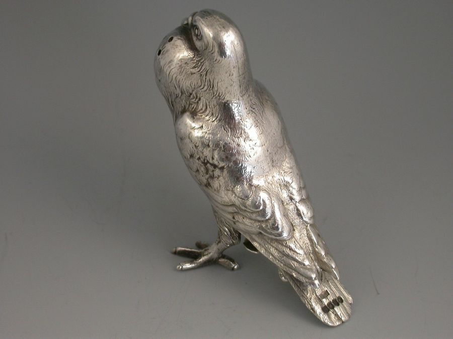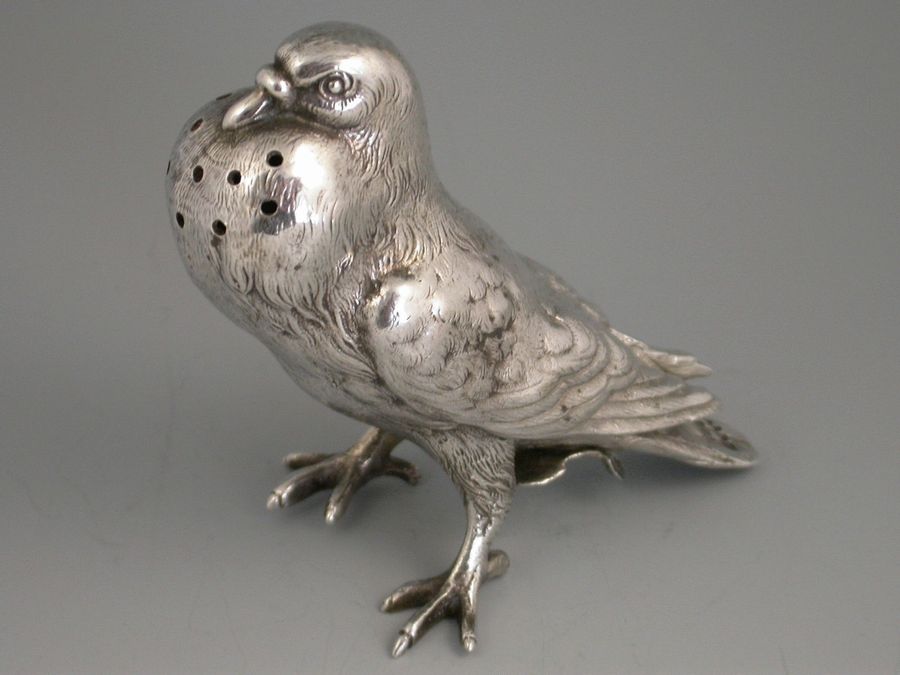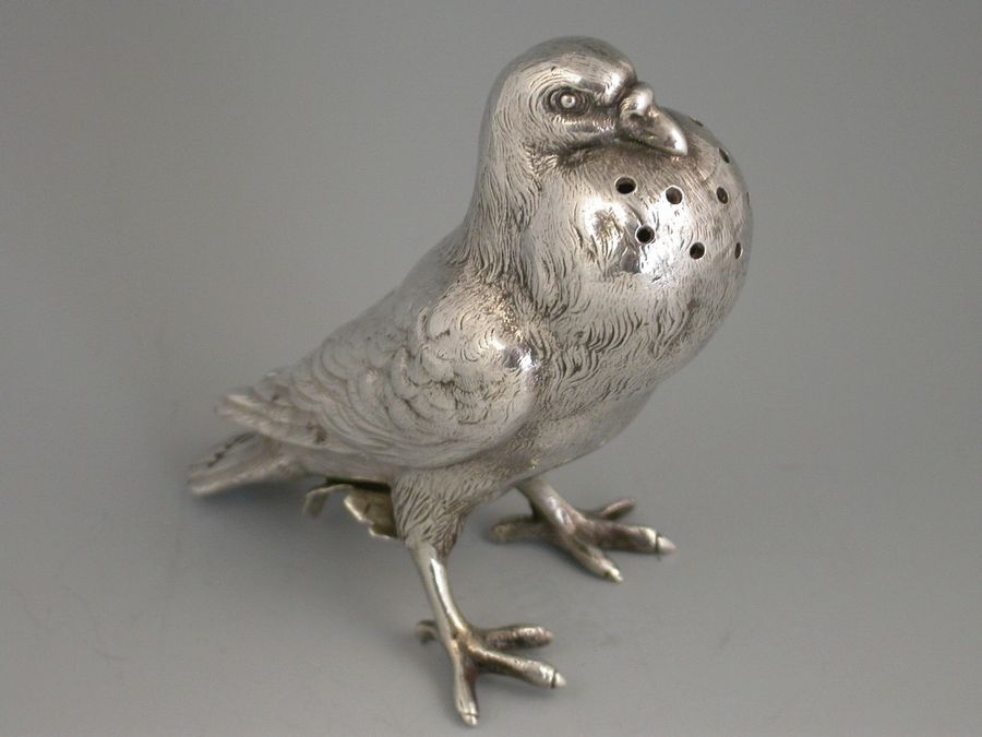 A fine and rare Victorian silver Novelty Pepper formed as a ‘Fancy Pigeon’ with pullout stopper beneath the tail. One of the ""Pouting"" varieties.