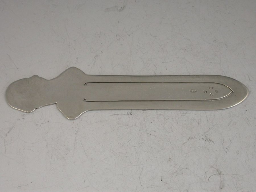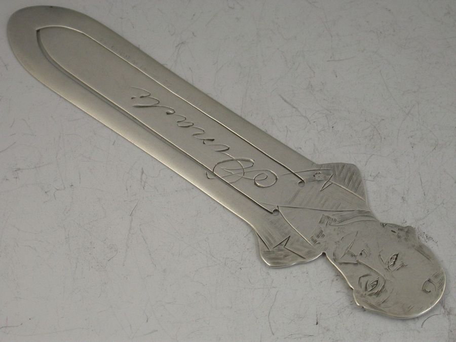 An extremely rare Victorian silver figural Bookmark, the dagger shaped blade engraved ‘Disraeli’, the terminal formed as a bust of Benjamin Disraeli.