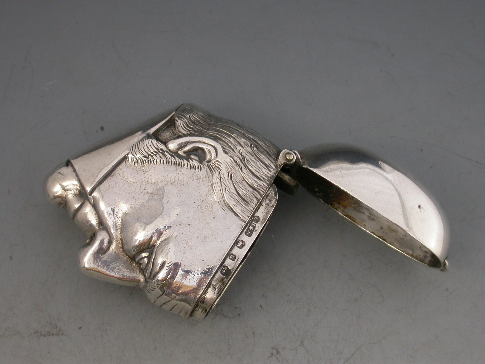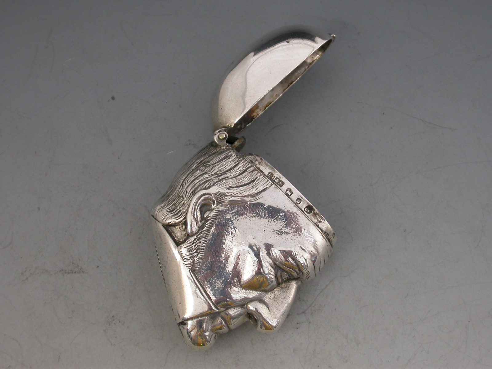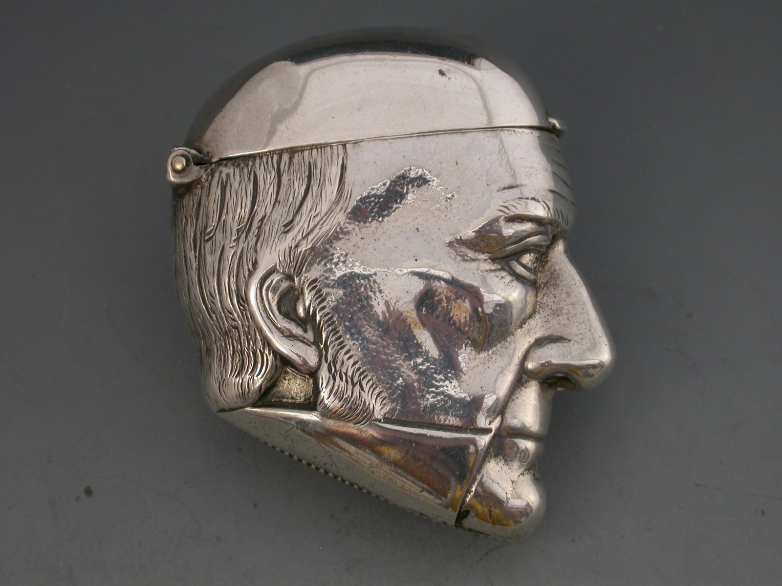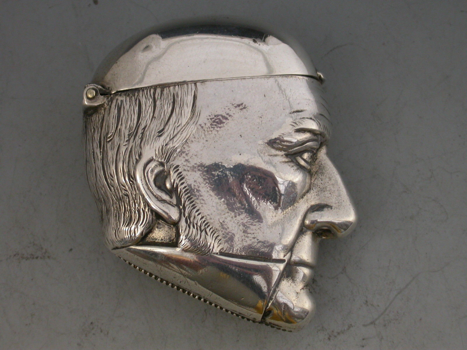 A rare Victorian silver figural Vesta Case depicting a bust of William Gladstone, with hinged flip-top lid and striker to the base.