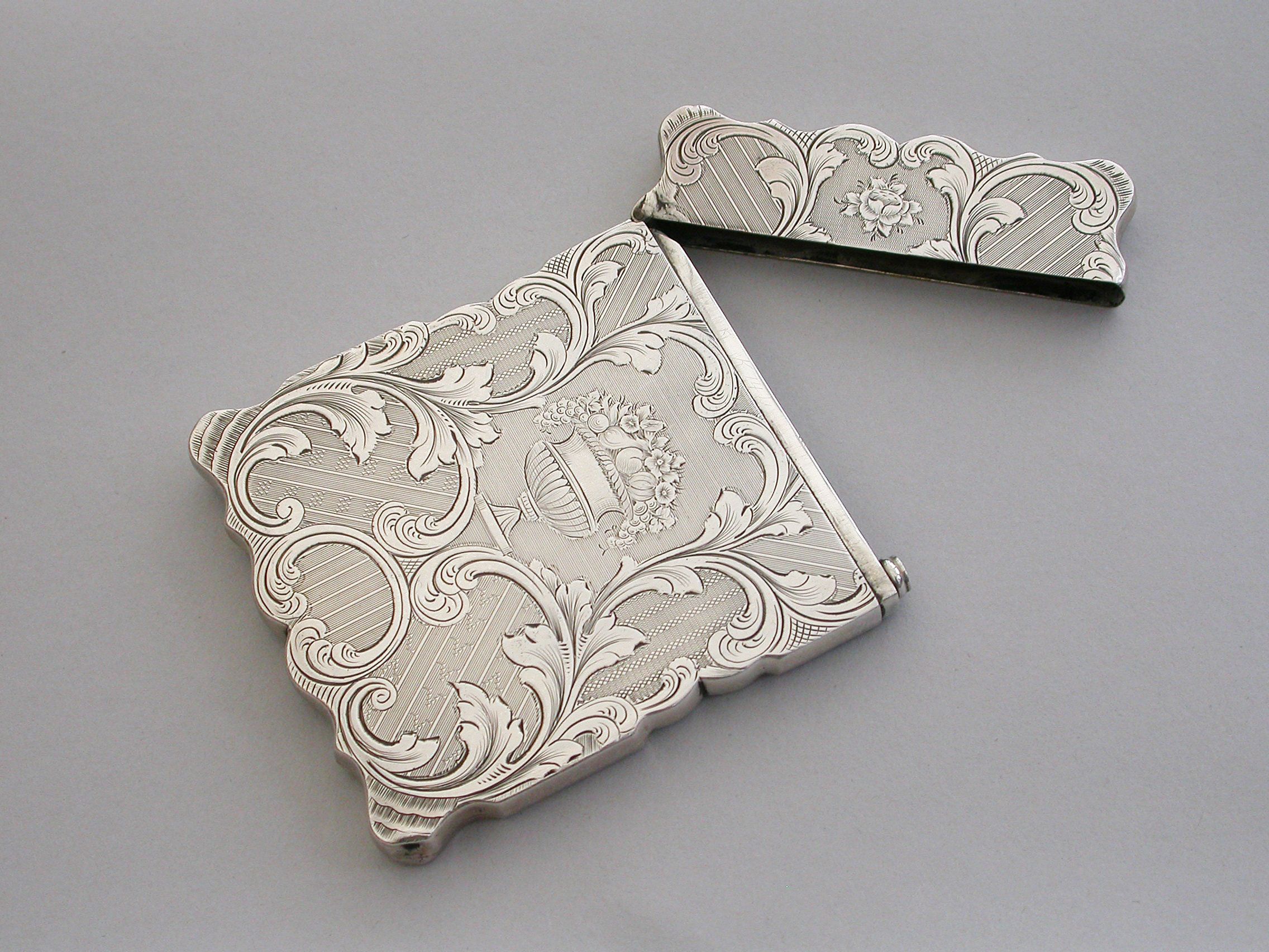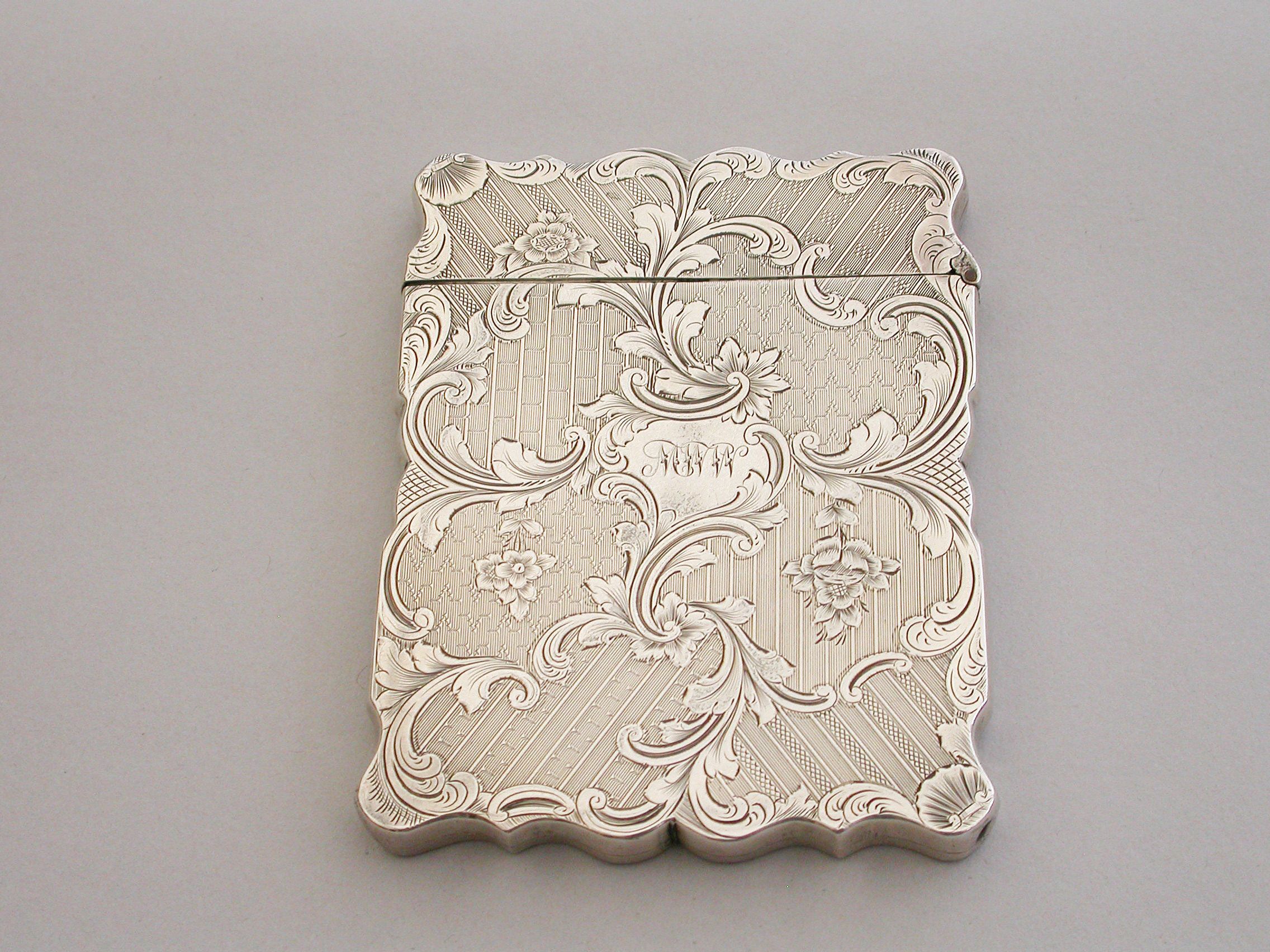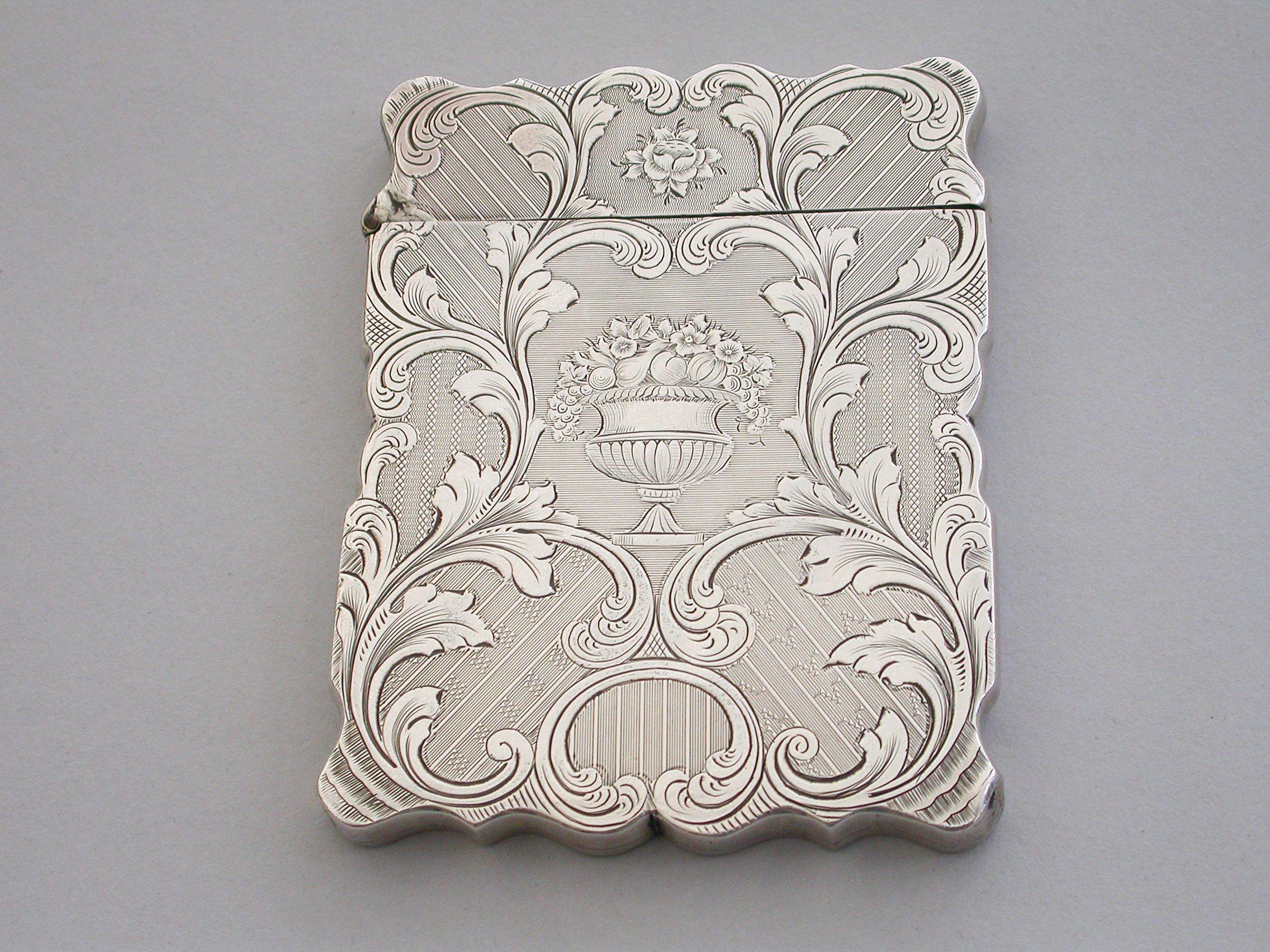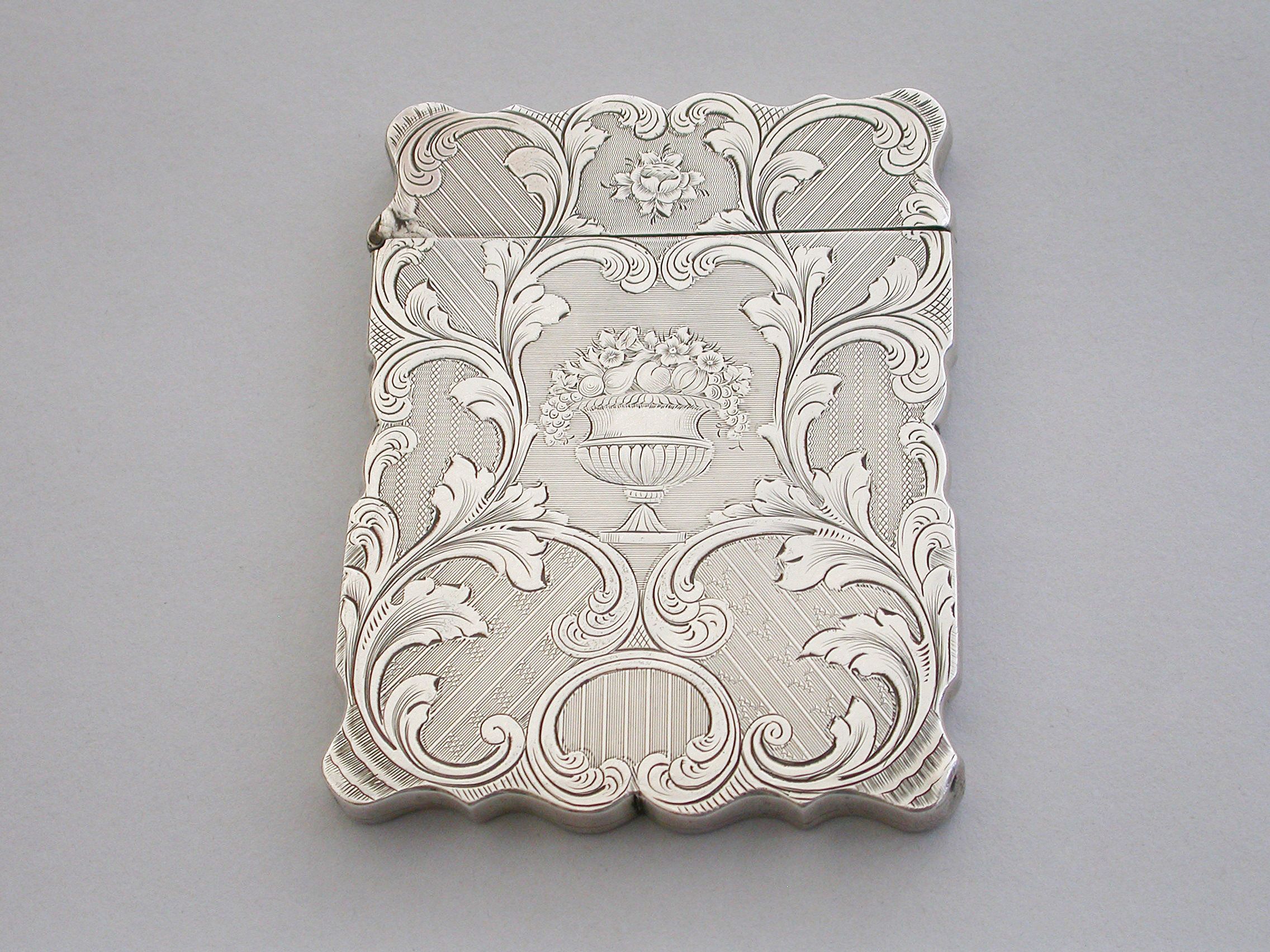 A very finely engraved mid Victorian silver Card Case of shaped rectangular form, both sides divided into sections with multiple different styles of engine turned decoration, foliate scrolls, flowers and shells. The reverse with a shaped cartouche engraved with contemporary script initials, the face engraved to the centre with an overflowing vase of flowers and fruit. The hinged lid opens to a leather lined interior with the addition of a silver propelling pencil.