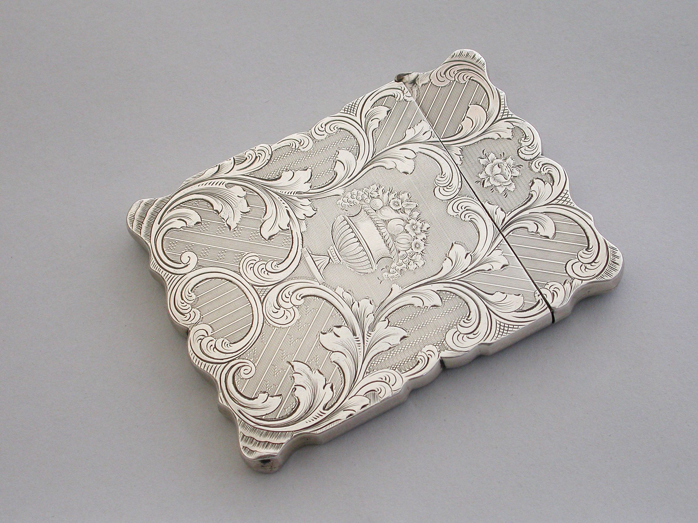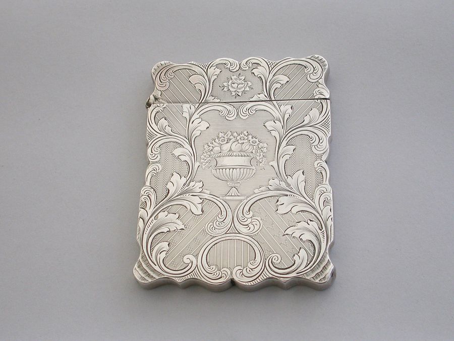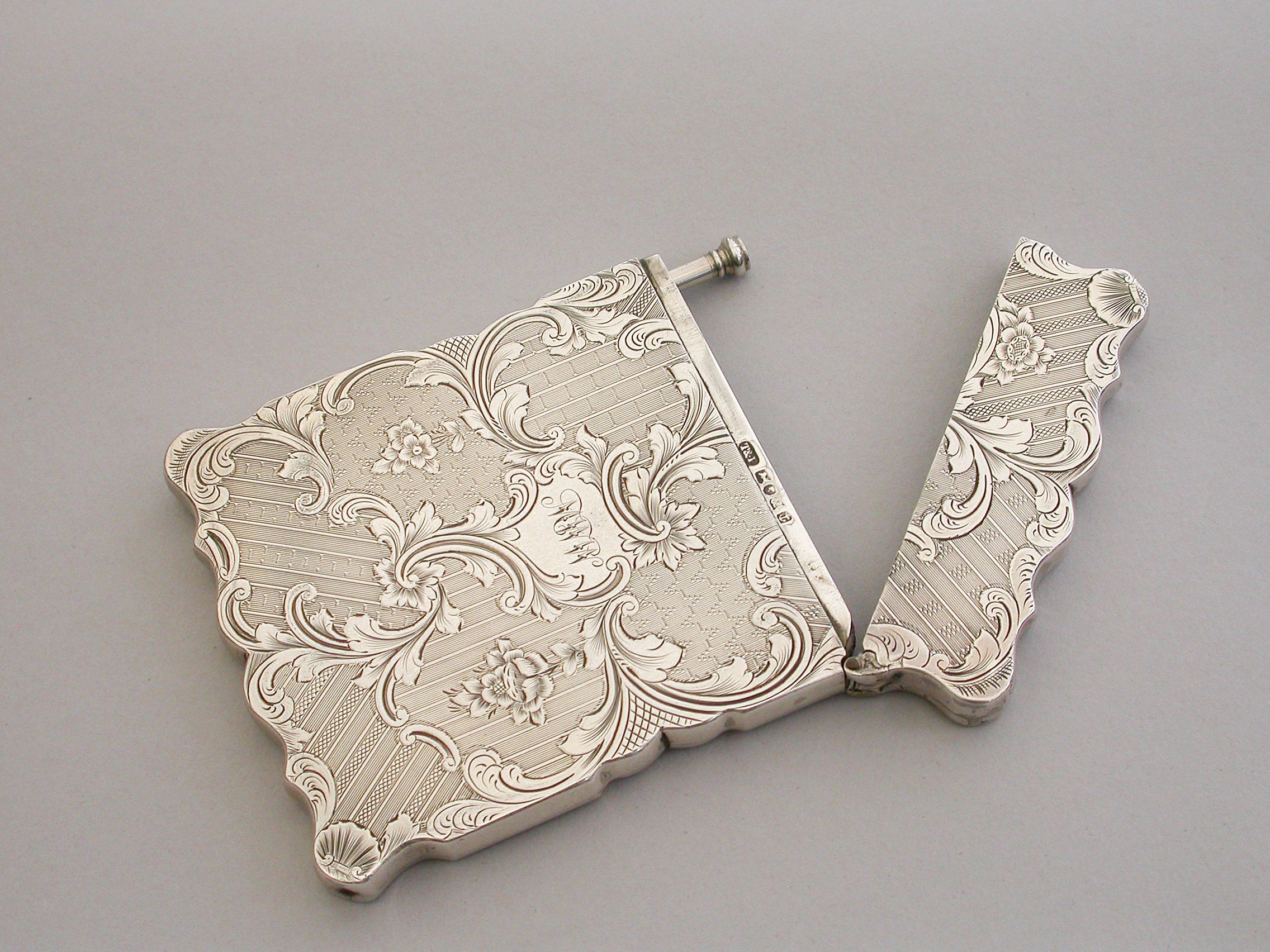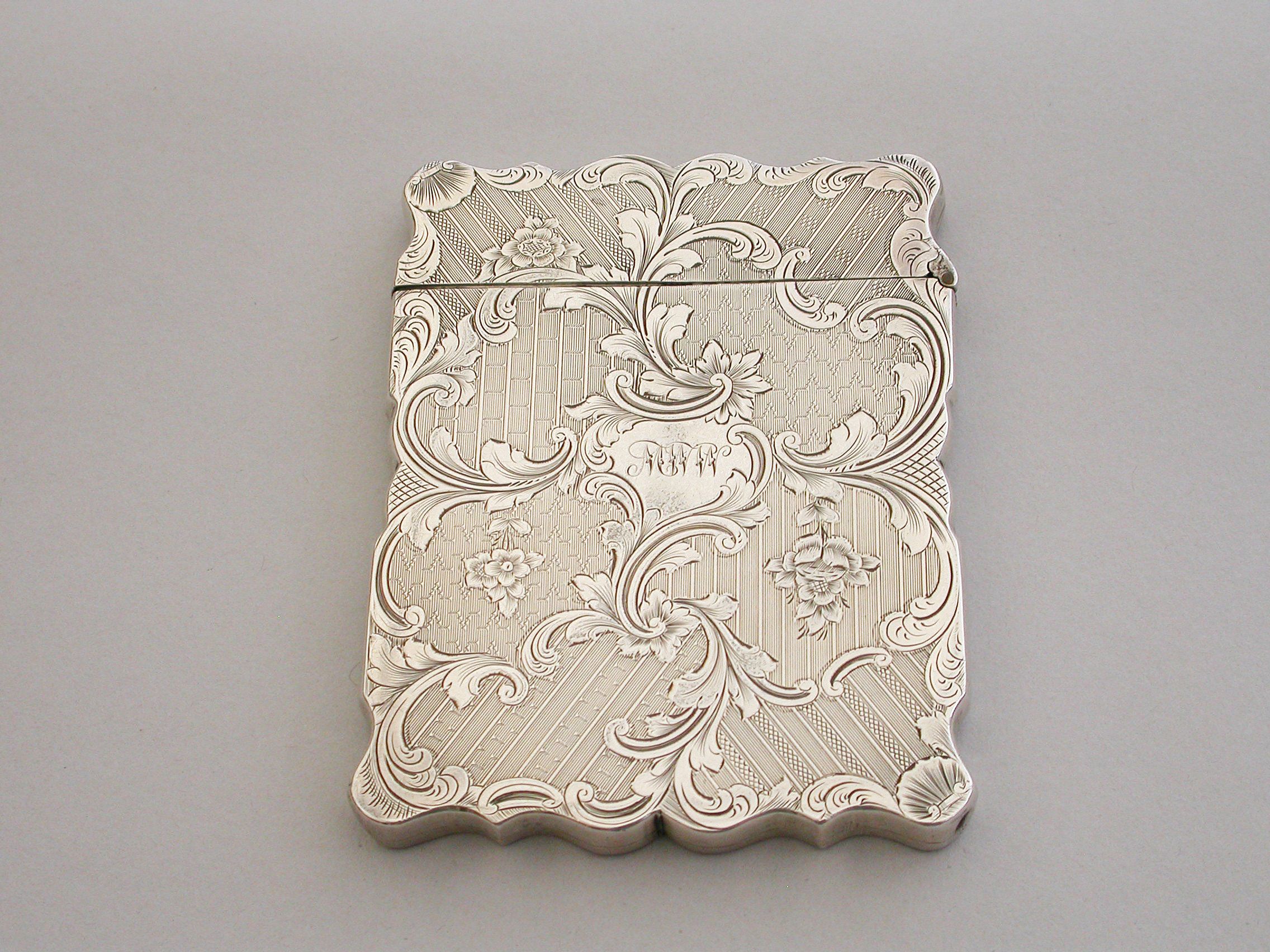 A very finely engraved mid Victorian silver Card Case of shaped rectangular form, both sides divided into sections with multiple different styles of engine turned decoration, foliate scrolls, flowers and shells. The reverse with a shaped cartouche engraved with contemporary script initials, the face engraved to the centre with an overflowing vase of flowers and fruit. The hinged lid opens to a leather lined interior with the addition of a silver propelling pencil.