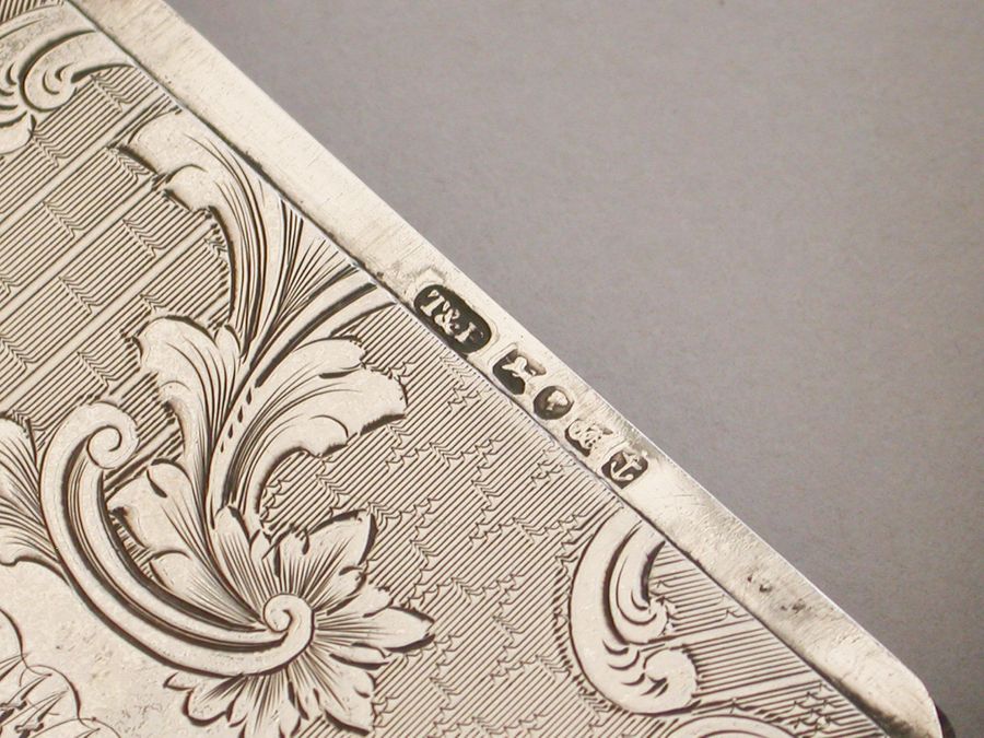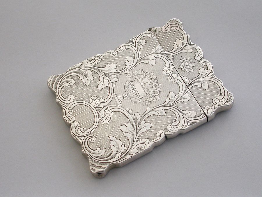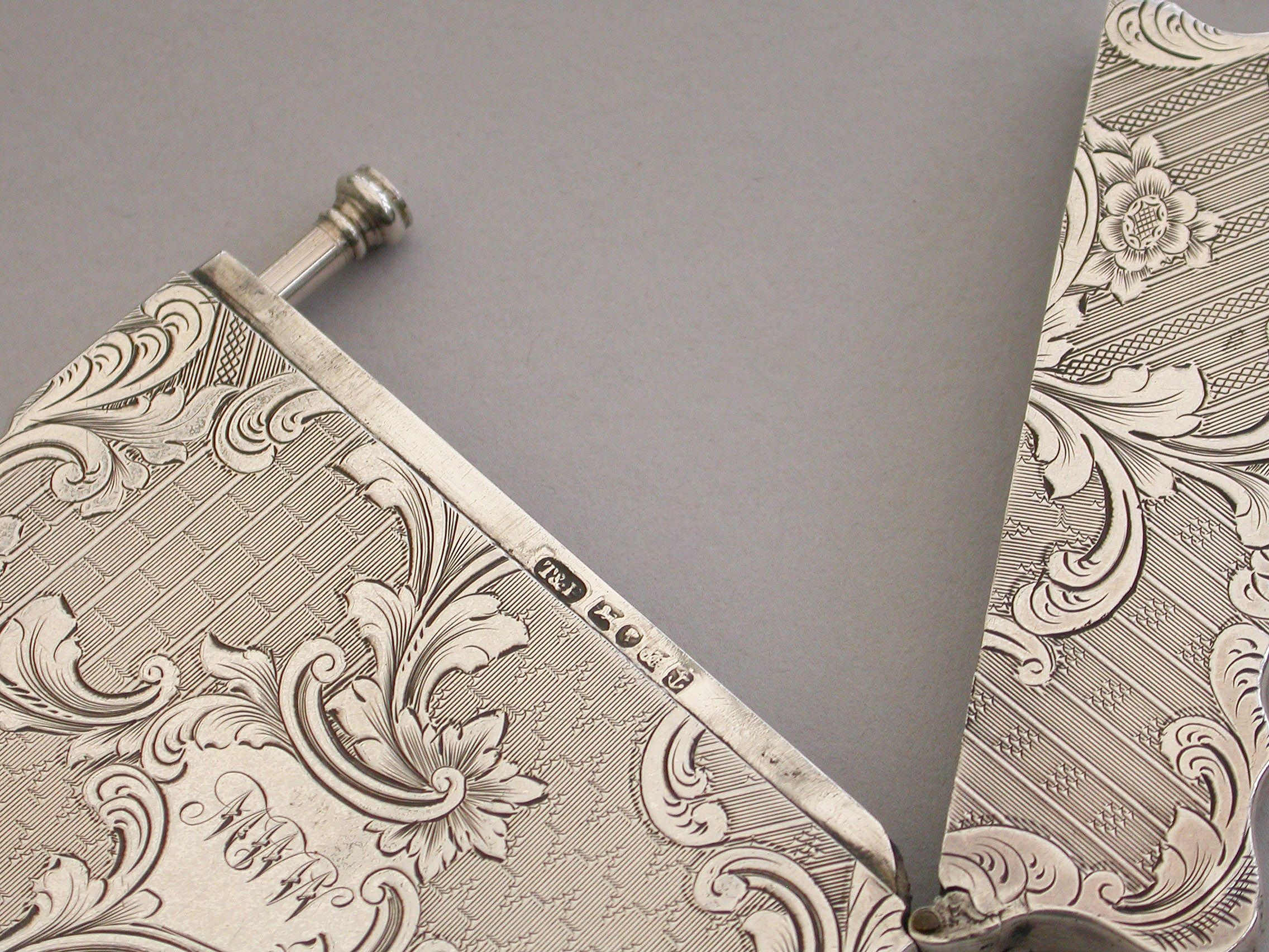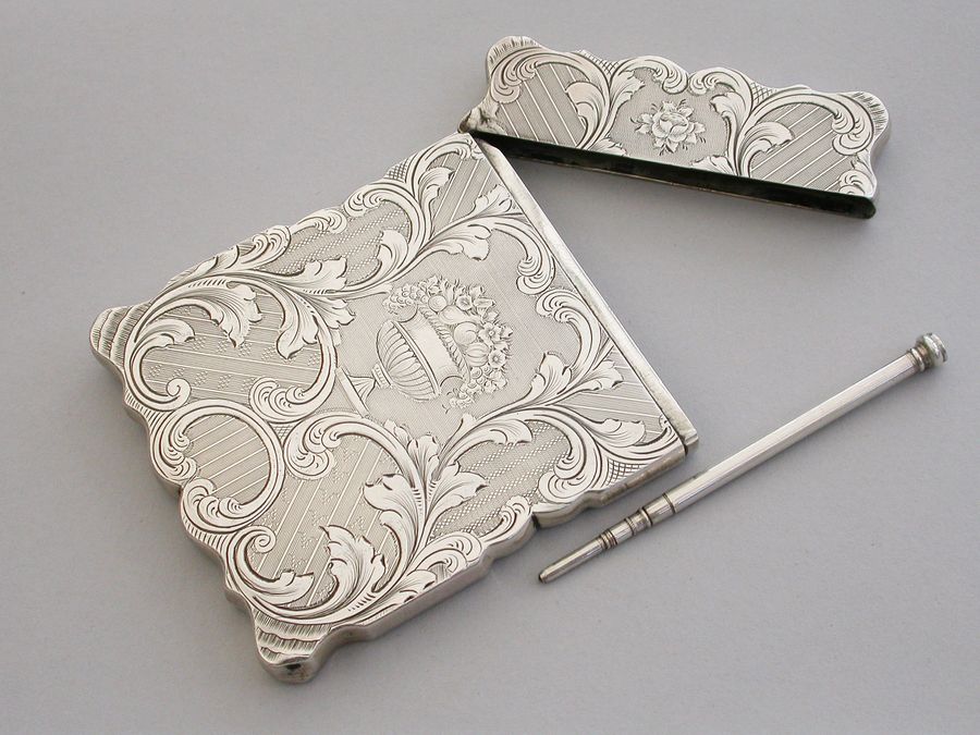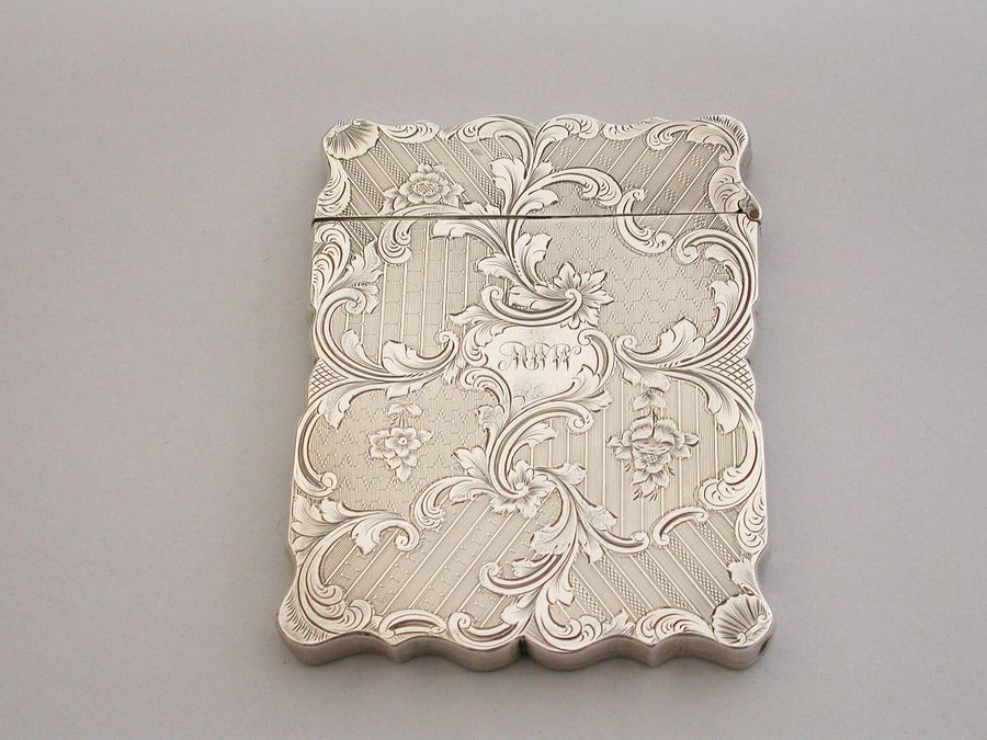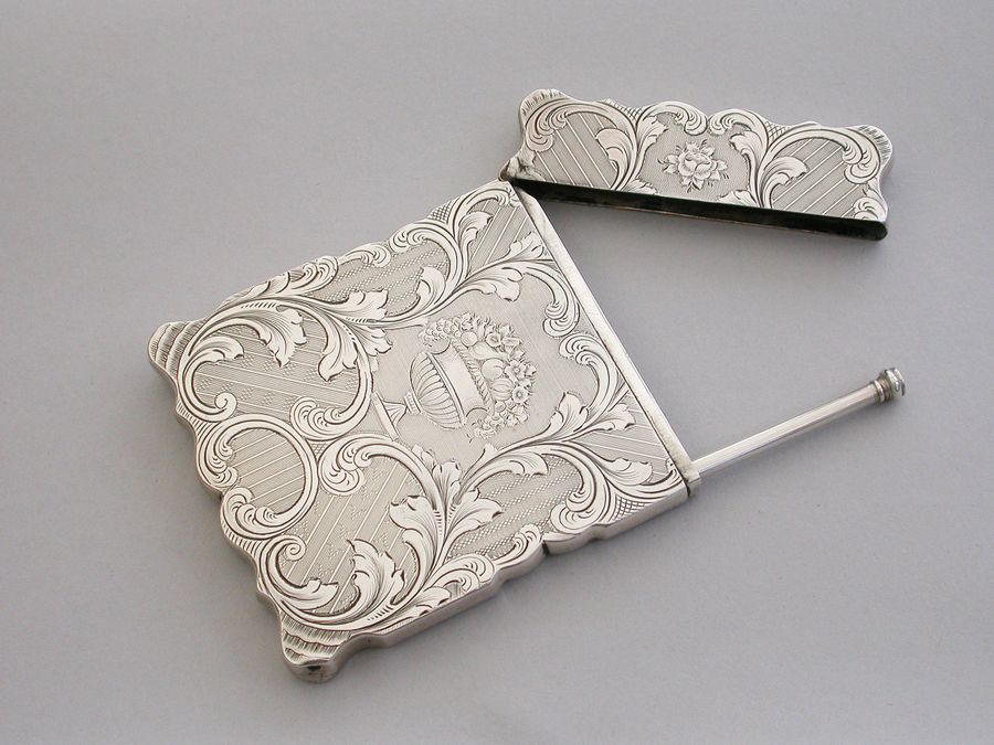 A very finely engraved mid Victorian silver Card Case of shaped rectangular form, both sides divided into sections with multiple different styles of engine turned decoration, foliate scrolls, flowers and shells. The reverse with a shaped cartouche engraved with contemporary script initials, the face engraved to the centre with an overflowing vase of flowers and fruit. The hinged lid opens to a leather lined interior with the addition of a silver propelling pencil.