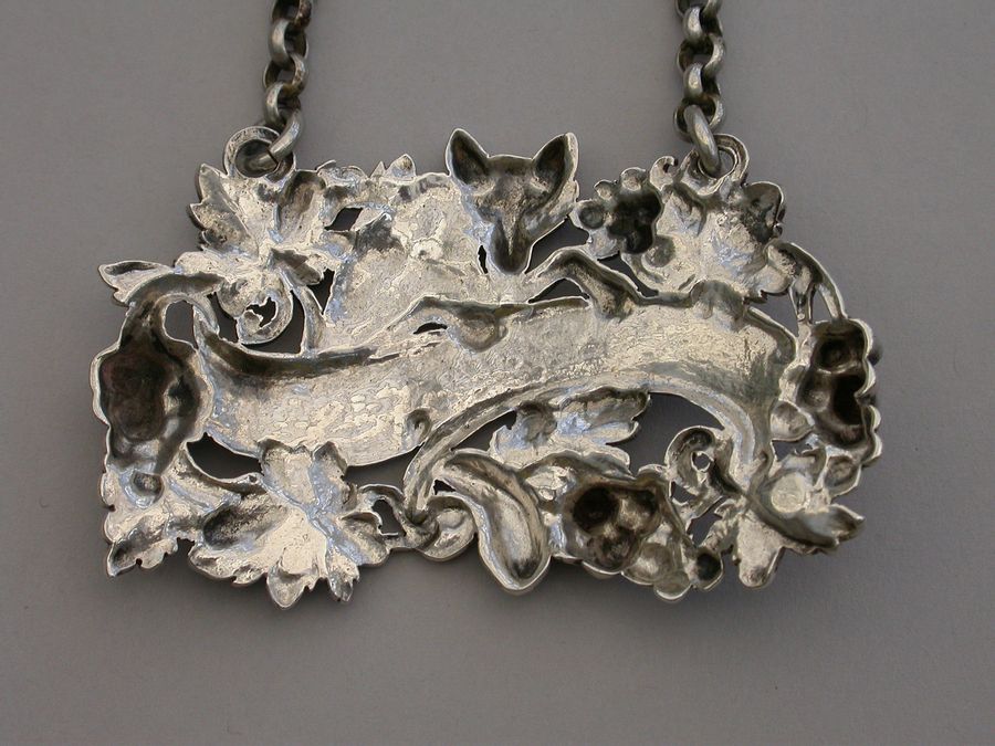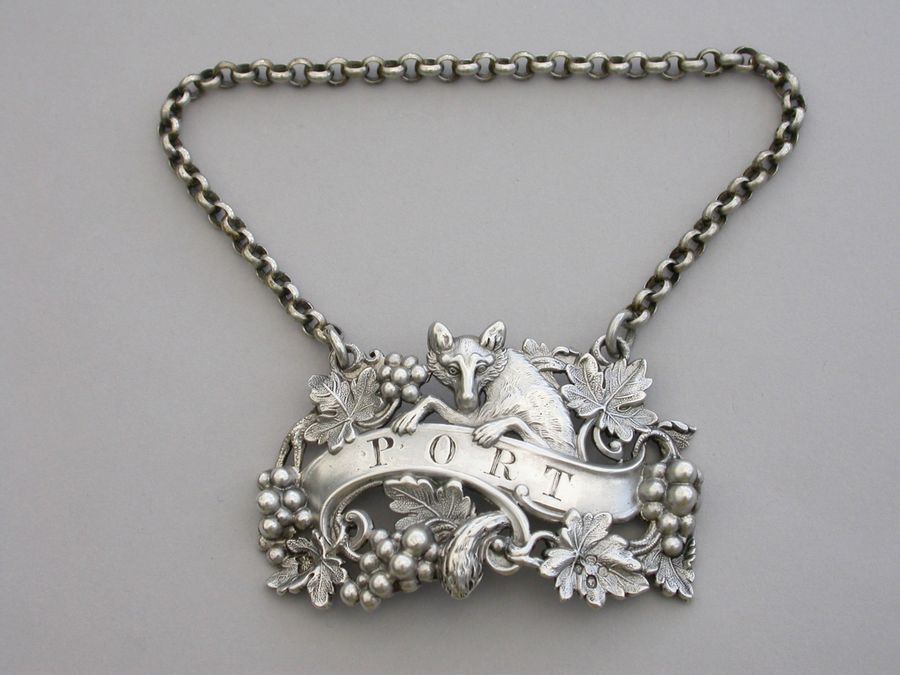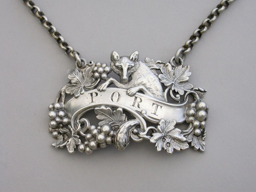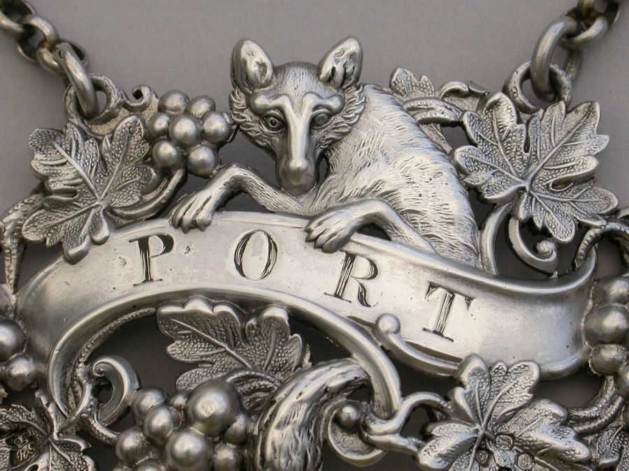 An extremely rare and fine quality Victorian cast silver Wine Label, depicting a curious fox amongst vine leaves and grapes, climbing over a scrolled name plate incised for Port.