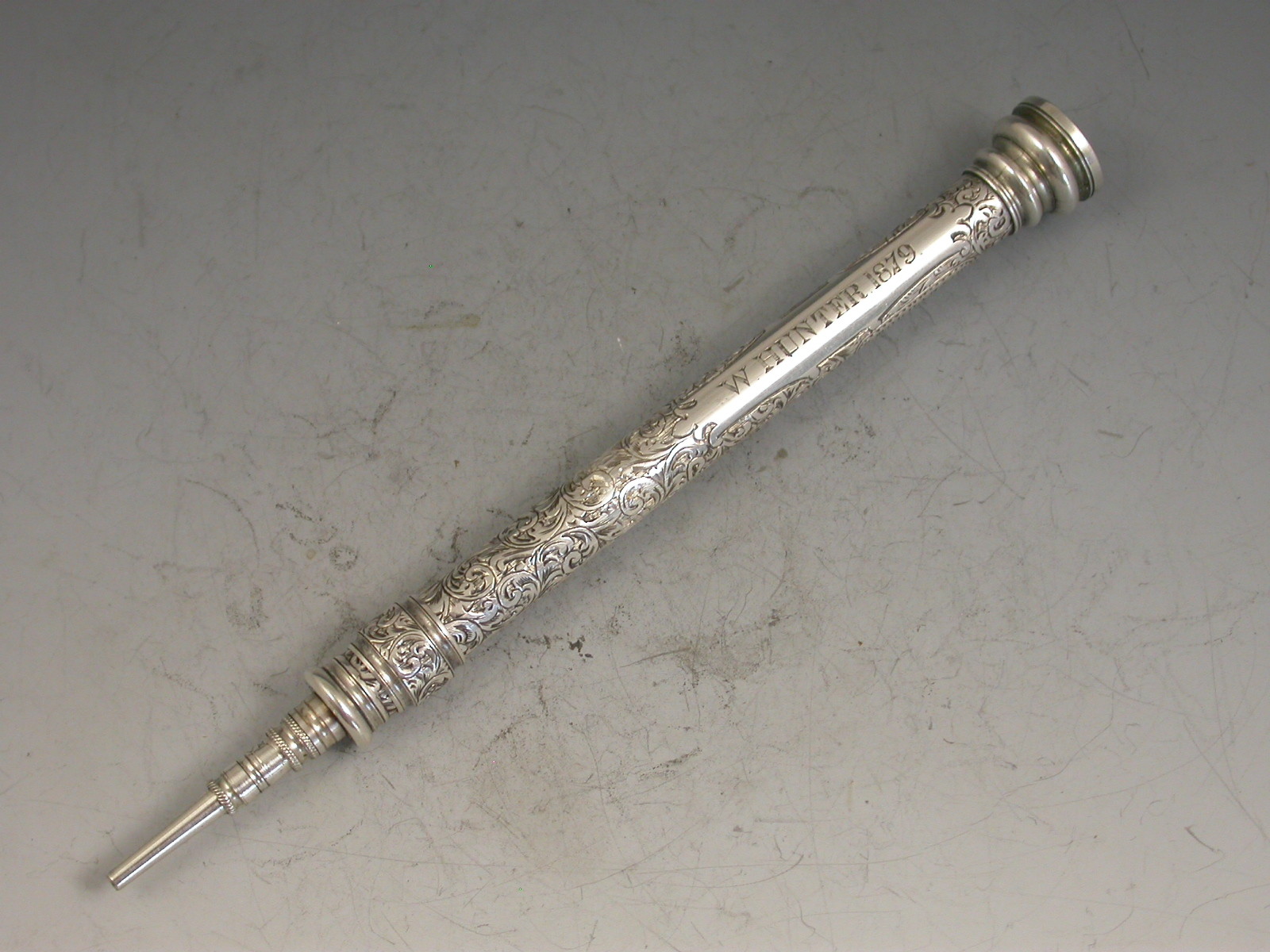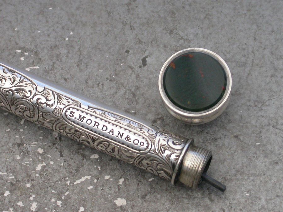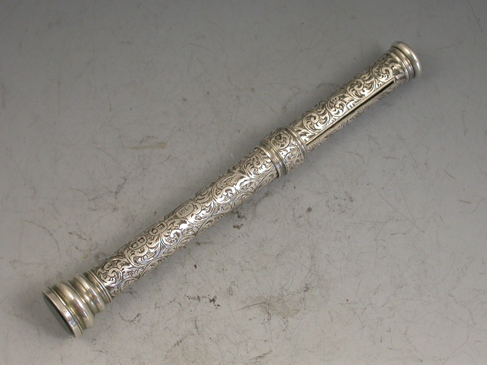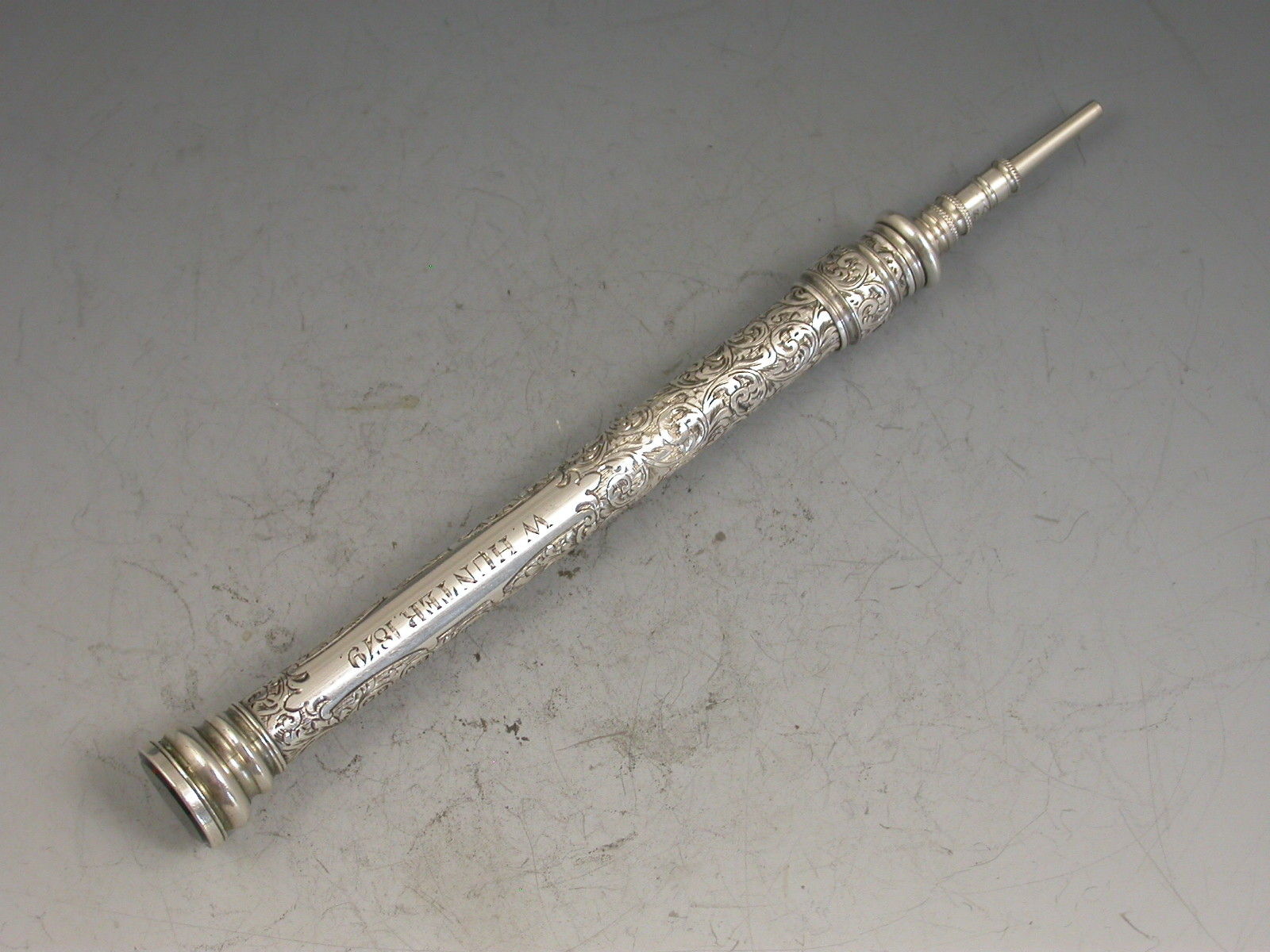 A good quality Victorian fully hallmarked silver sliding Propelling Pencil, the cylindrical body with deep foliate scroll engraved decoration, an engraved cartouche with the owners name, the screw-off seal terminal set with a bloodstone.