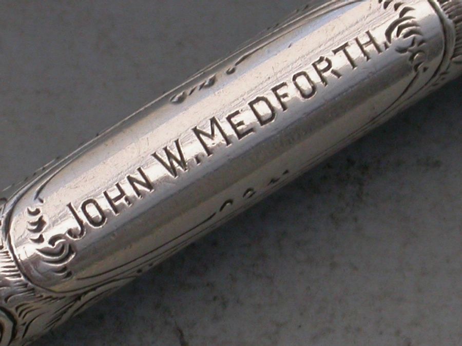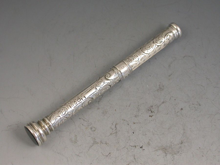 A good quality Victorian fully hallmarked silver sliding Propelling Pencil, the cylindrical body with deep foliate scroll engraved decoration, an engraved cartouche with the owners name, the screw-off seal terminal set with a bloodstone.