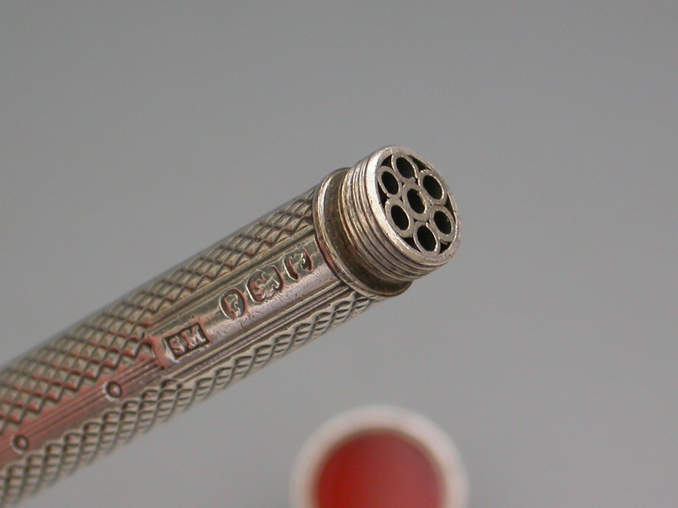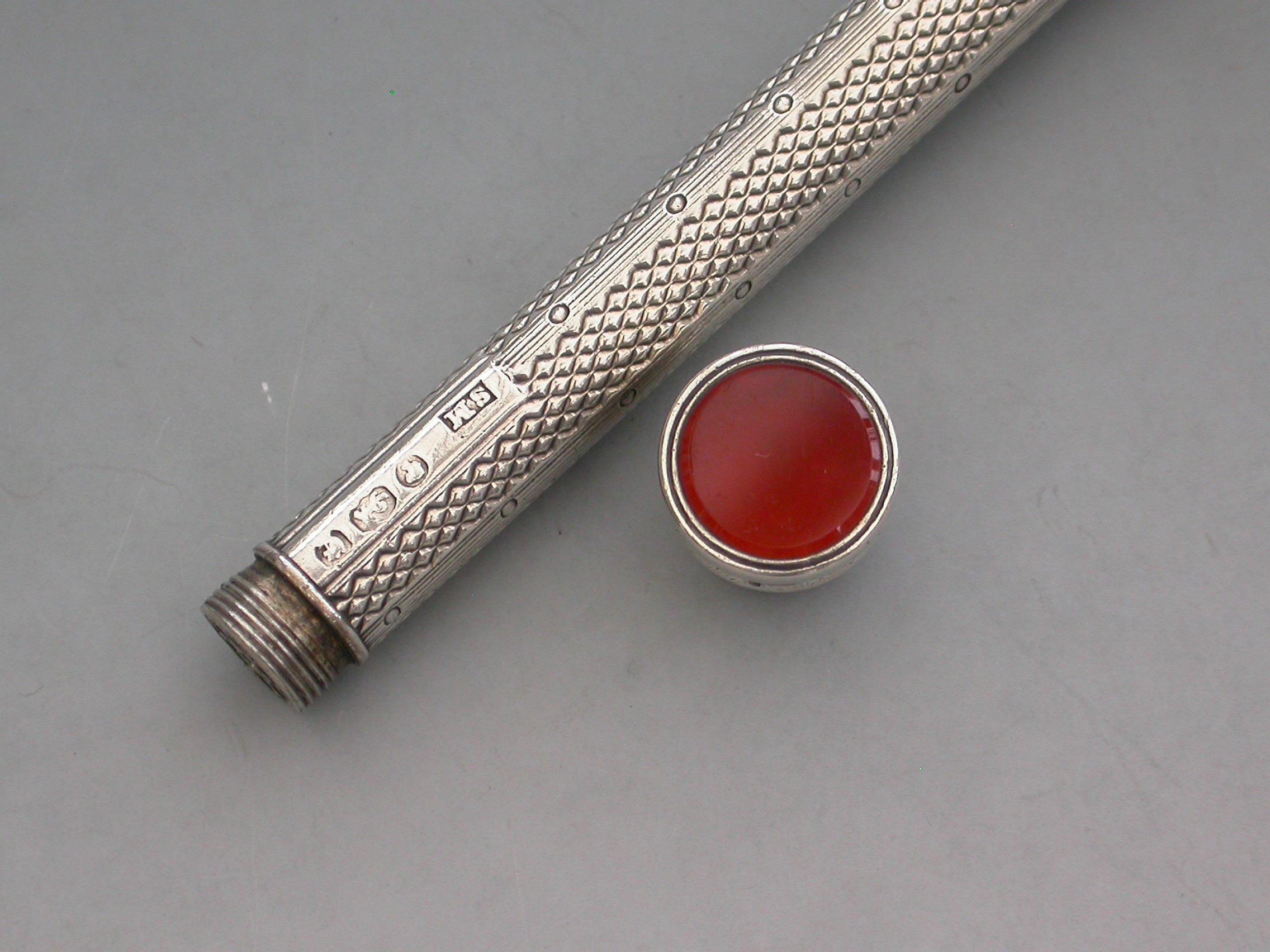 A good quality Victorian fully hallmarked silver sliding Propelling Pencil, the cylindrical body with line and dot and barley corn decoration which is continued on the plain circular slider. The seal terminal set with an amber agate stone and unscrewing to reveal a rifled lead reservoir.
