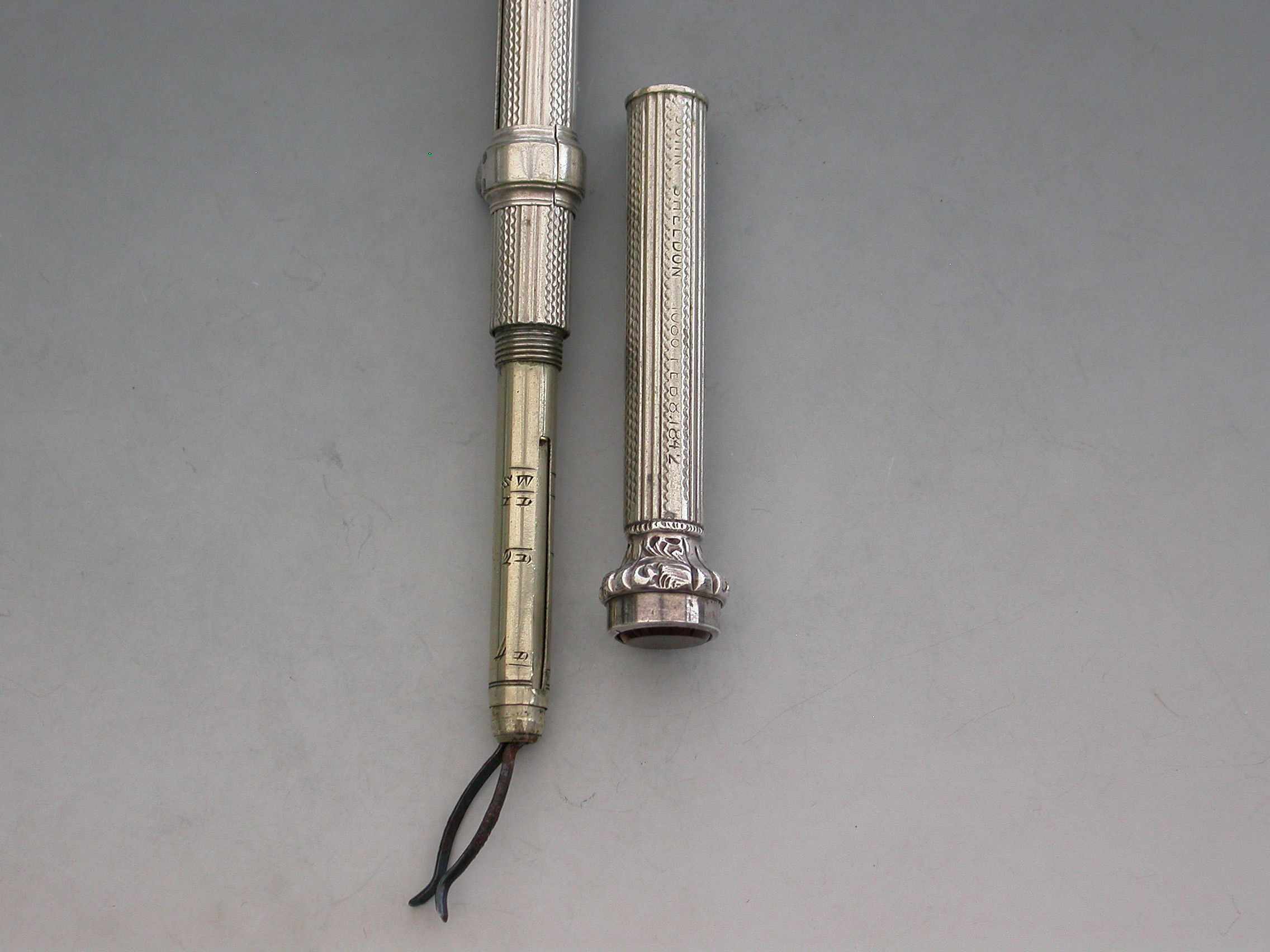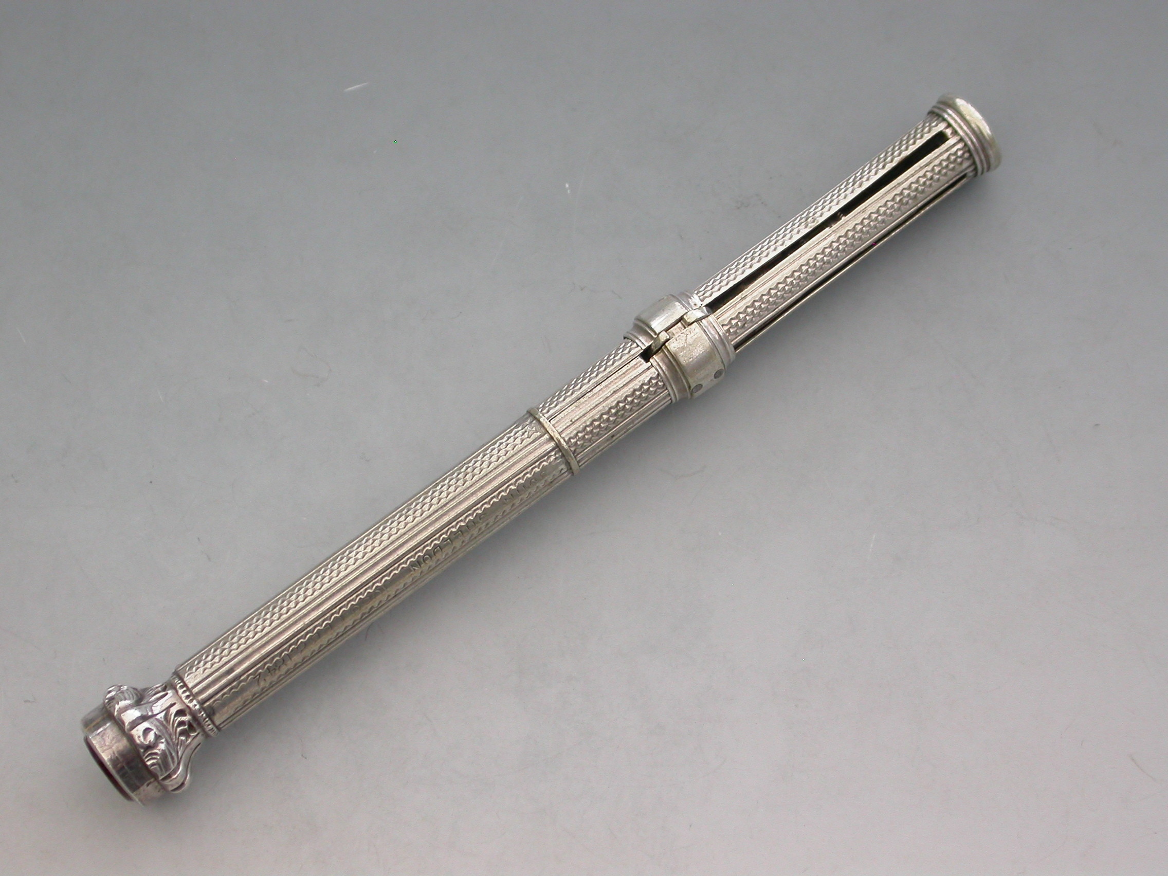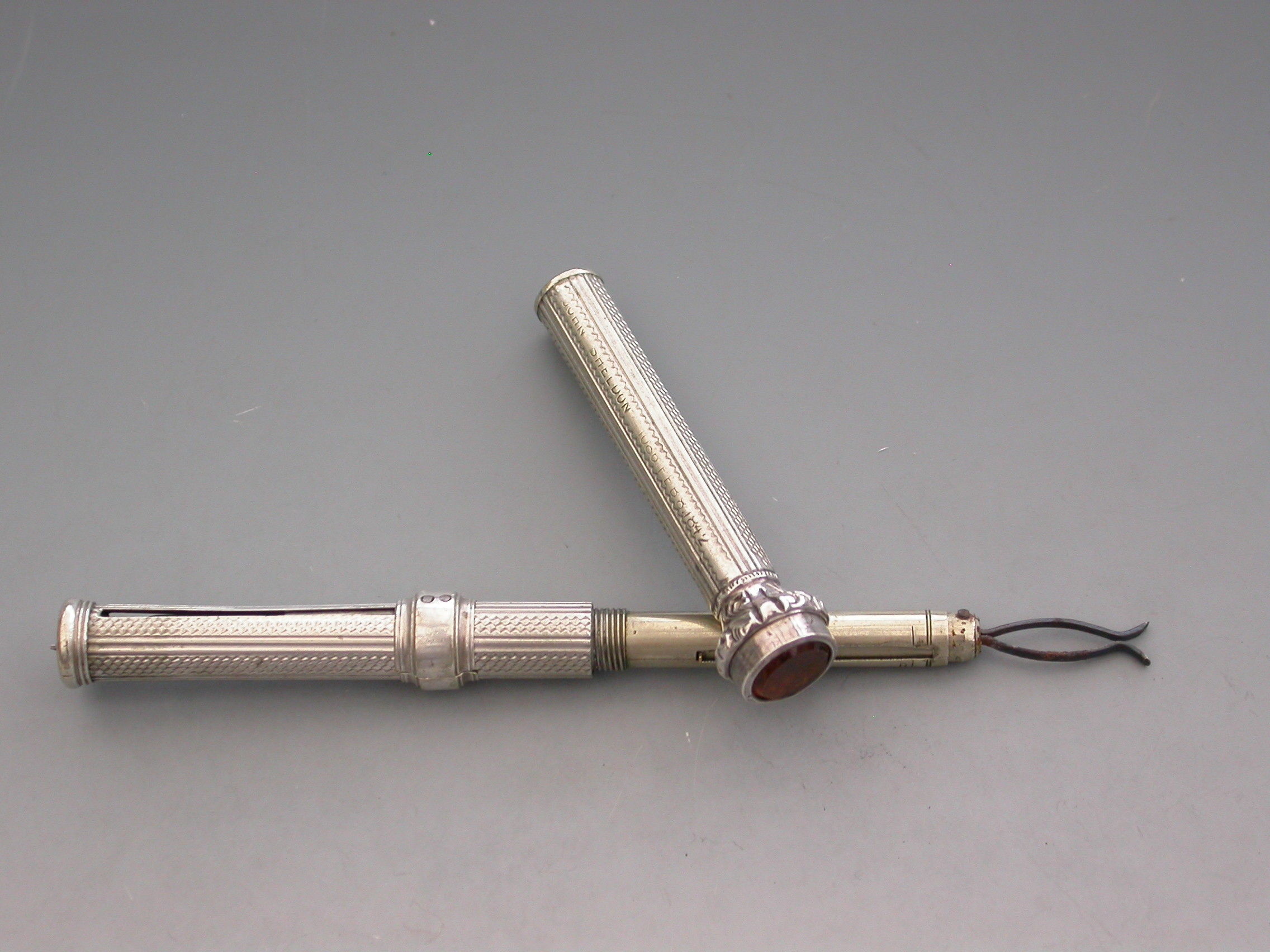A rare Victorian ""German Silver"" Patent ""Unique Pocket Companion"" with engine turned and reeded decoration to the body. The pocket companion comprises at one end, a slide out steel pen holder, a pencil and toothpick combined with a half sovereign gauge. At the opposite end is a seal terminal set with an amber coloured stone. The case also unscrews at the centre to reveal the letter and coin balance which is graduated 1D to 4D.