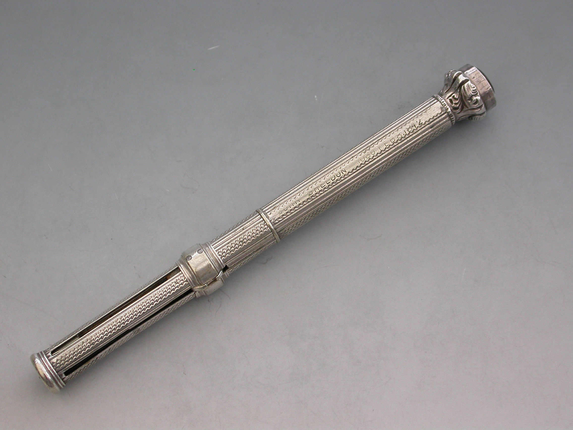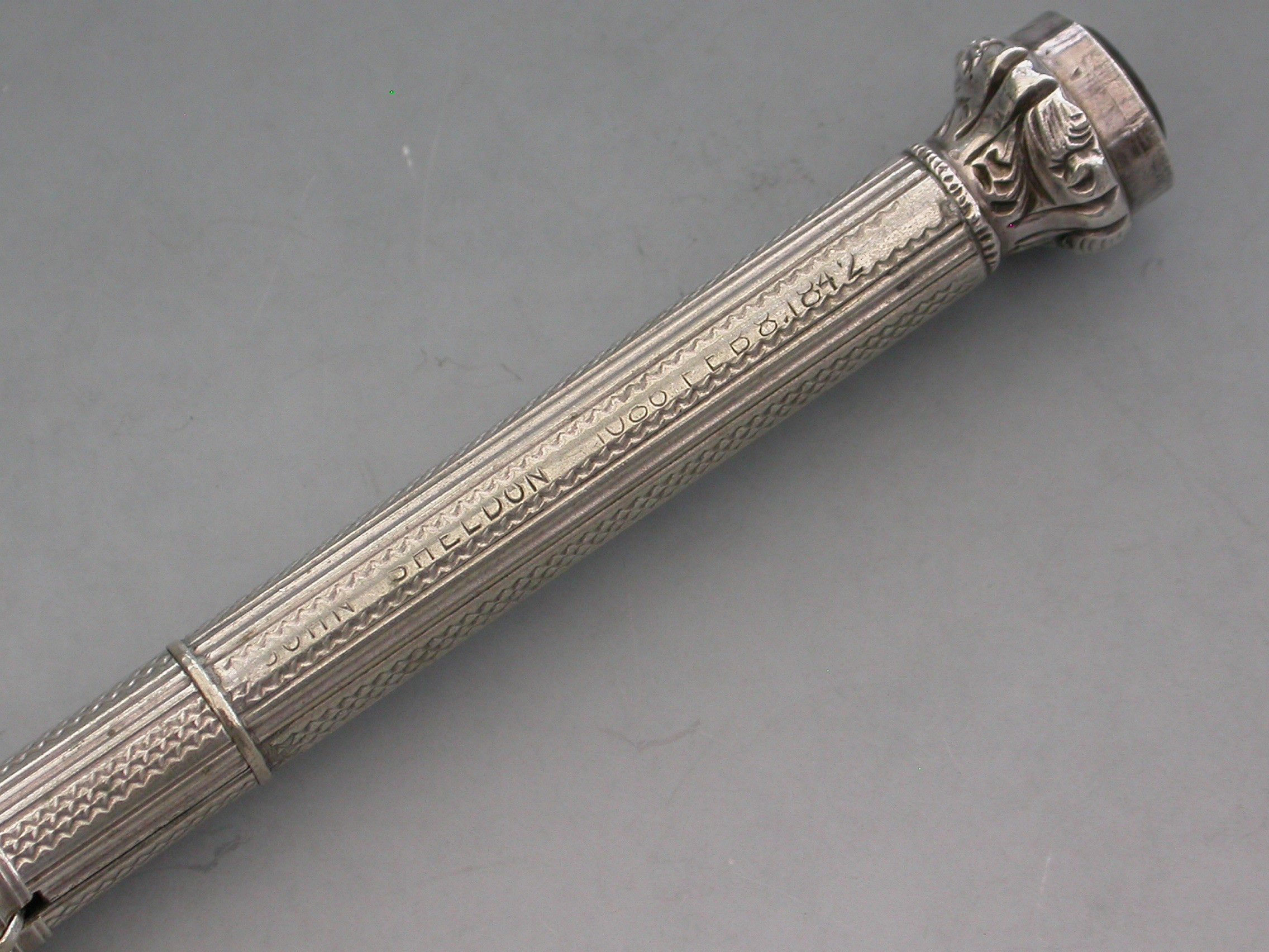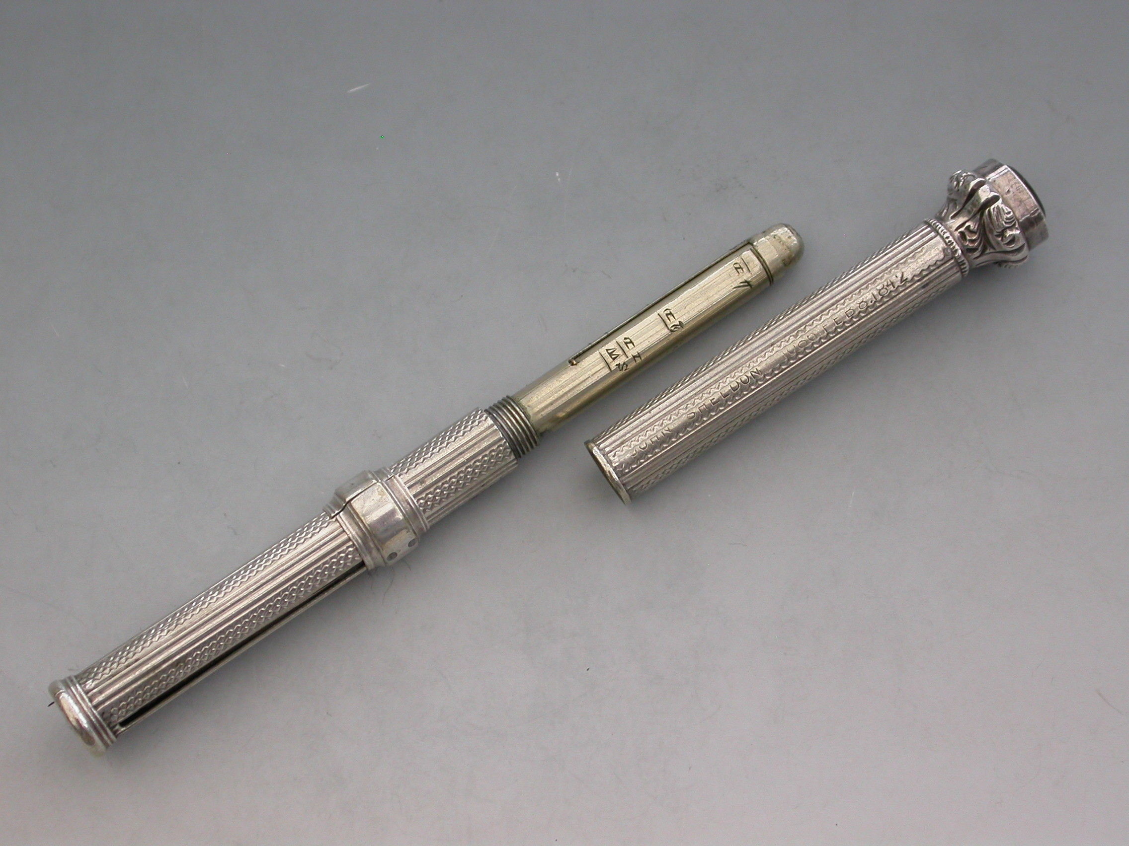 A rare Victorian ""German Silver"" Patent ""Unique Pocket Companion"" with engine turned and reeded decoration to the body. The pocket companion comprises at one end, a slide out steel pen holder, a pencil and toothpick combined with a half sovereign gauge. At the opposite end is a seal terminal set with an amber coloured stone. The case also unscrews at the centre to reveal the letter and coin balance which is graduated 1D to 4D.