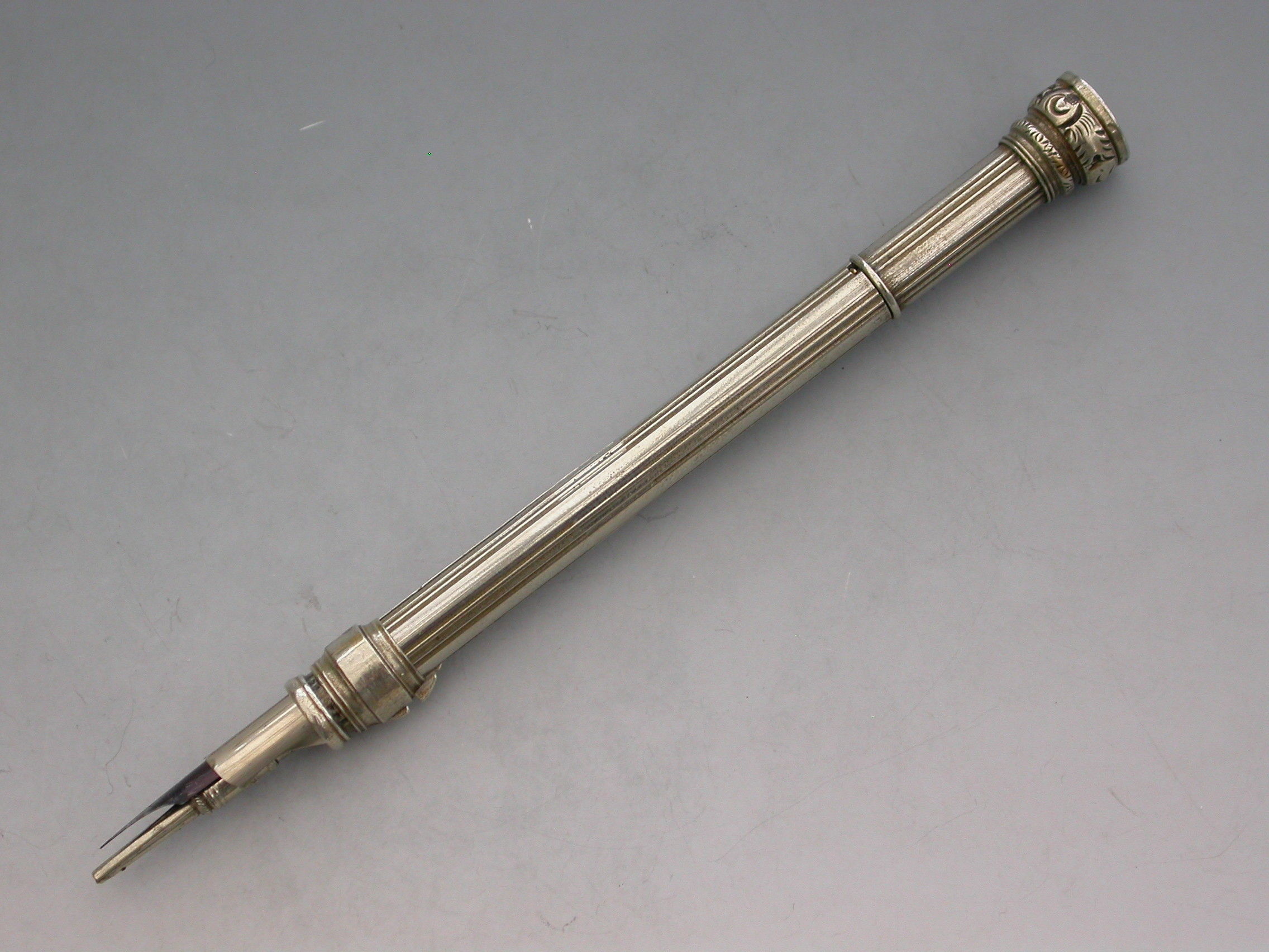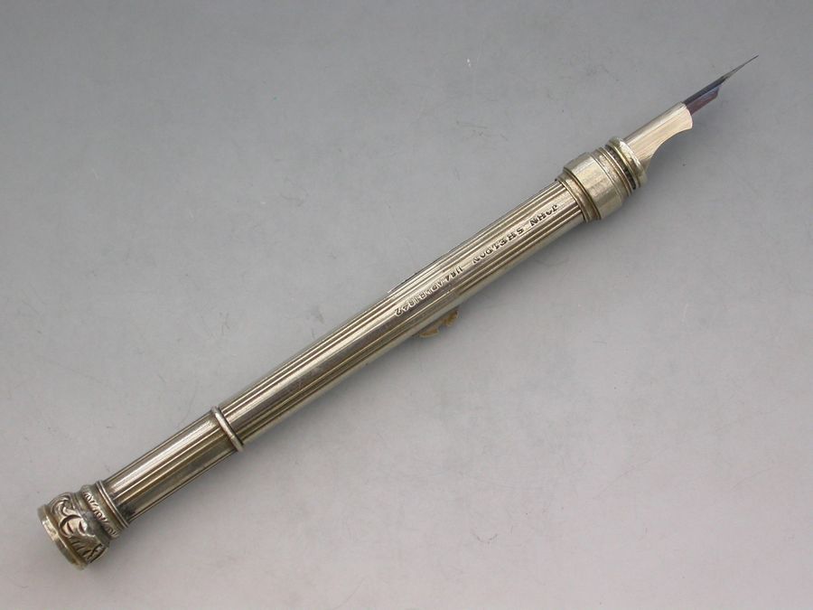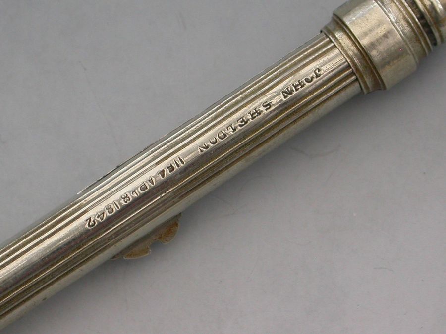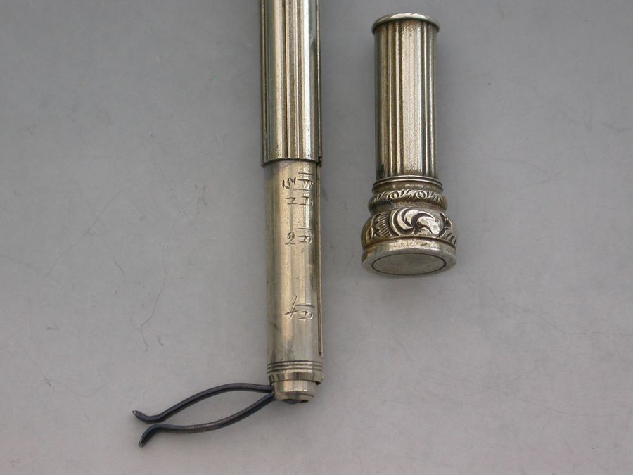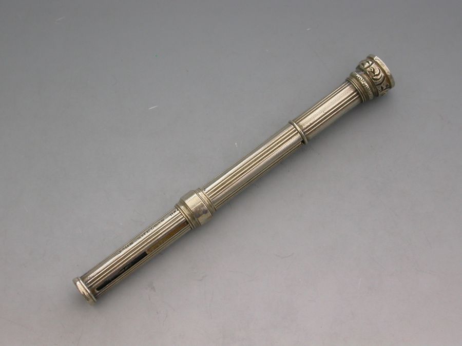 A rare Victorian German silver Patent Paragon Letter and Coin Balance & Pencil & Pen Case, with reeded decoration to the body. The Paragon Letter and Coin Balance comprises at one end, a slide out steel pen holder and a propelling pencil. At the opposite end is a plain seal terminal which pulls off to reveal the letter and coin balance which is graduated 1D to 4D.