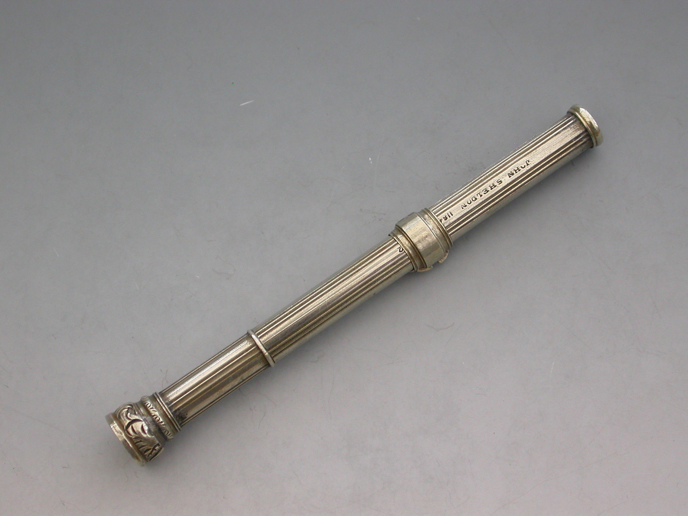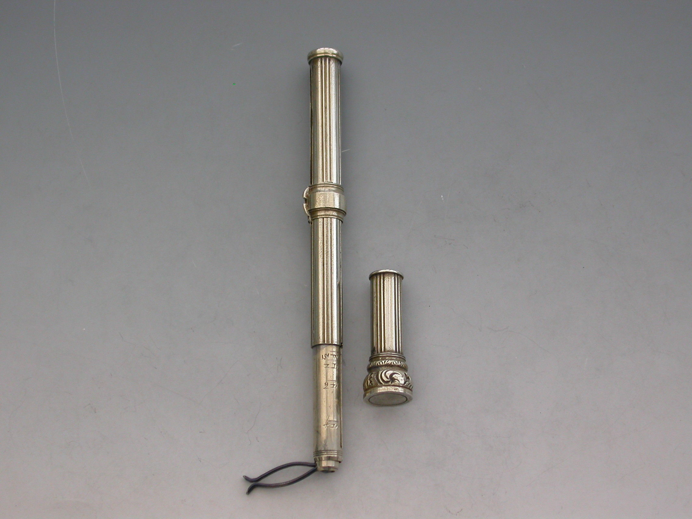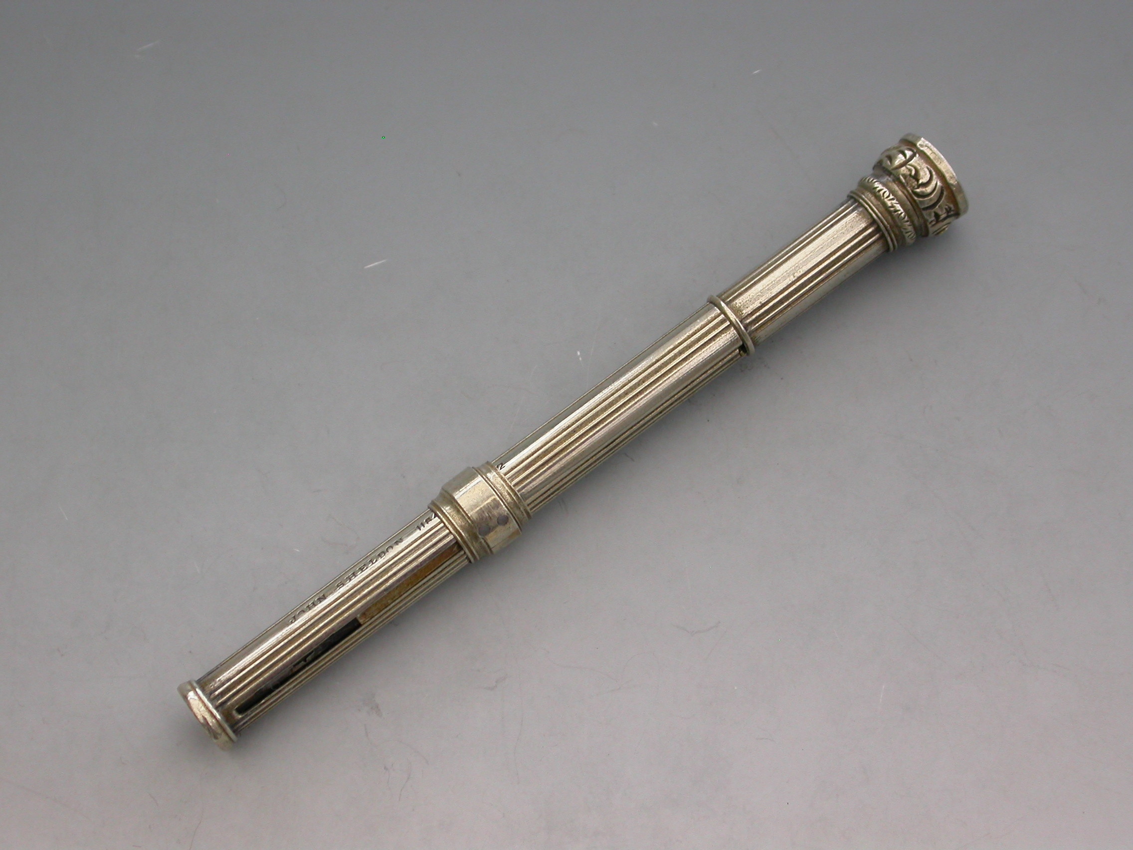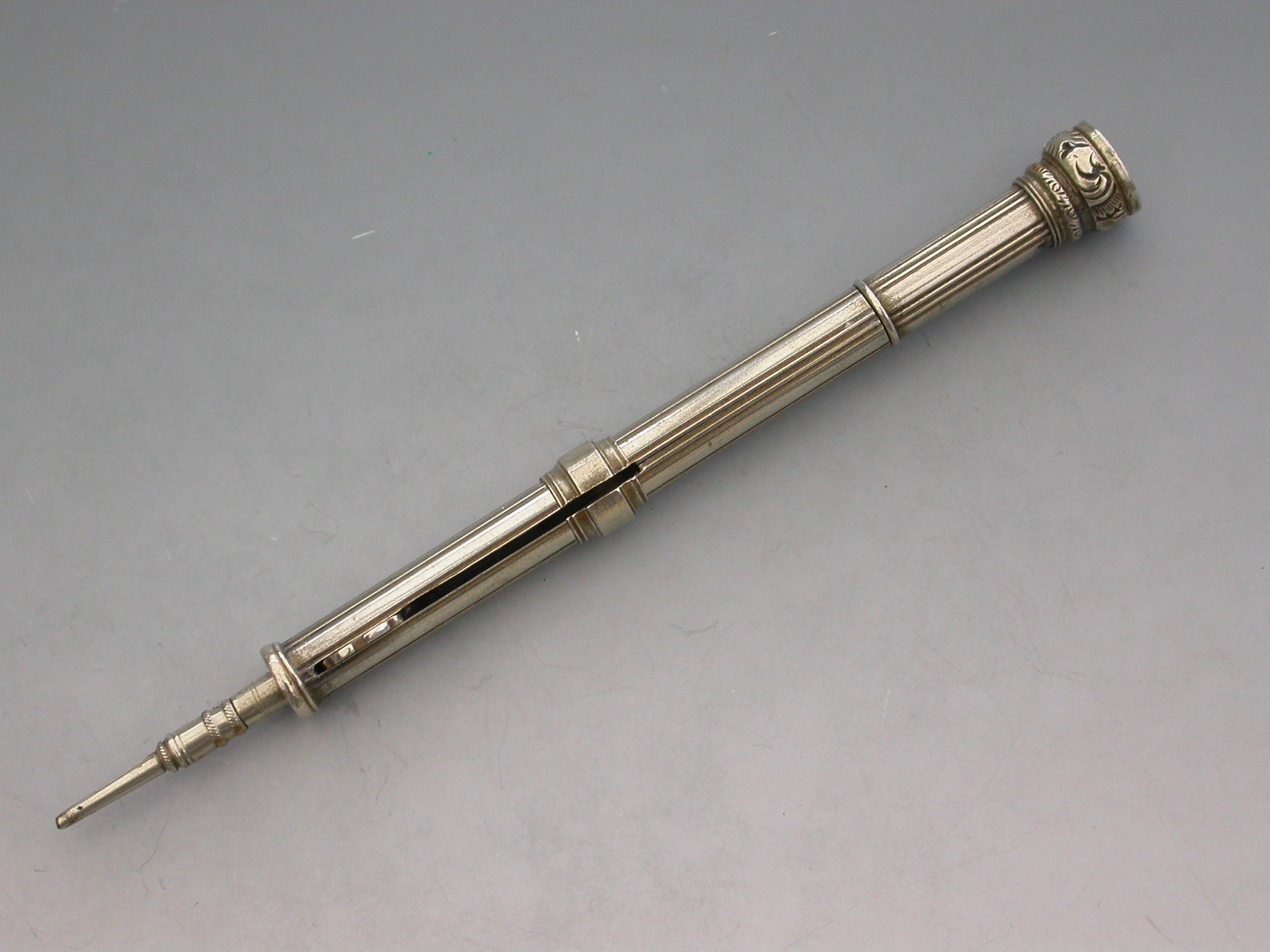 A rare Victorian German silver Patent Paragon Letter and Coin Balance & Pencil & Pen Case, with reeded decoration to the body. The Paragon Letter and Coin Balance comprises at one end, a slide out steel pen holder and a propelling pencil. At the opposite end is a plain seal terminal which pulls off to reveal the letter and coin balance which is graduated 1D to 4D.