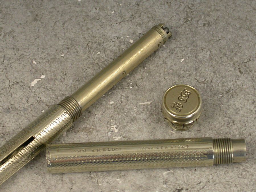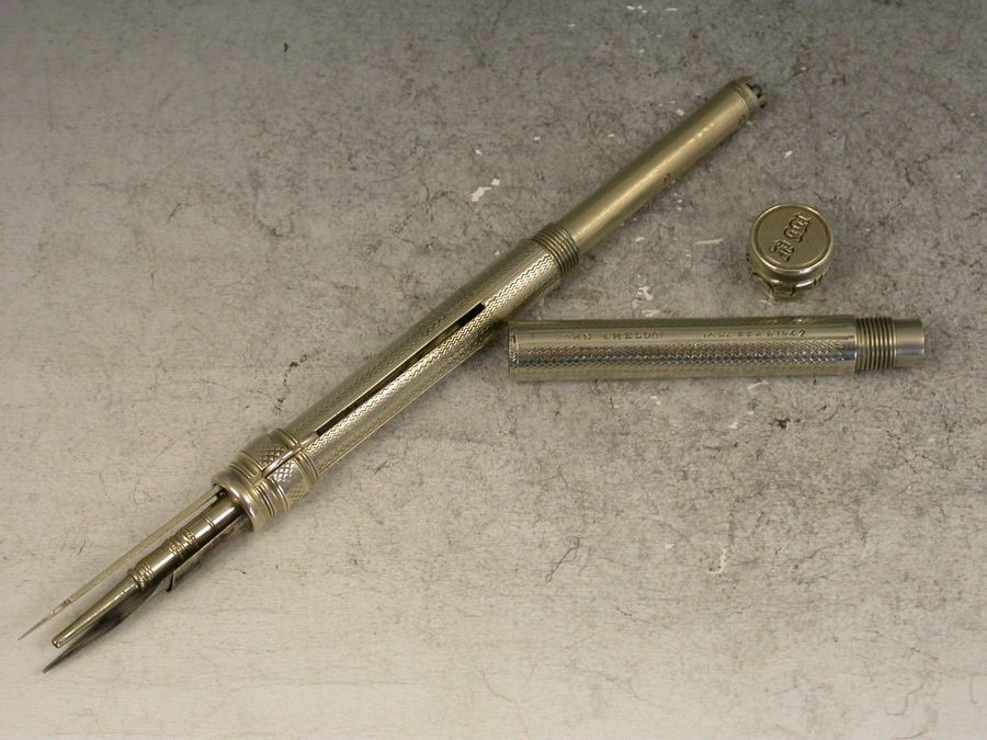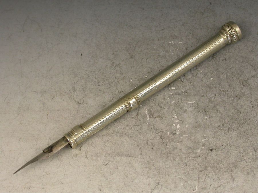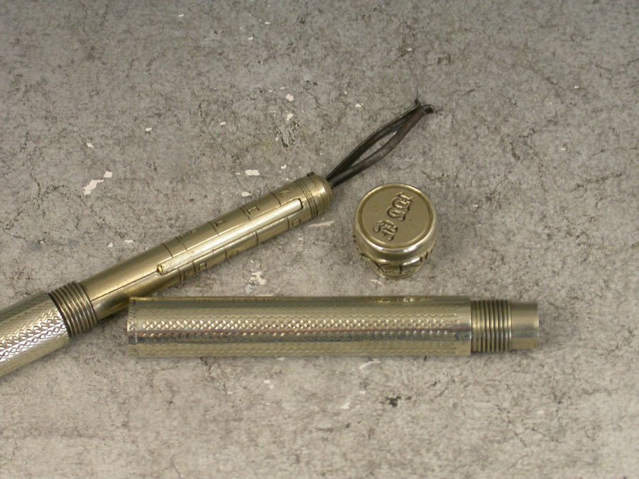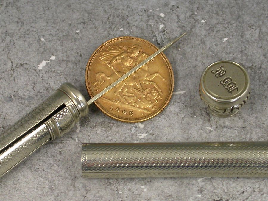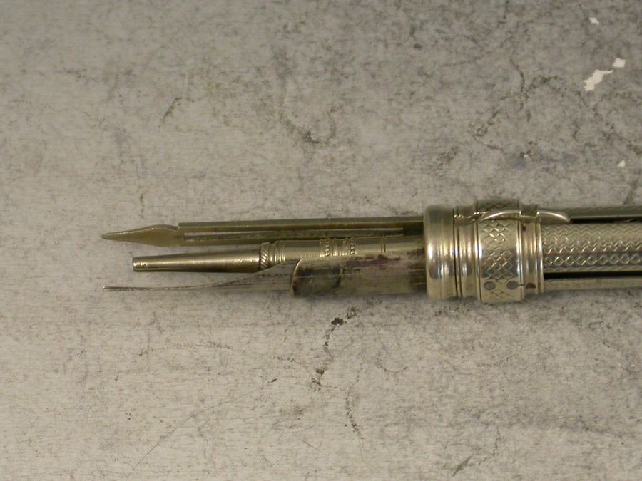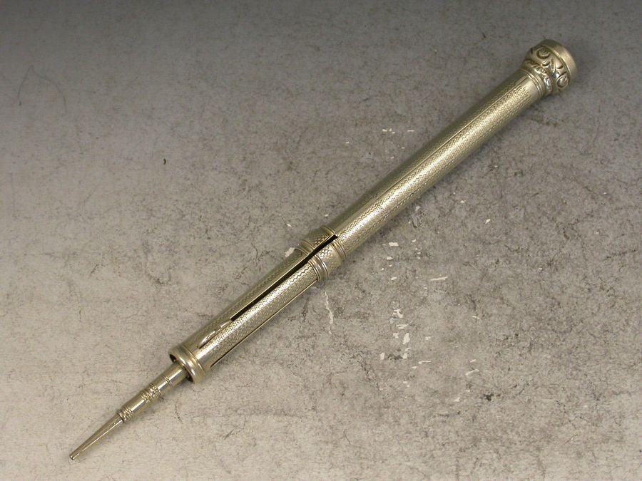 A rare Victorian German silver Patent ""Unique Pocket Companion"" with engine turned decoration to the body. The pocket companion comprises at one end, a slide out steel pen holder, a pencil and toothpick combined with a half sovereign gauge. At the opposite end the plain seal terminal is engraved with initials and unscrews to reveal a lead reservoir. The case also unscrews at the centre to reveal the letter and coin balance which is graduated 1D to 4D and 1/2 ounce to 2 ounce.