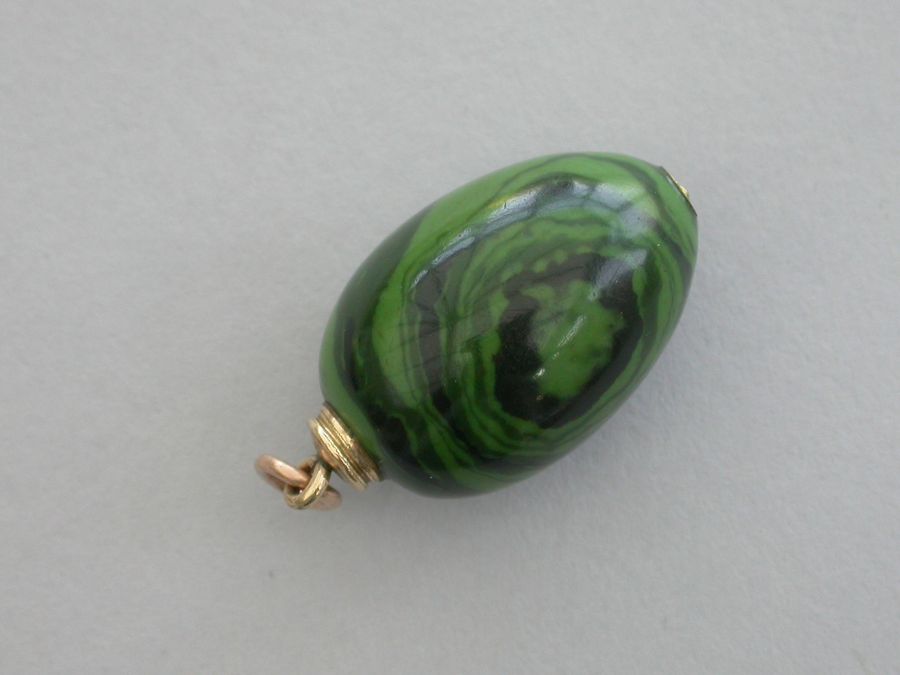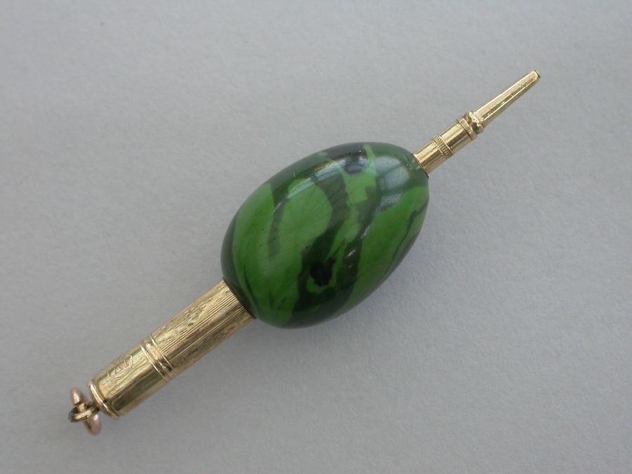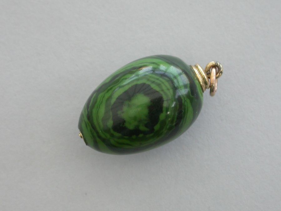An unusual Victorian novelty gold Propelling Pencil, the egg shaped body made from polished Malachite. The engraved gold barrel stamped with a diamond registration mark for June 26th 1877. Attached suspension ring.