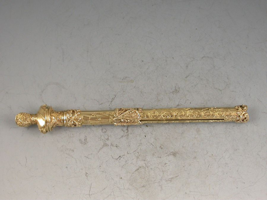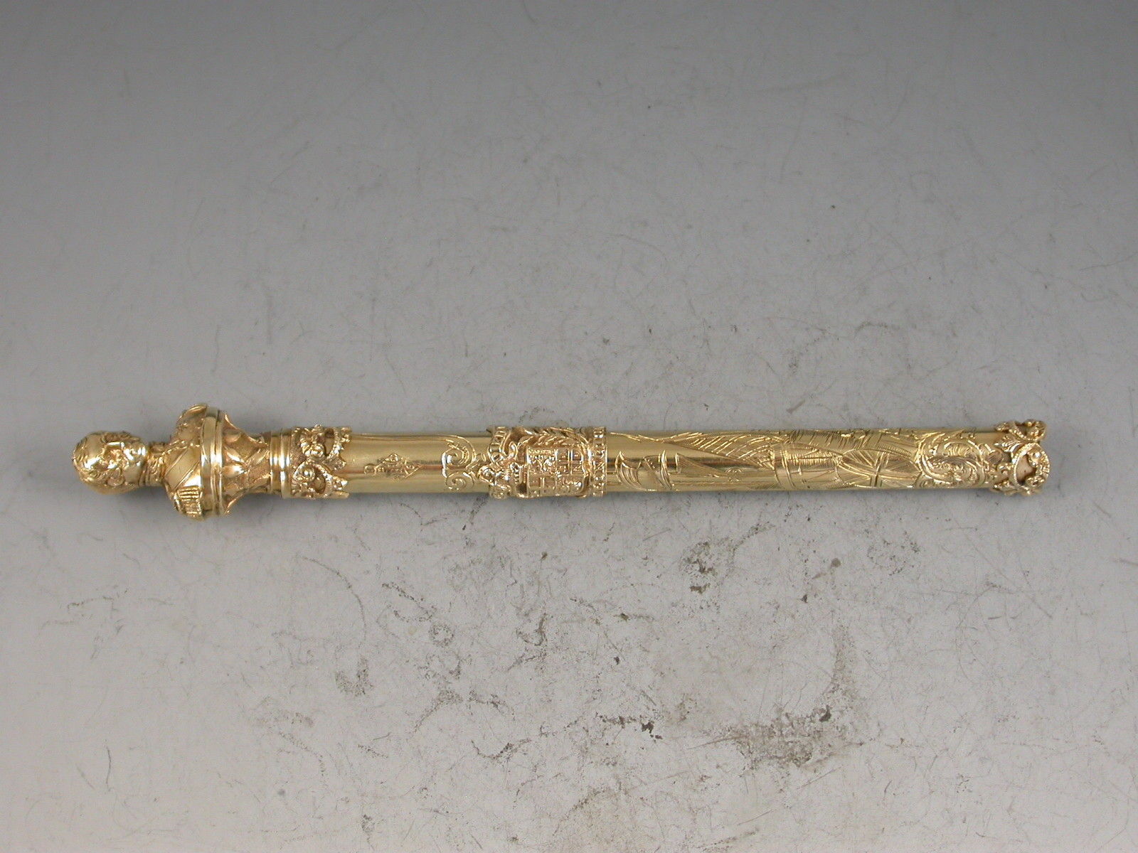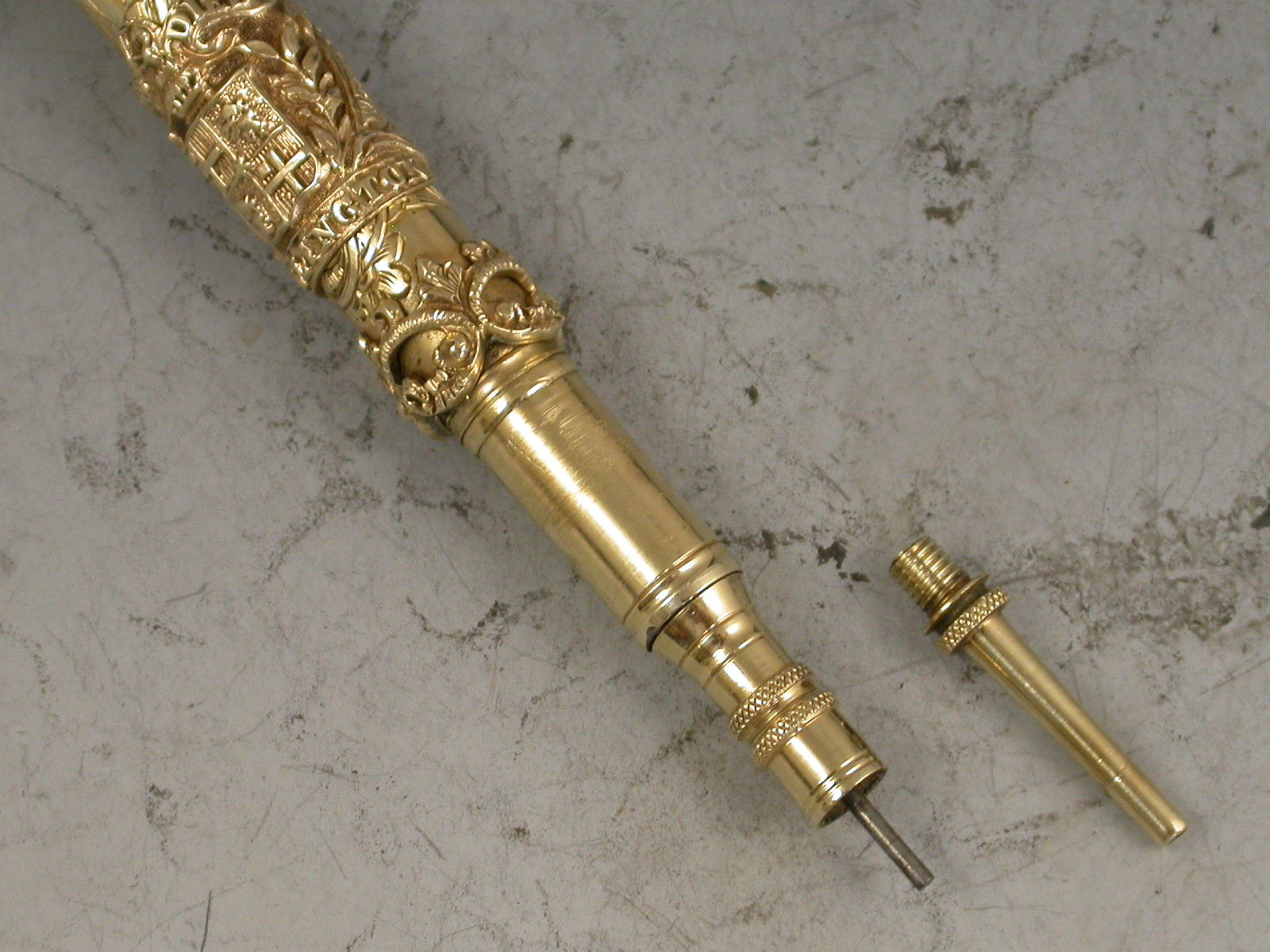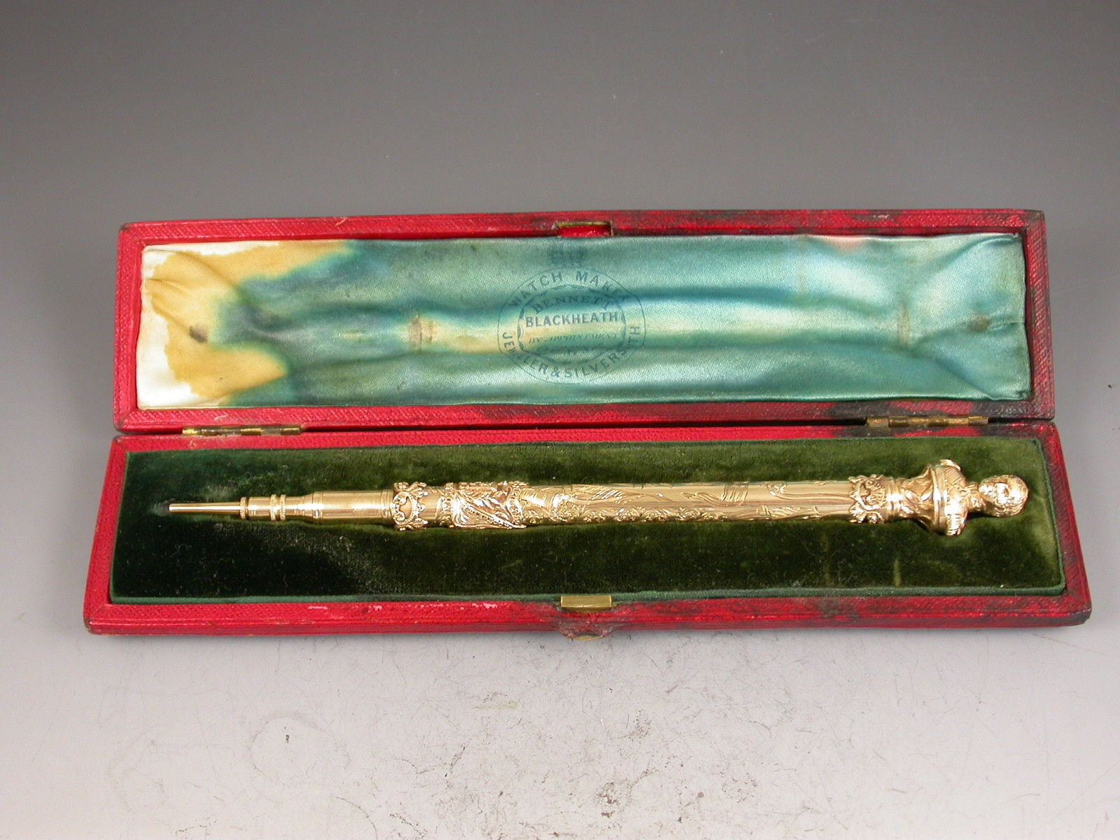 A very fine quality and rare mid Victorian gold filled Propelling Pencil made to commemorate the death of The Duke of Wellington in 1852. The barrel with intricate engraving including flags, spears and drums etc, with raised applied foliate bands, the slider ring chased with the coat of arms of Wellington, the dates 1769 - 1852 and his two most famous battles - Assaye & Waterloo. The screw off terminal revealing a rifled lead reservoir and formed as a bust of The Duke.