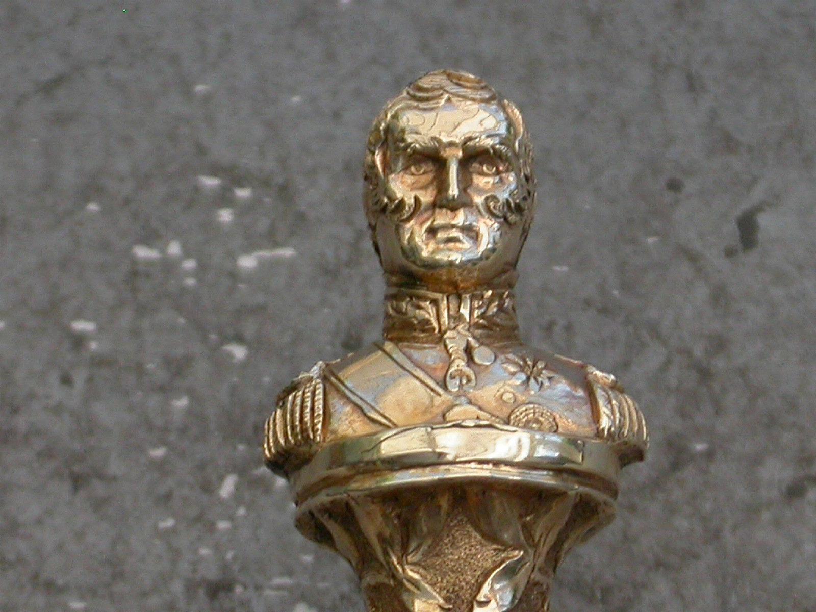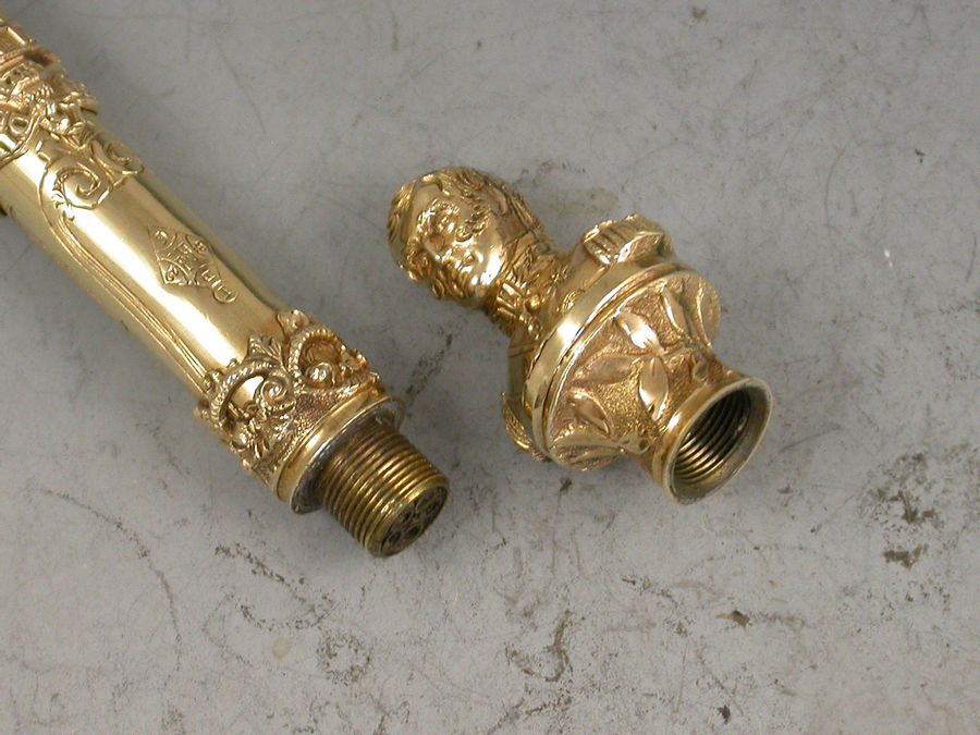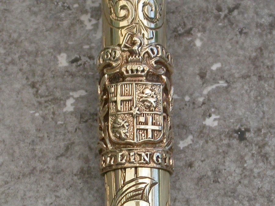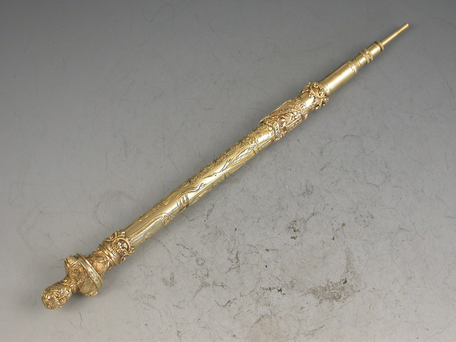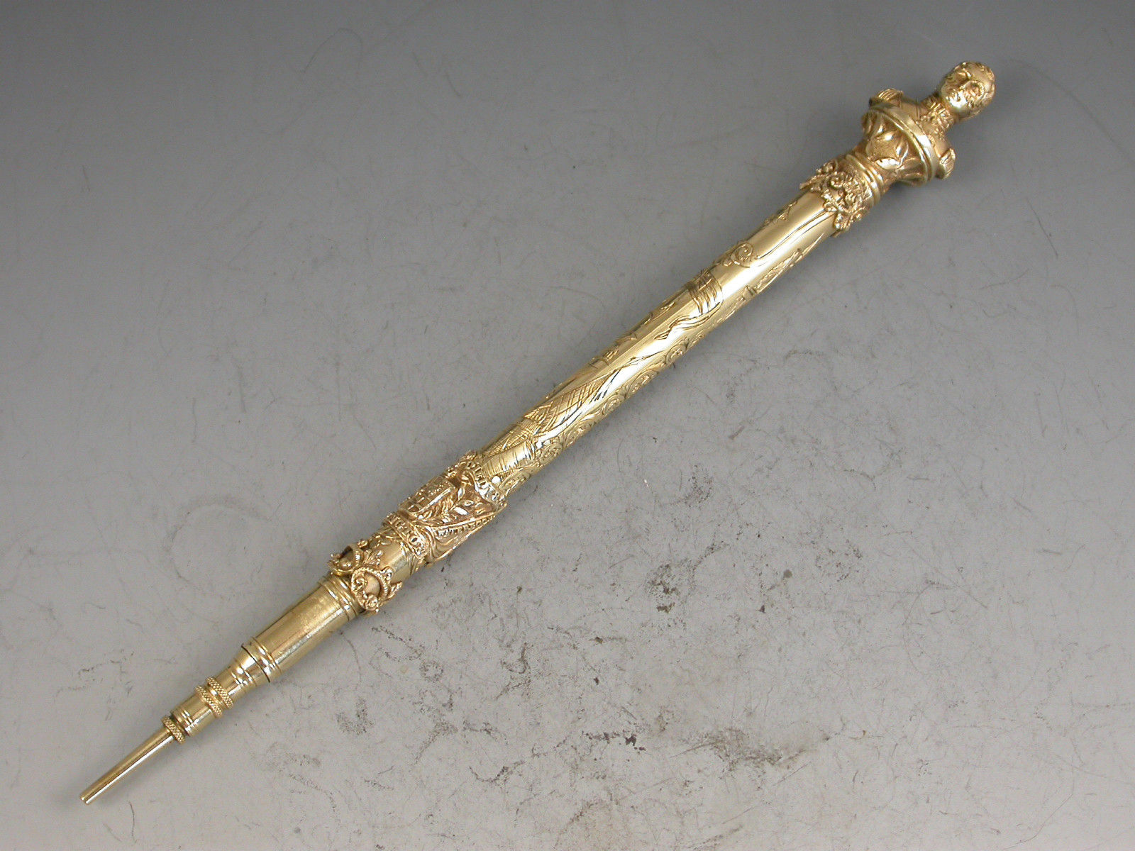 A very fine quality and rare mid Victorian gold filled Propelling Pencil made to commemorate the death of The Duke of Wellington in 1852. The barrel with intricate engraving including flags, spears and drums etc, with raised applied foliate bands, the slider ring chased with the coat of arms of Wellington, the dates 1769 - 1852 and his two most famous battles - Assaye & Waterloo. The screw off terminal revealing a rifled lead reservoir and formed as a bust of The Duke.