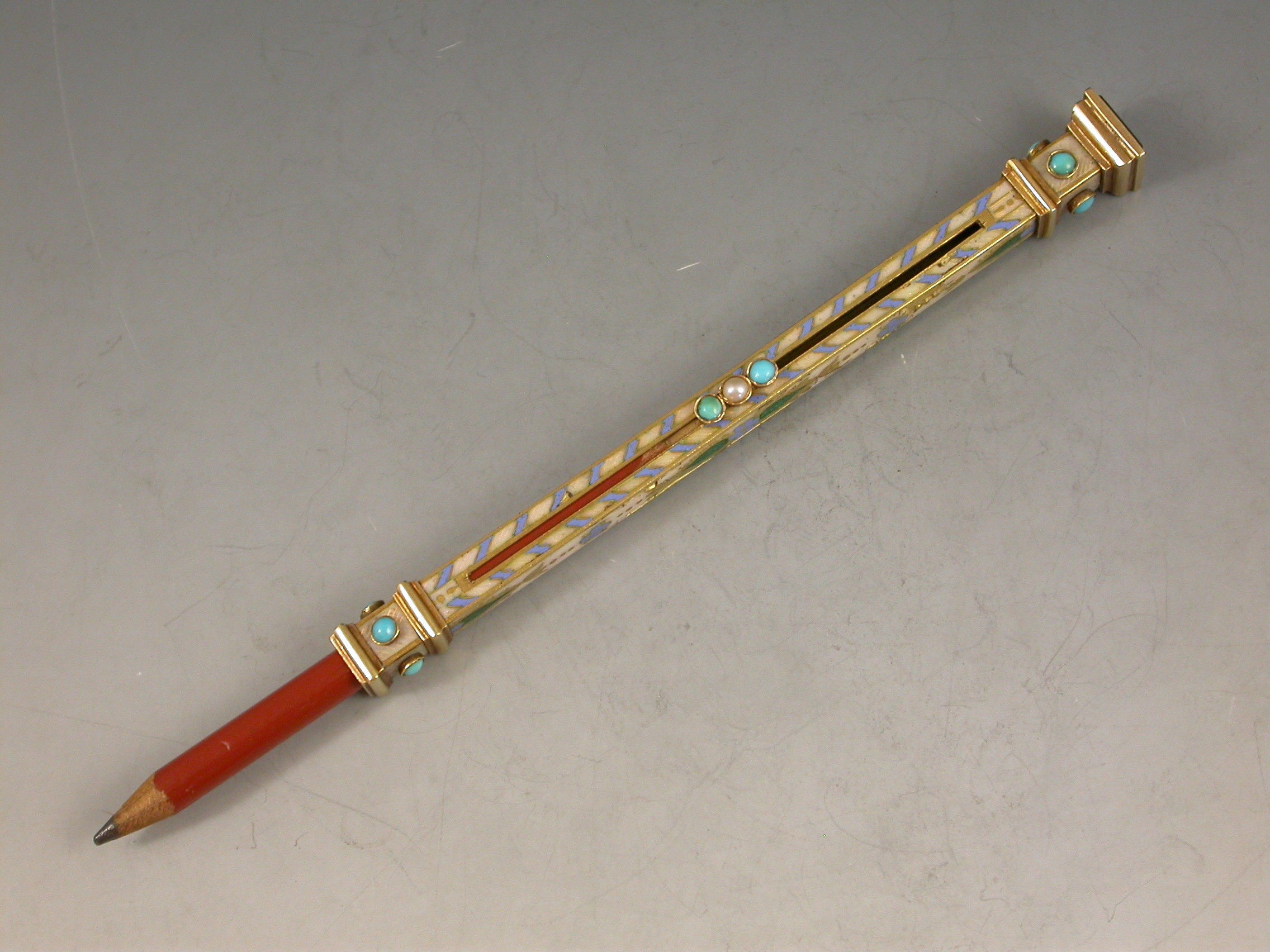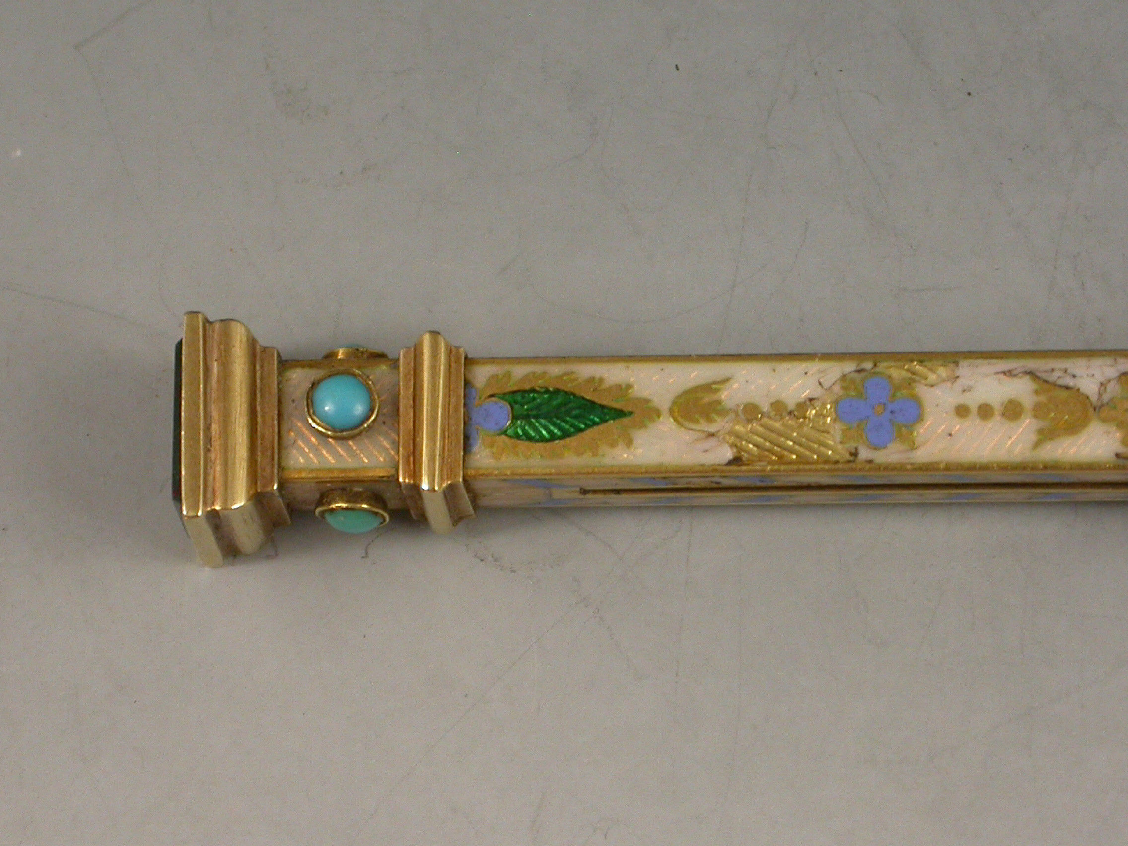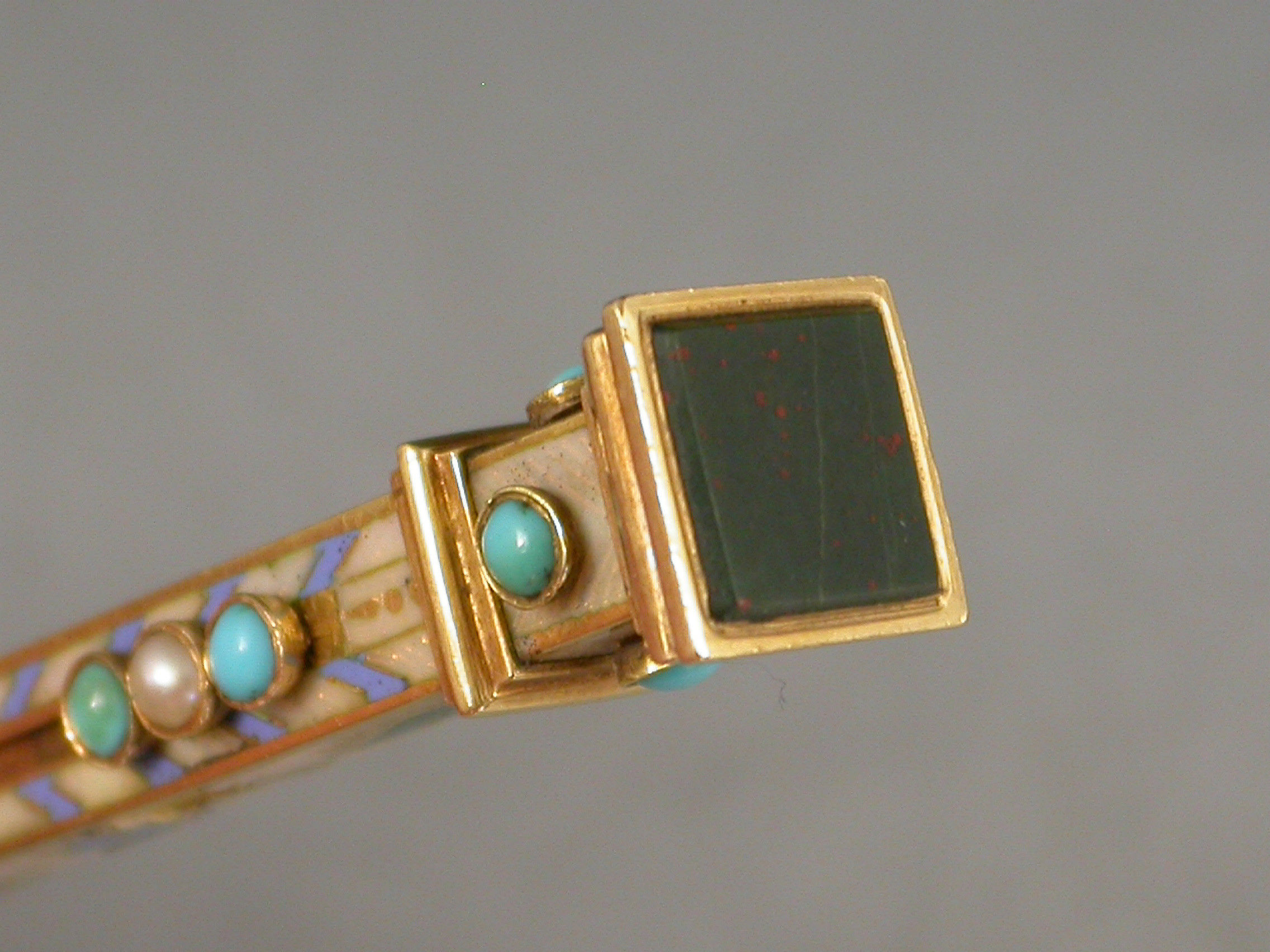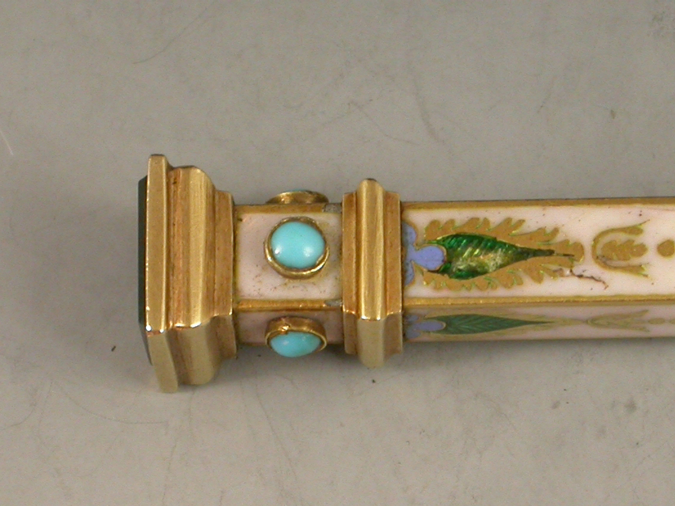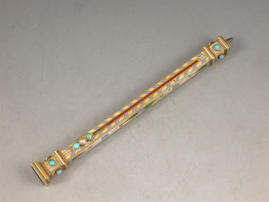 A fine quality mid 19th century gold and enamel Sliding Pencil, the terminals and slider button set with turquoise and pearl, a plain blood stone seal finial, the body enamelled with white, green and sky blue enamels highlighted in gold.