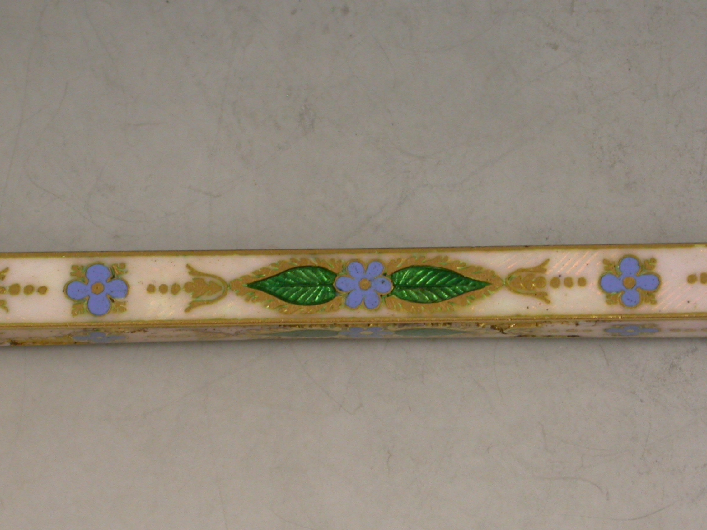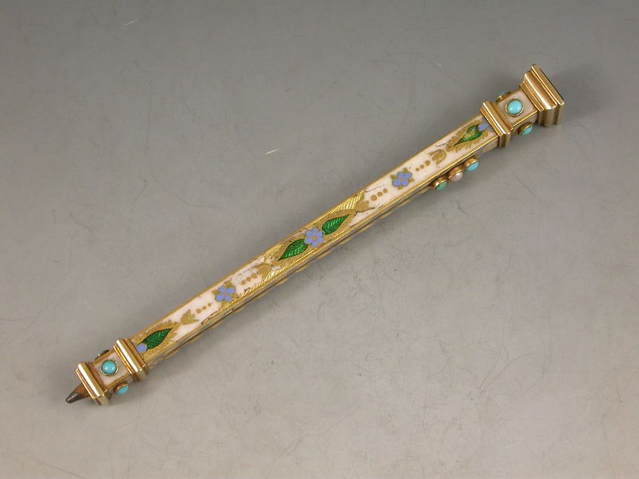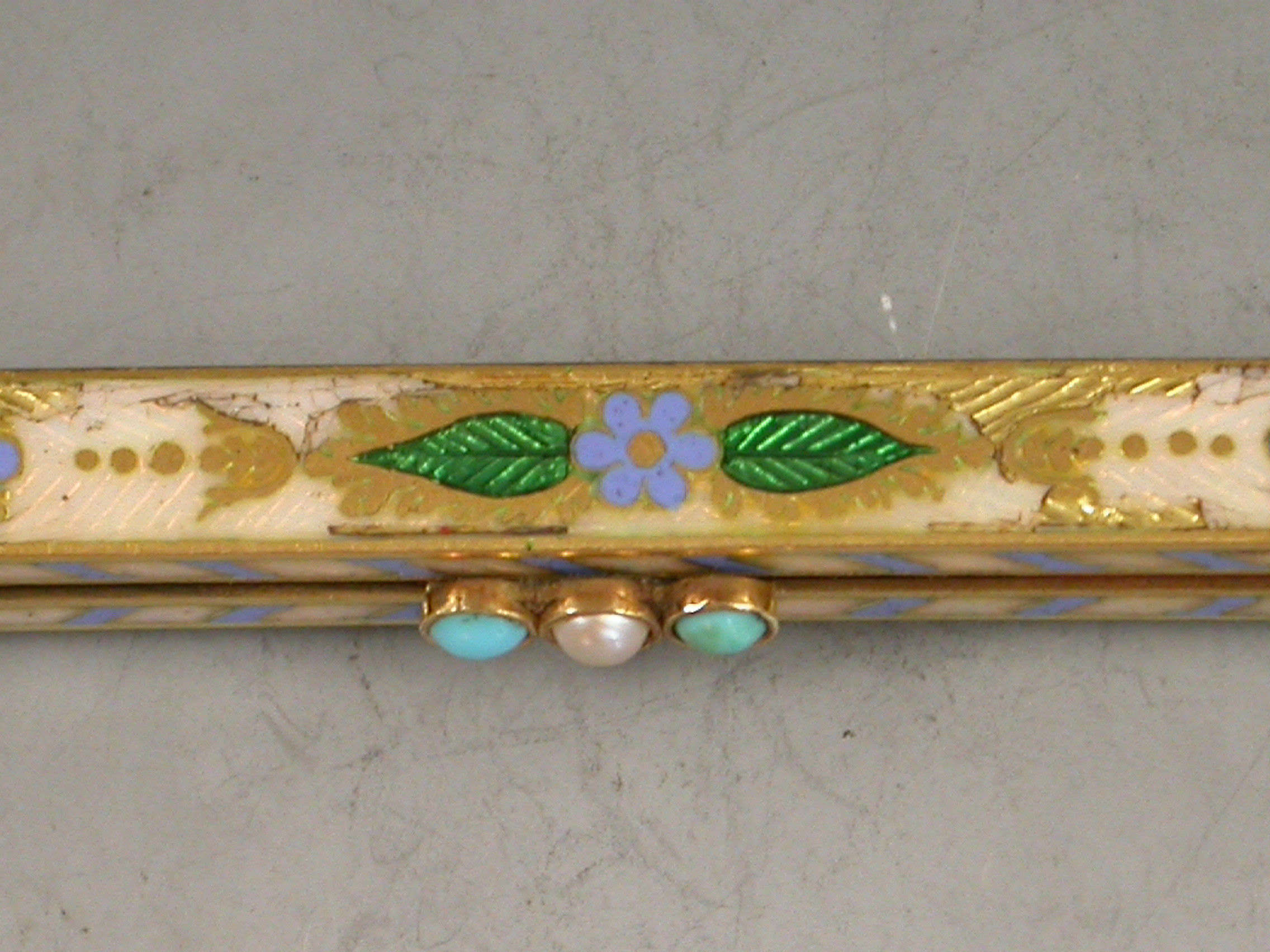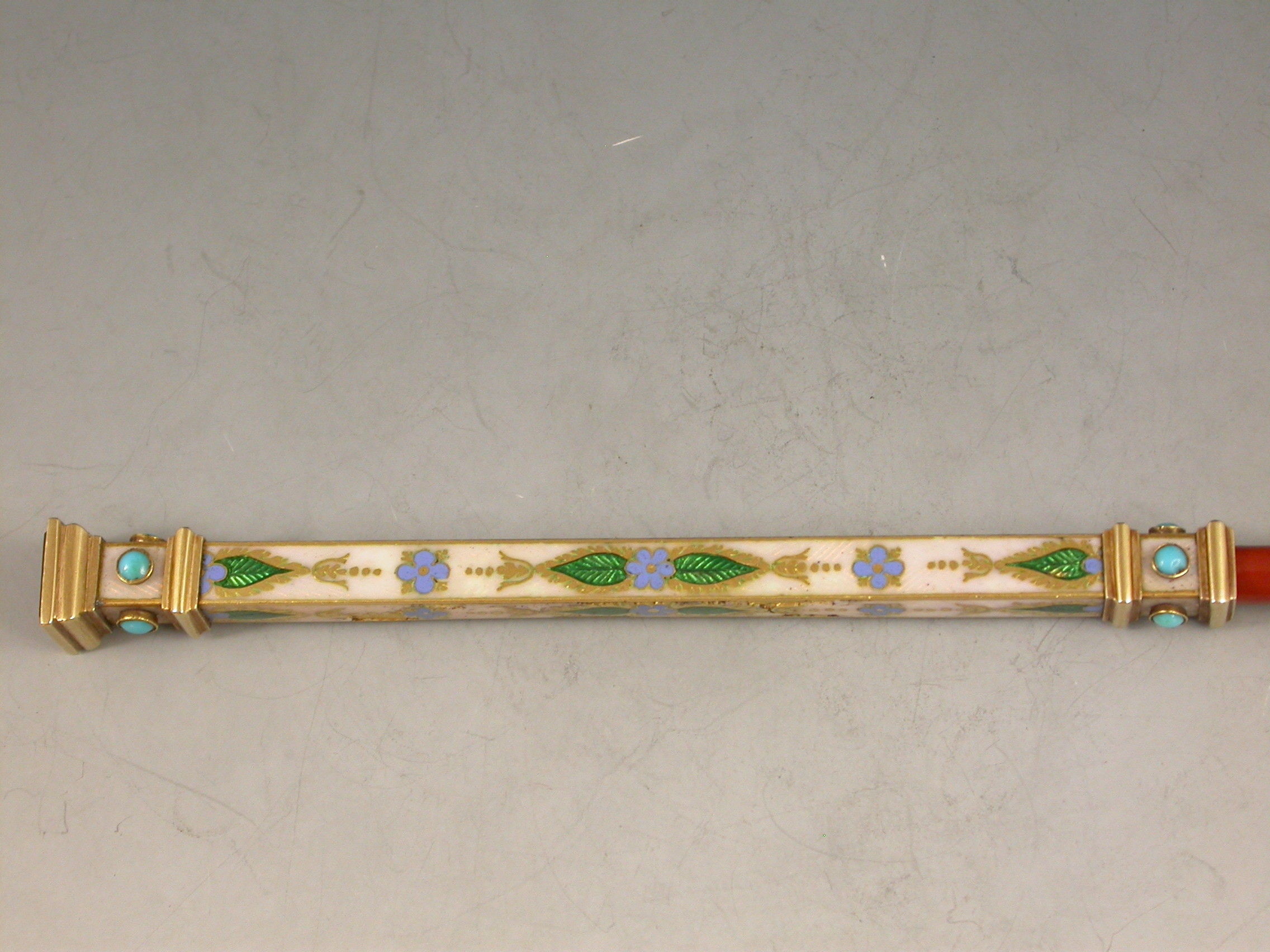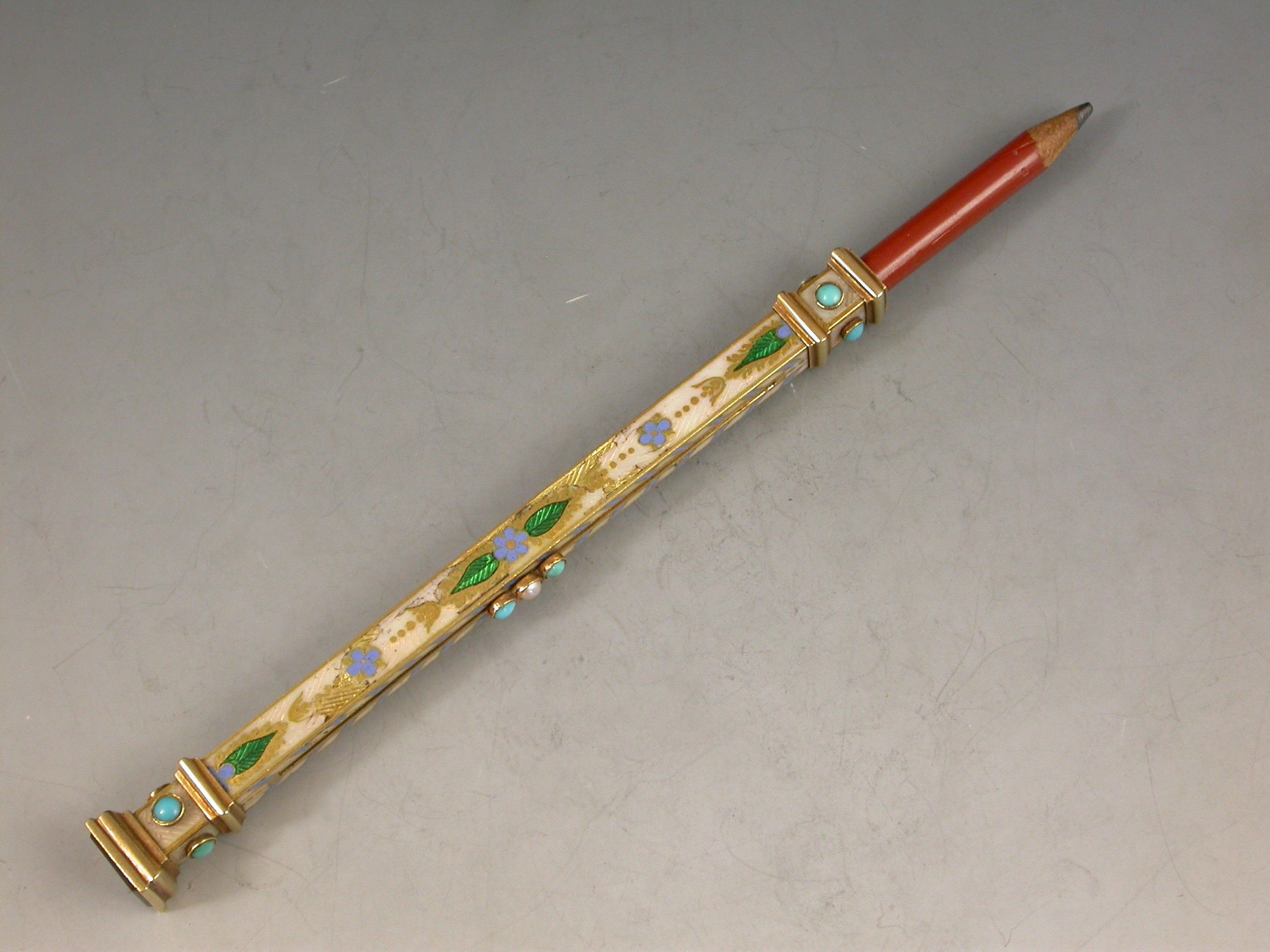 A fine quality mid 19th century gold and enamel Sliding Pencil, the terminals and slider button set with turquoise and pearl, a plain blood stone seal finial, the body enamelled with white, green and sky blue enamels highlighted in gold.