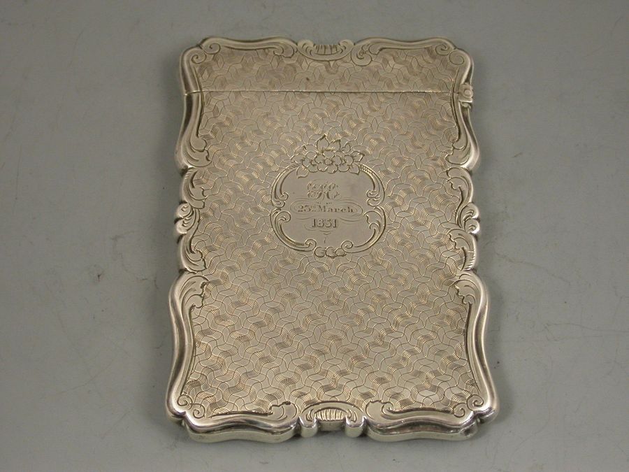 A fine Victorian silver Card Case of shaped rectangular form, the body engraved with an unusual cross hatched pattern and a depiction of Crystal Palace in a shaped cartouche with a rayed background. A souvenir from the Great Exhibition in 1851. The reverse with contemporary inscription.