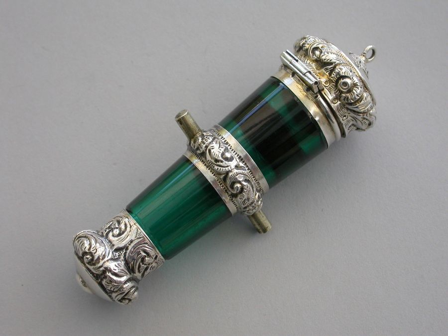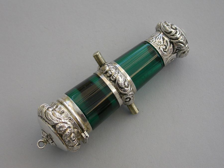 Victorian Green Glass Cannon Form Combined Scent Bottle & Vinaigrette