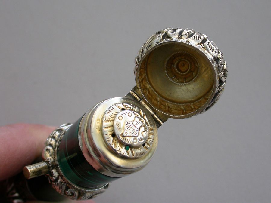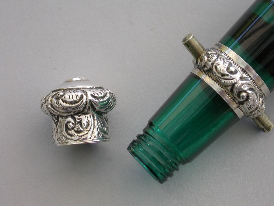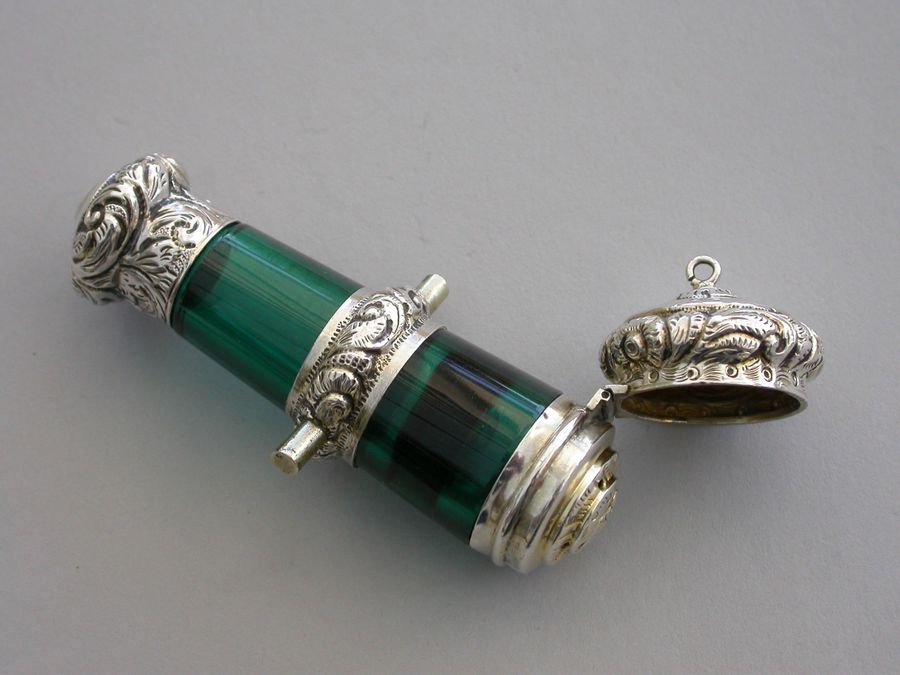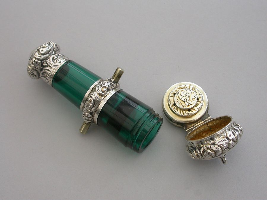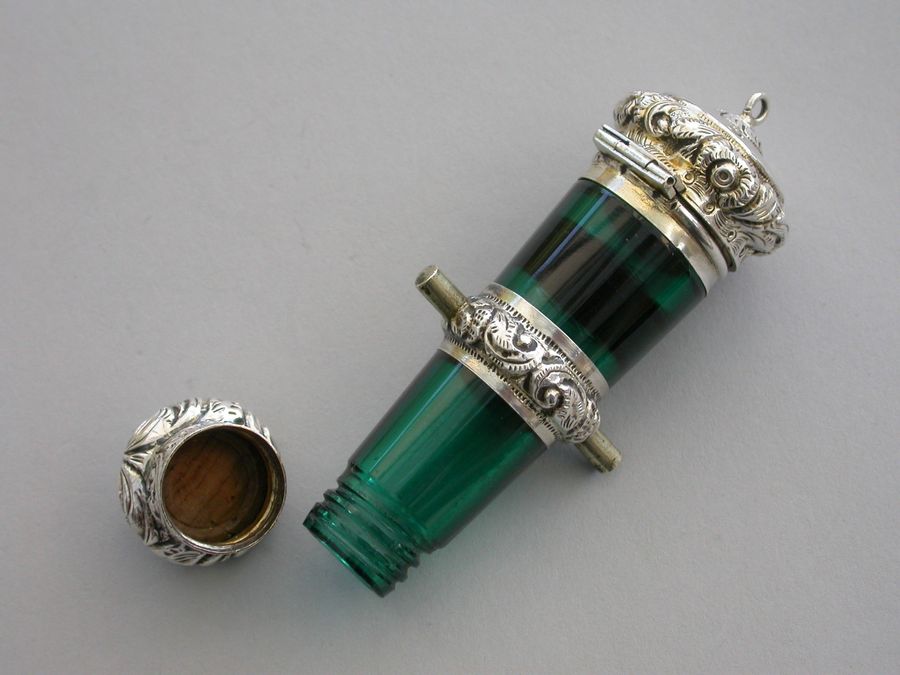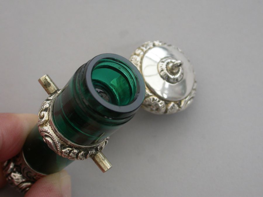 A rare Victorian silver mounted green glass combined Scent Bottle and Vinaigrette, made in the form of a Cannon, with repousse silver tops, the one forming a hinged cover to the vinaigrette and opening to reveal a silver gilt grille stamped with a diamond registration mark for the 7th January 1880. The other the screw on lid of the scent bottle.