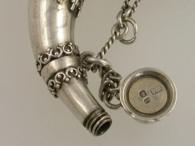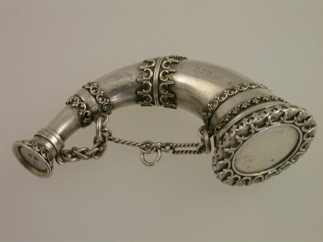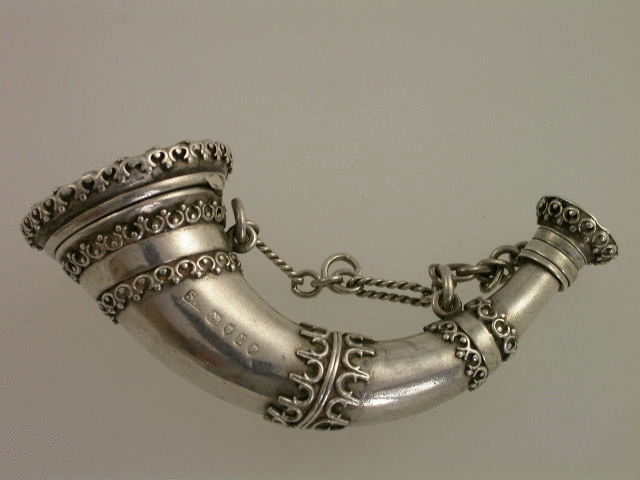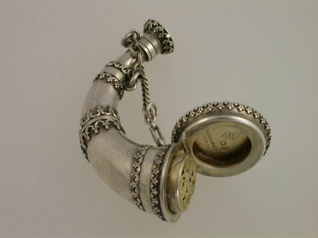 A very fine Victorian silver Vinaigrette in the form of a horn, with applied bands of raised scroll linked decoration, the hinged top opening to reveal a silver gilt interior with pierced hinged grille, screw off base, with attached suspension chains.
