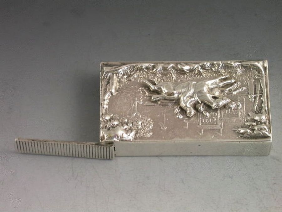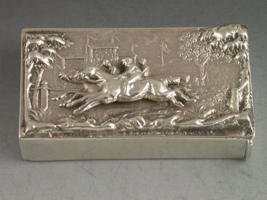 A good Victorian silver Vesta Case with hinged flip top lid and striker, the top with raised scene depicting three horses and jockeys racing past a grandstand. The base with later engraved inscription.