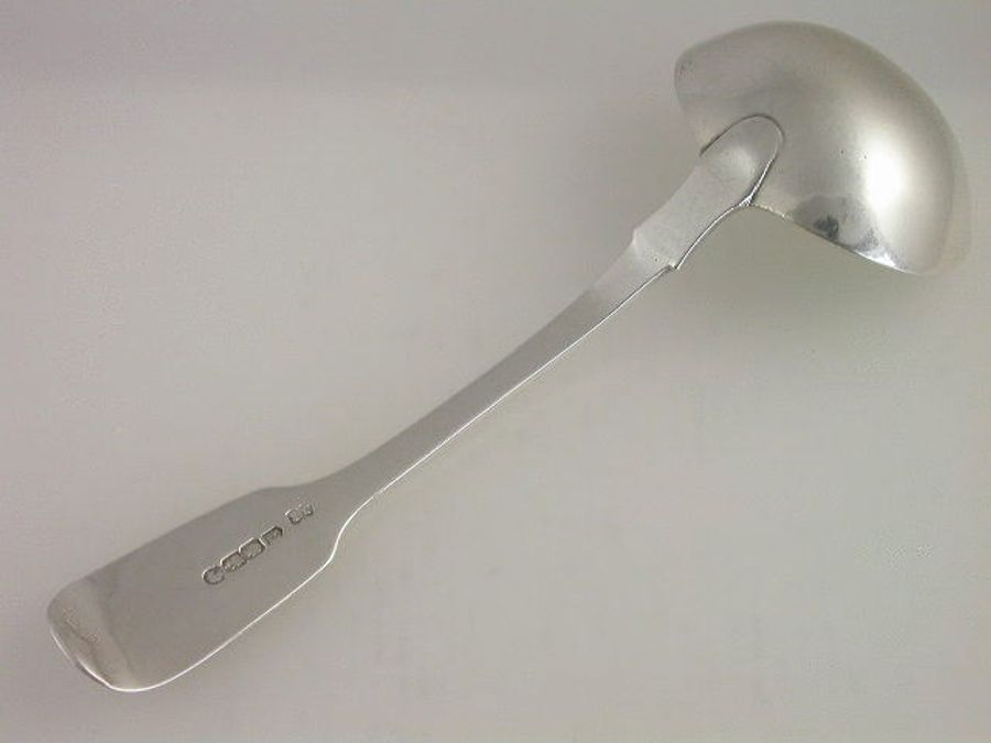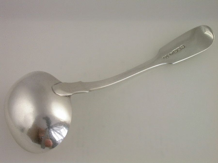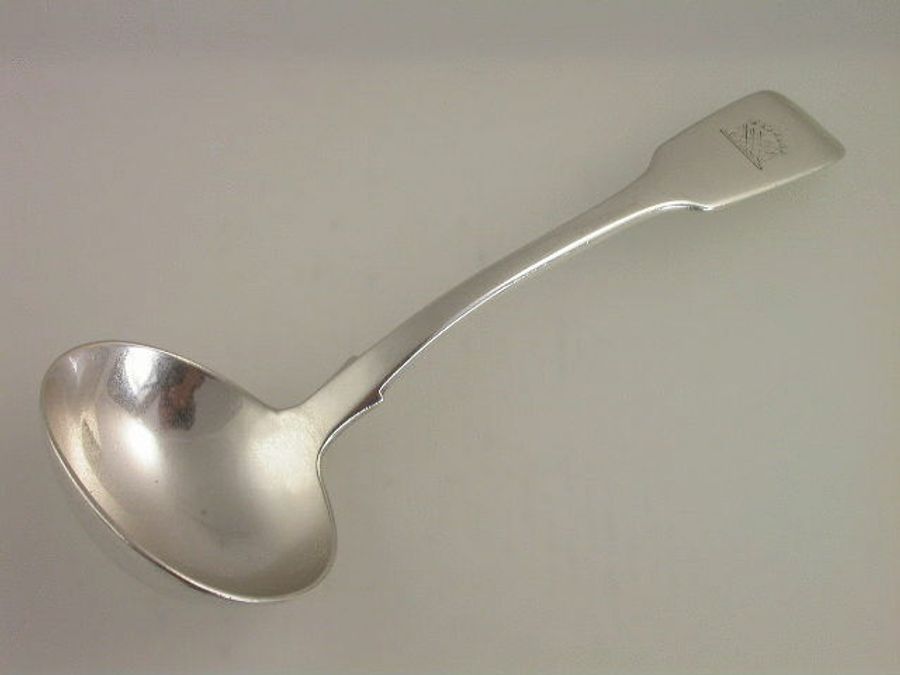A good Victorian Irish silver Sauce Ladle of plain fiddle pattern, the handle engraved with a contemporary crest of crossed arrows in front of foliage.