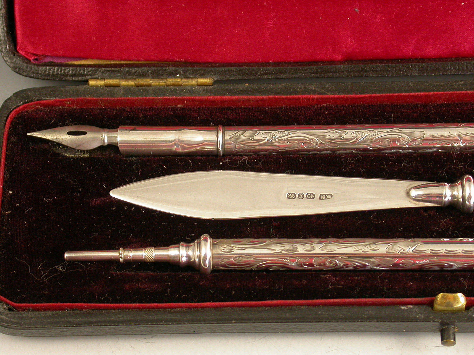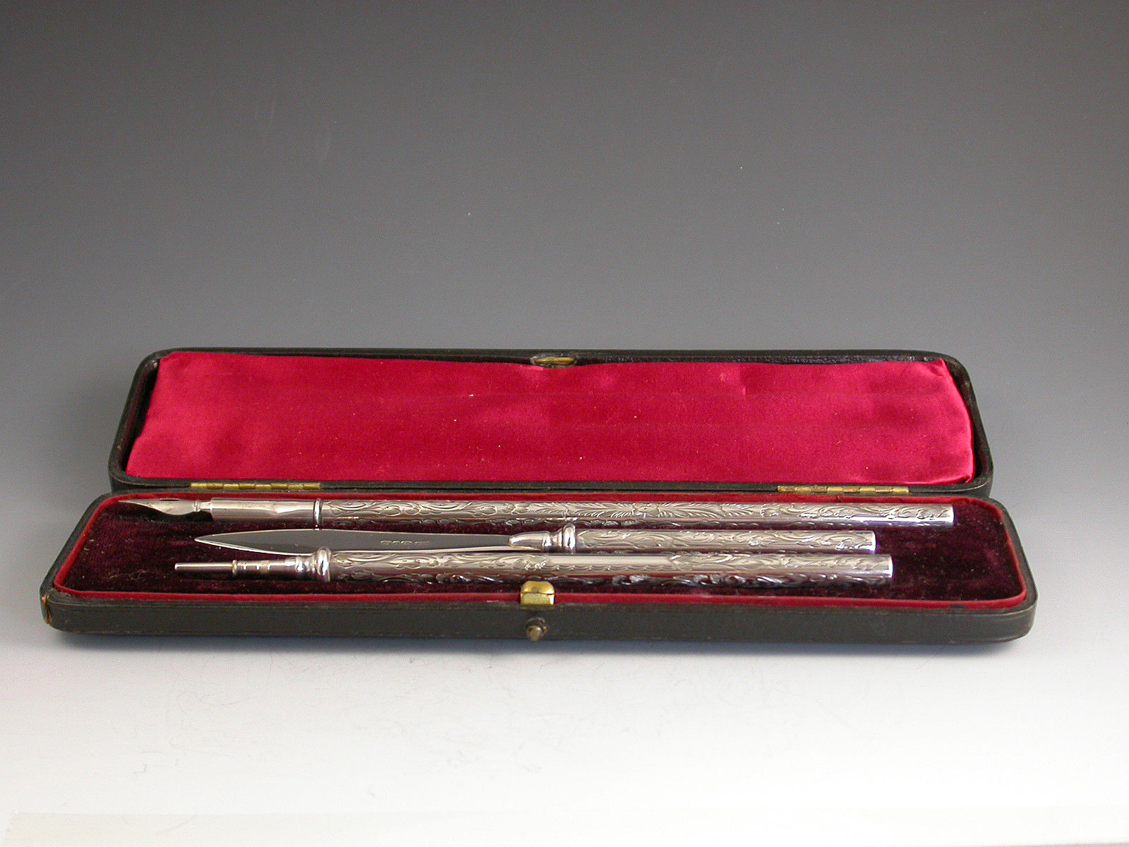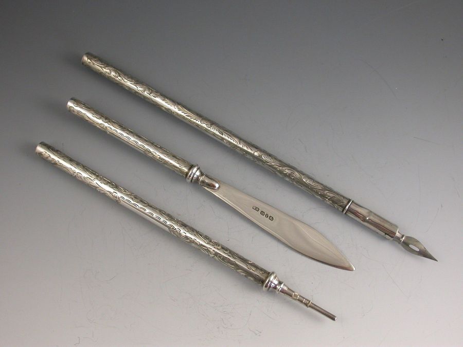 A good quality Victorian silver three piece Writing Set consisting of Dip Pen, Propelling Pencil and Paper Knife, the cylindrical barrels engraved with foliate decoration. Complete with original red silk and velvet lined leather case.